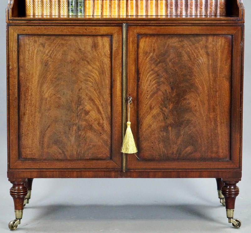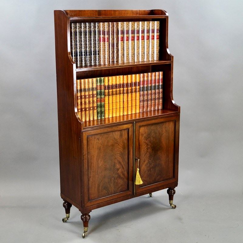 A Fine George III Mahogany Waterfall Bookcase. Raised on turned legs with original brass castors and above, cupboard doors, with flame mahogany panels, enclosing a shelved interior. The top has graduated shelving and the whole is in very good and original condition with a superior colour and waxed patina. 1220mm high, 680mm wide and 270mm deep. English. Circa 1815.