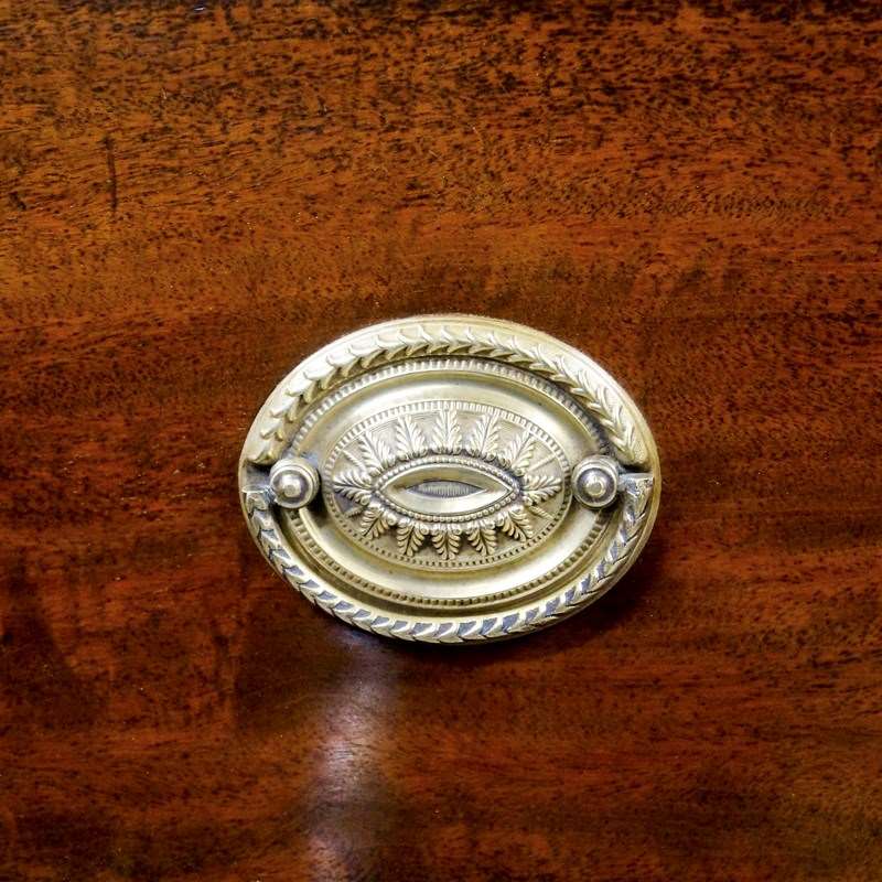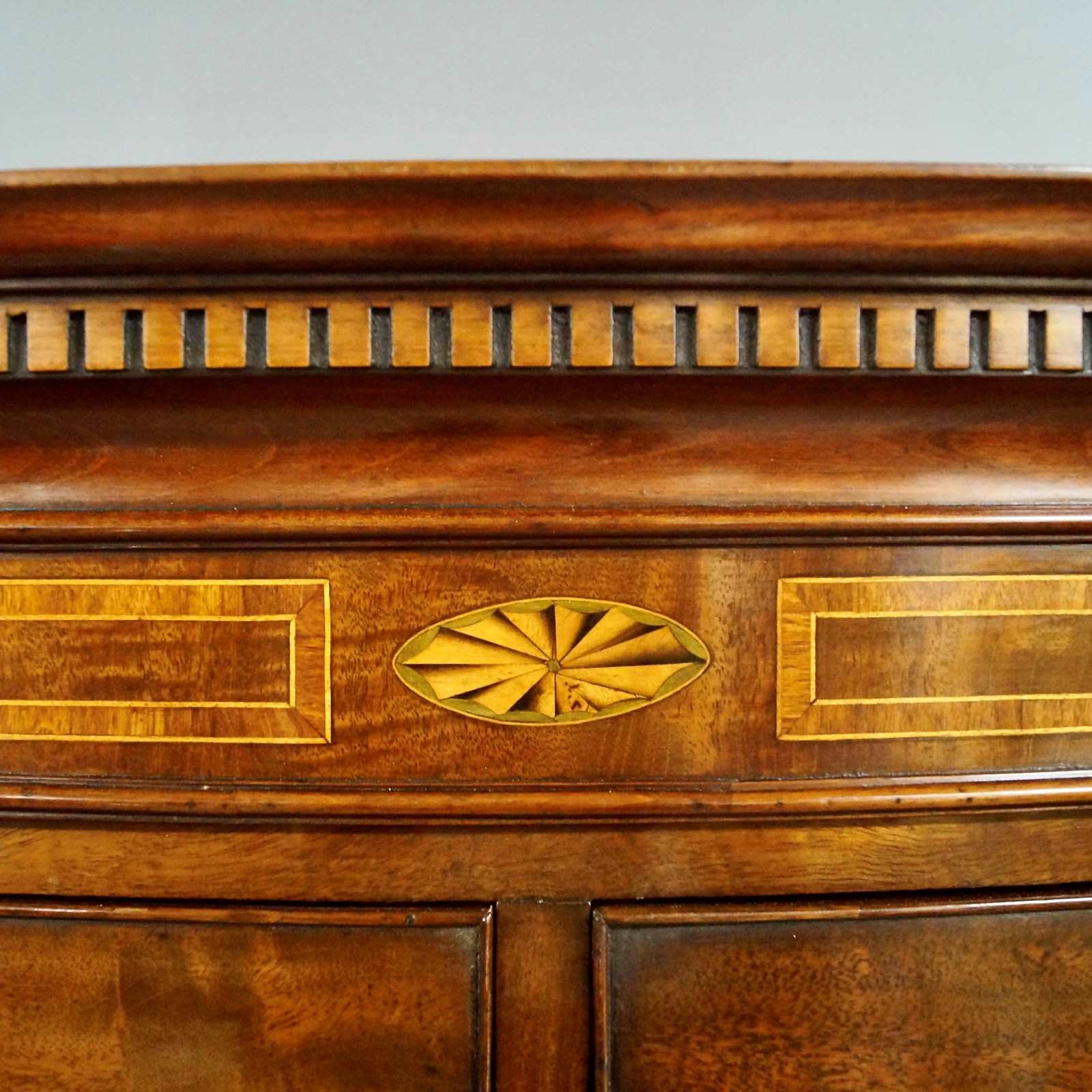 A fine Georgian bow-fronted tallboy. Constructed in quality mahogany, the tallboy stands on elegant splay feet with a shaped apron, above are six long and two short drawers all with working locks and lovely original oval brass handles. Atop is a dental cornice with tulip-wood, boxwood and oval fan inlays. In very good and original condition. 1900mm high, 1180mm wide and 650mm deep. English. Circa 1810.