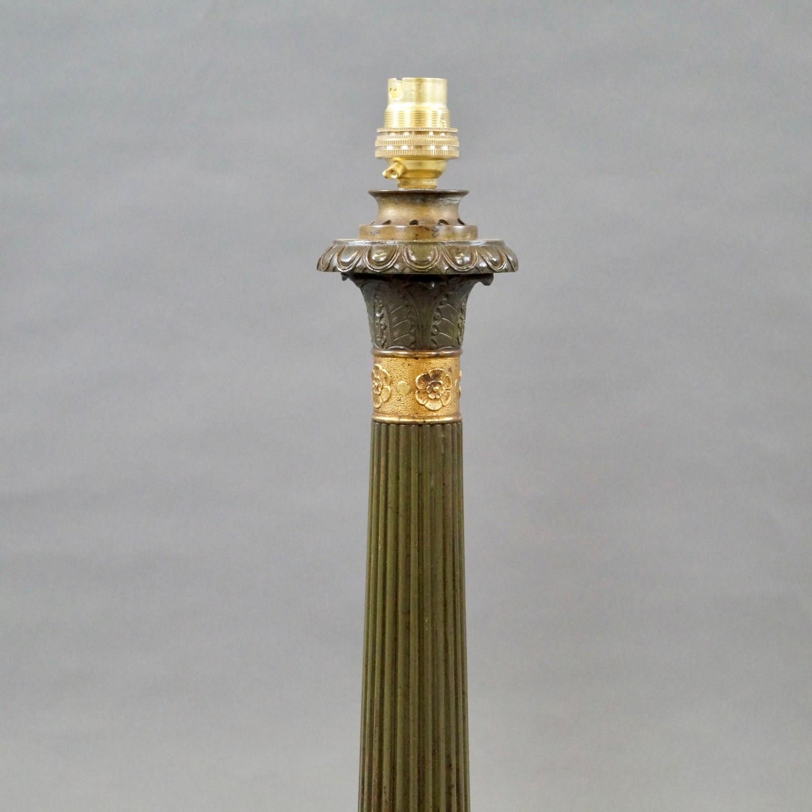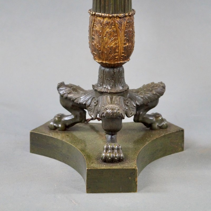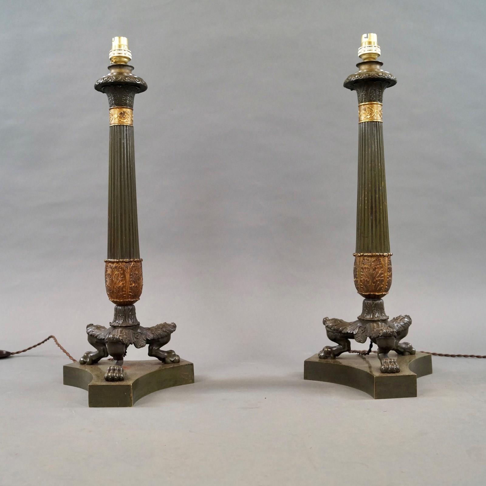 A fine pair of Regency period bronze and ormolu oil lamps converted into table lamps, with reeded stem, with ormolu acanthus leaf collar and raised on lion paw feet standing on concave bases. The lamps are in very good condition and have a patina. 700mm high including the shades and 200mm diameter at the base. English. Circa 1820.