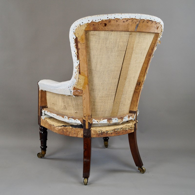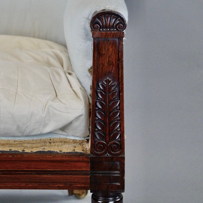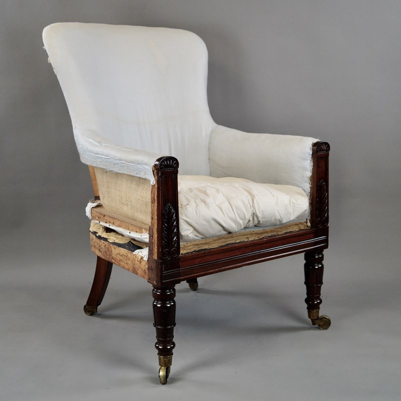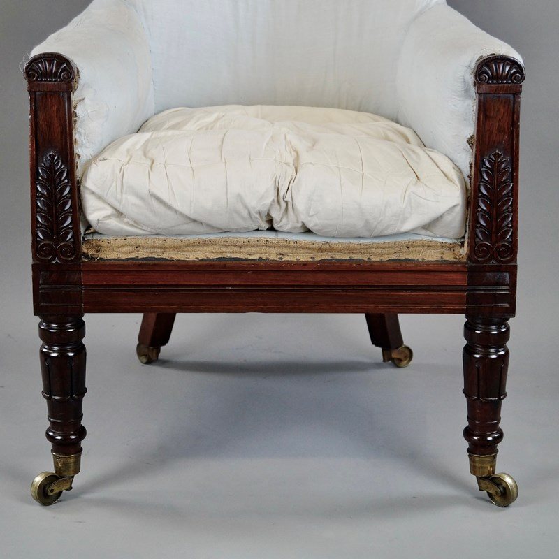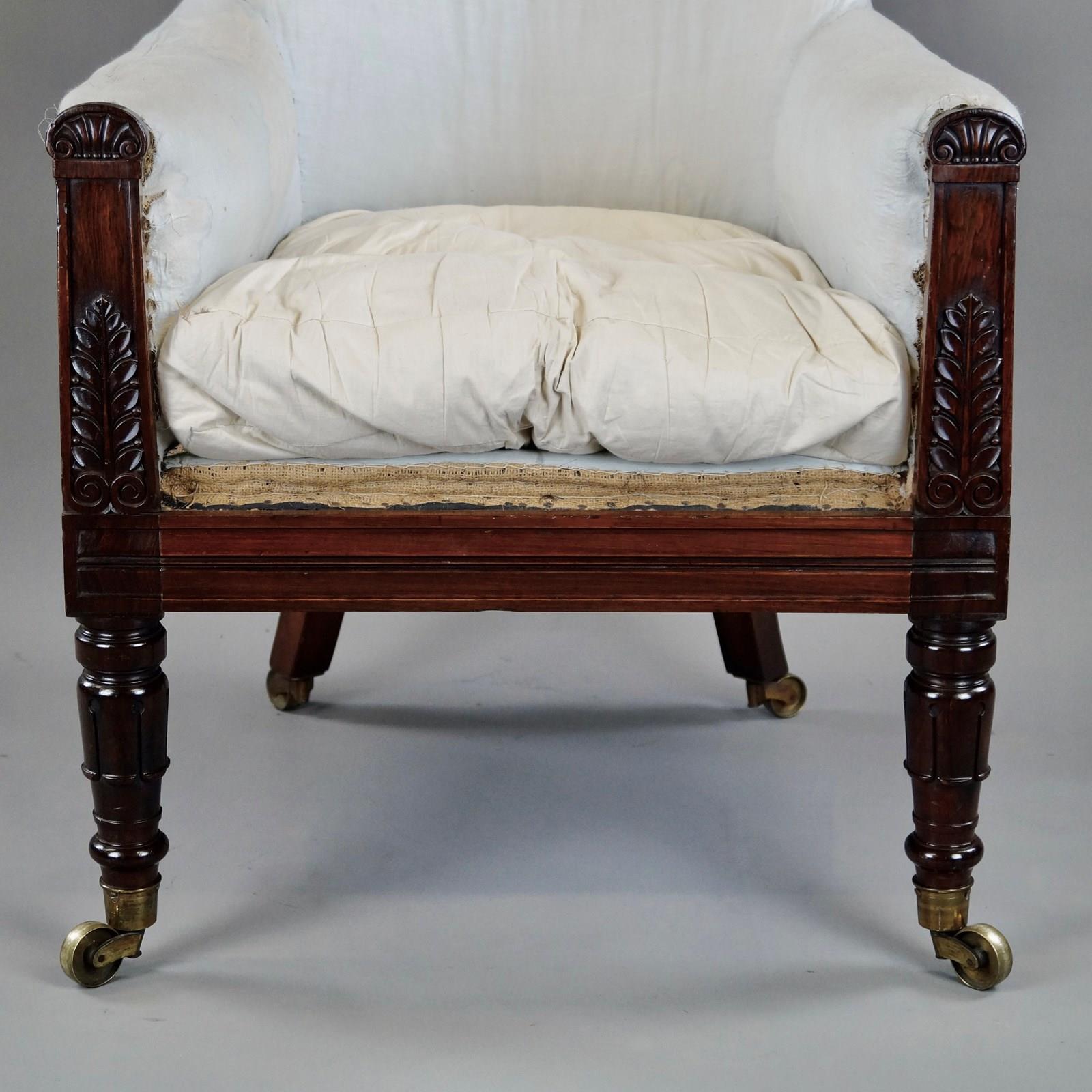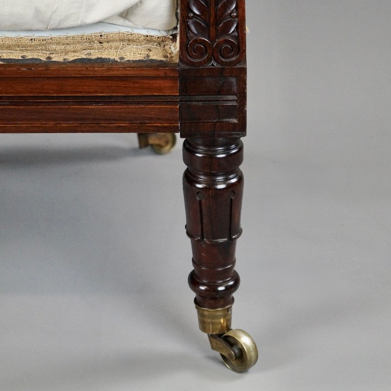 A fine Regency rosewood arm chair. Raised on turned and carved legs with out swept back legs, all with original, gilt lacquered brass castors. Above are very crisply carved arm facings with foliate and scroll motifs. The chair has a beech wood, spoon shaped frame which is well upholstered and has a feather filled cushion, all of which requires recovering. In excellent condition. 1030mm high, 640mm wide, 840mm deep and 460mm seat height. English. Circa 1825.