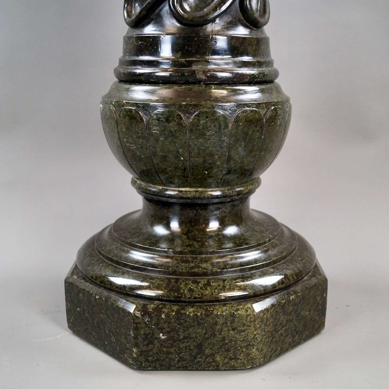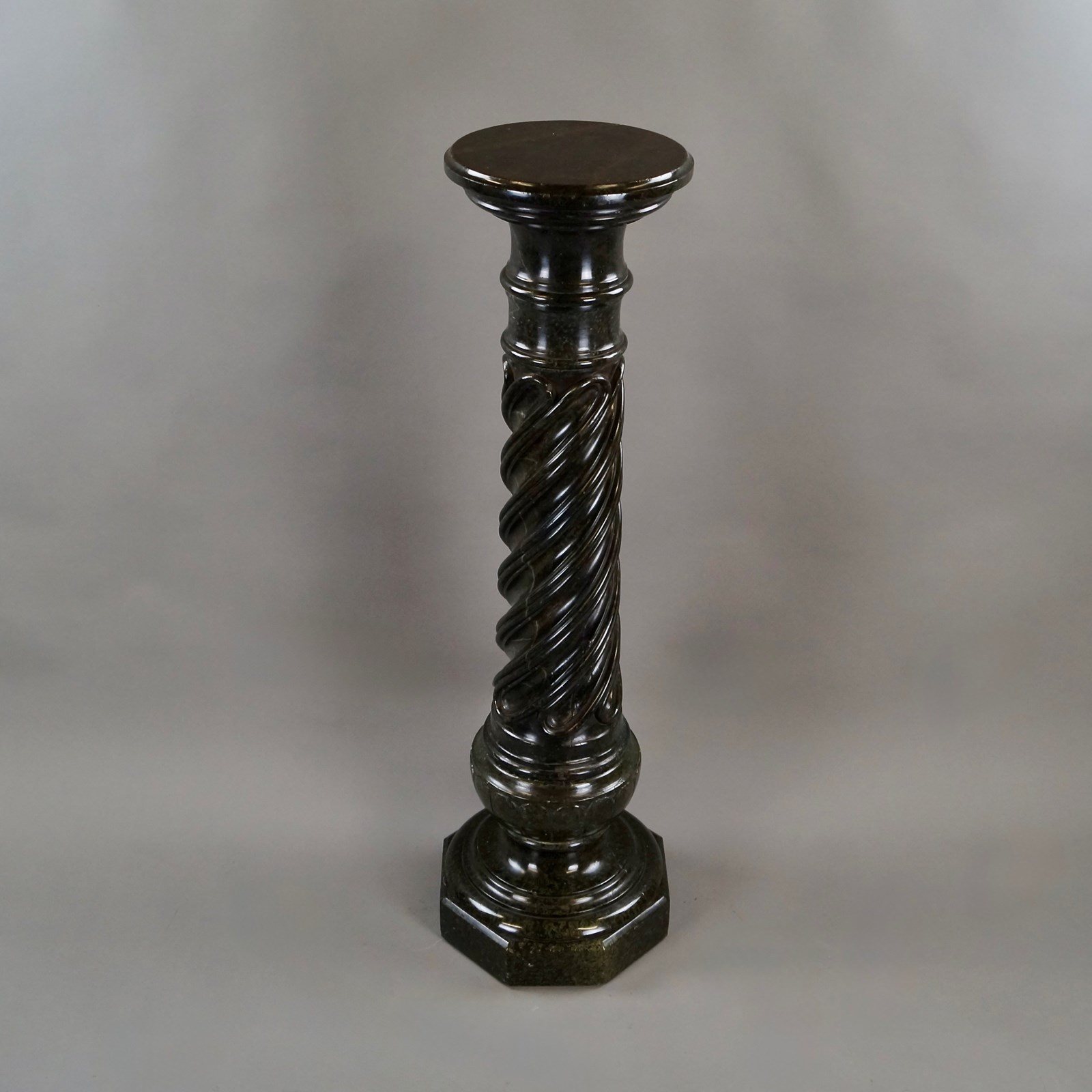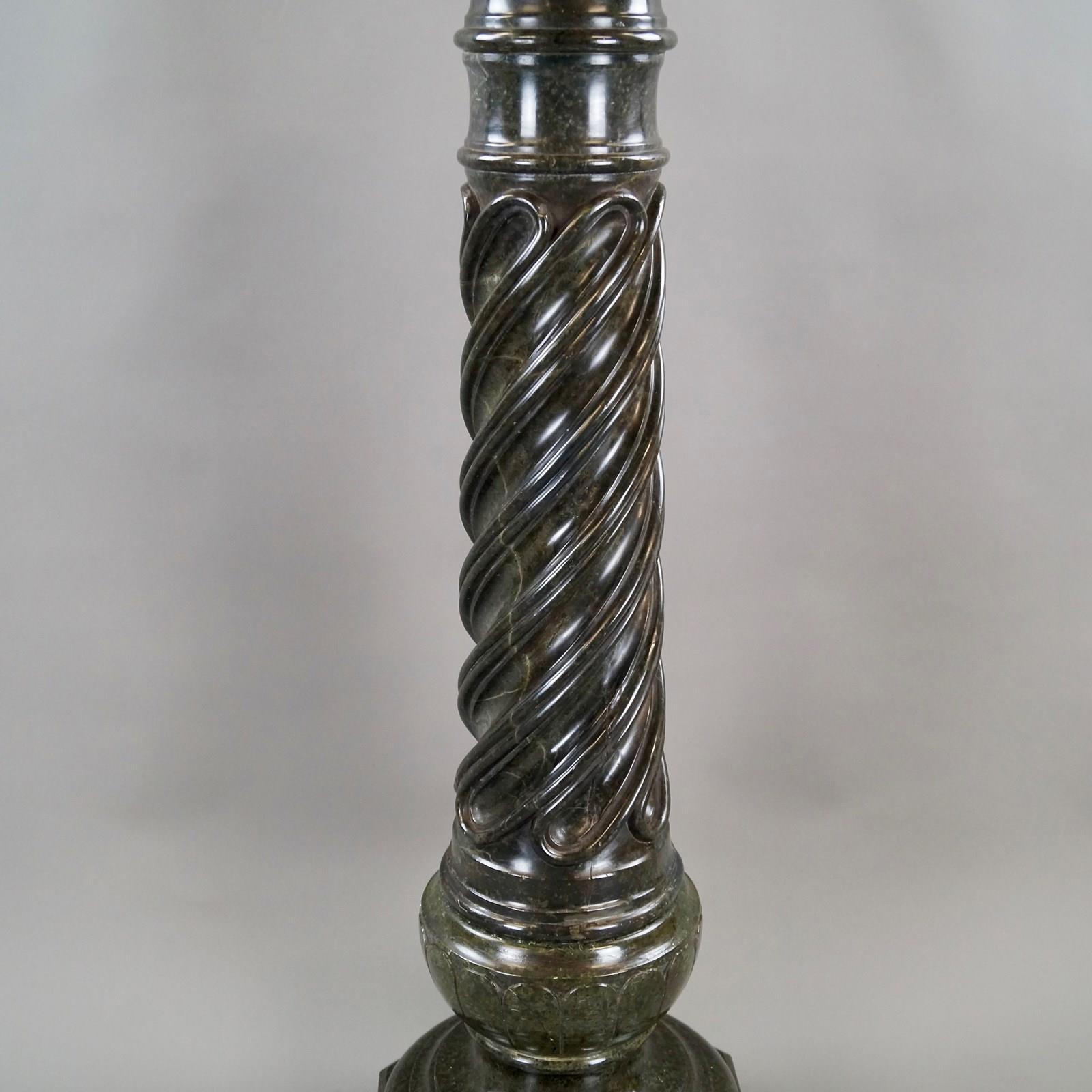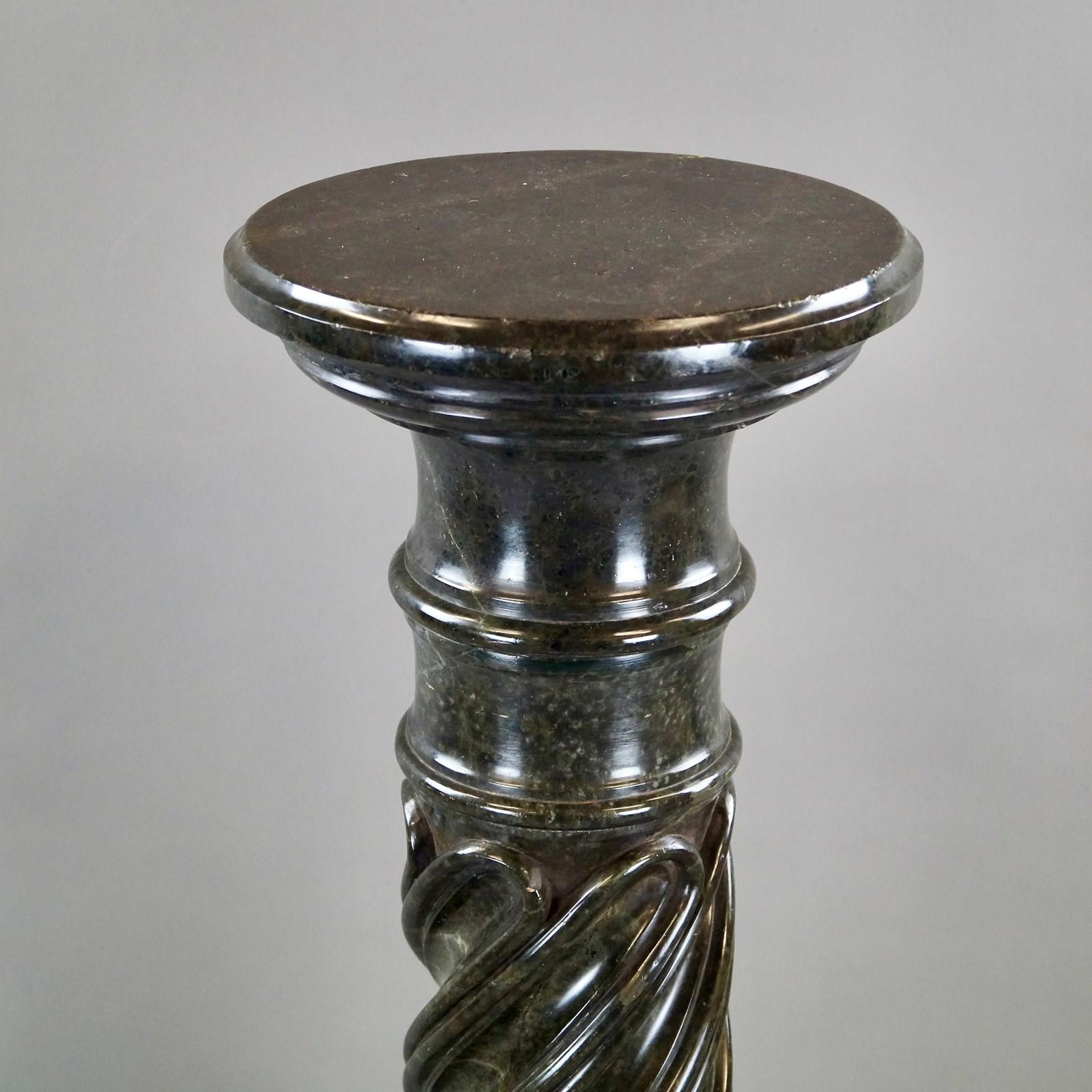 A French mid 19th century Verde Antico Marble column. The column consists of a circular turned top with a molded edge with carved spiral twist column below leading down to a baluster support with circular molded edge all supported on an octagonal base. In very good condition. 1090mm high, 320mm wide and 320mm deep. French. Circa 1860.