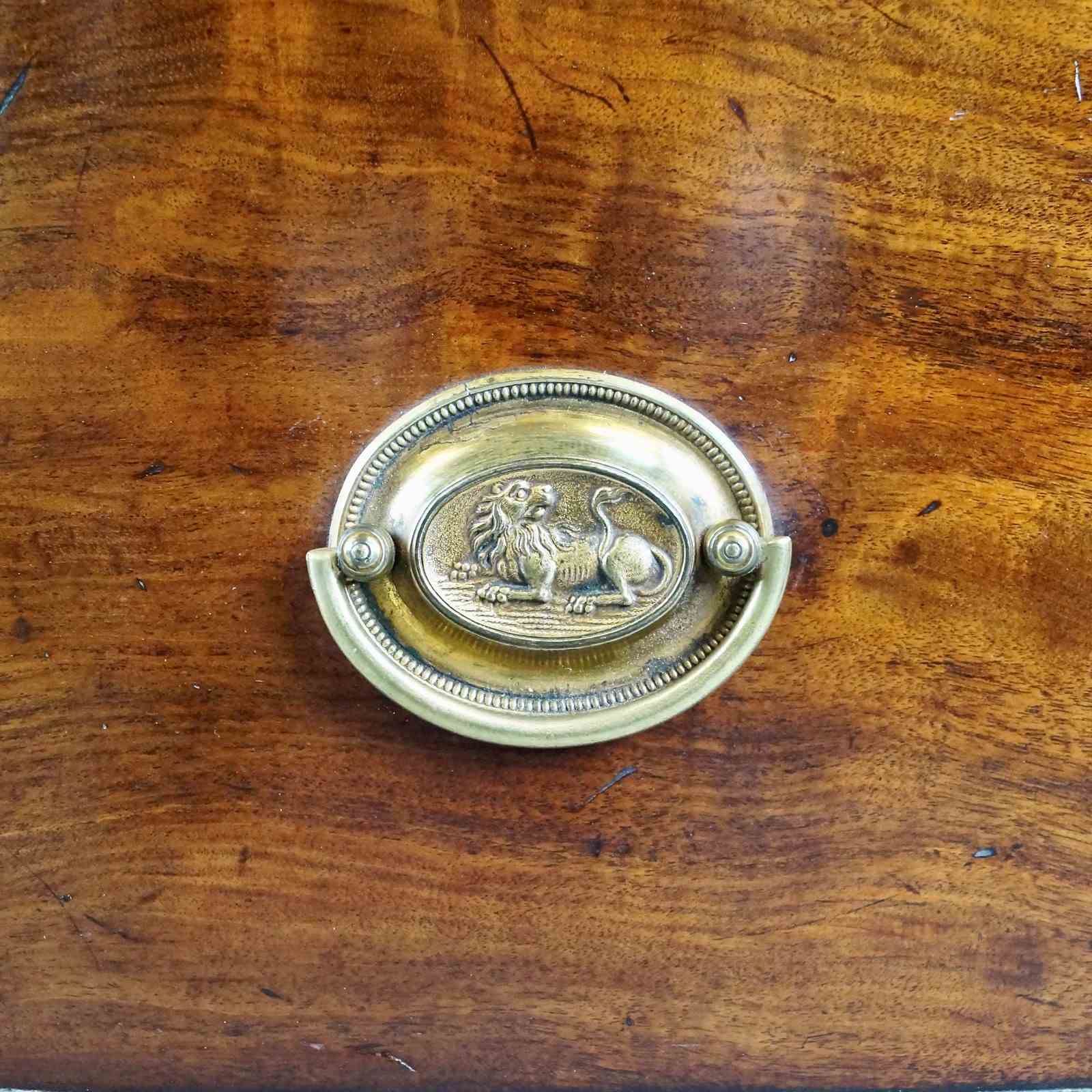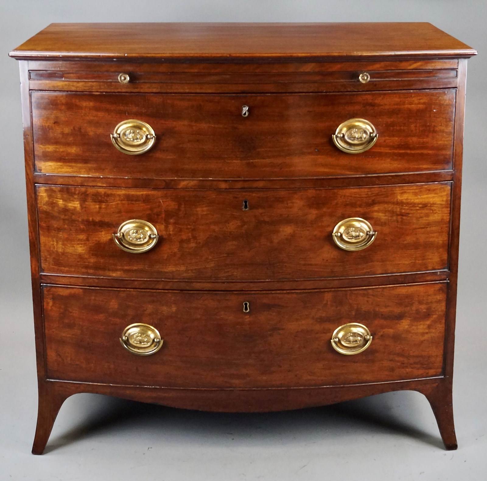 A George III Mahogany Bow-Fronted Chest Of Drawers. Raised on splay feet with a shaped apron and above three long drawers, with lovely original oval handles, and a brushing slide. In very good and original condition and with a mellow colour. 900mm high, 950mm wide and 530mm deep. English. Circa 1820.