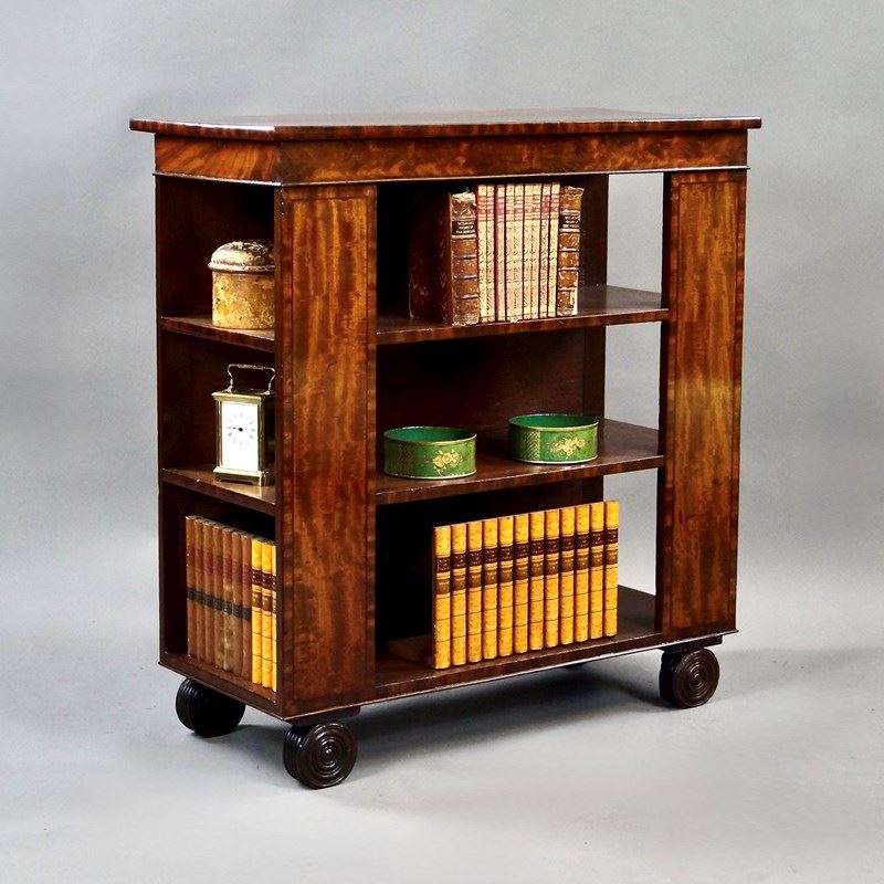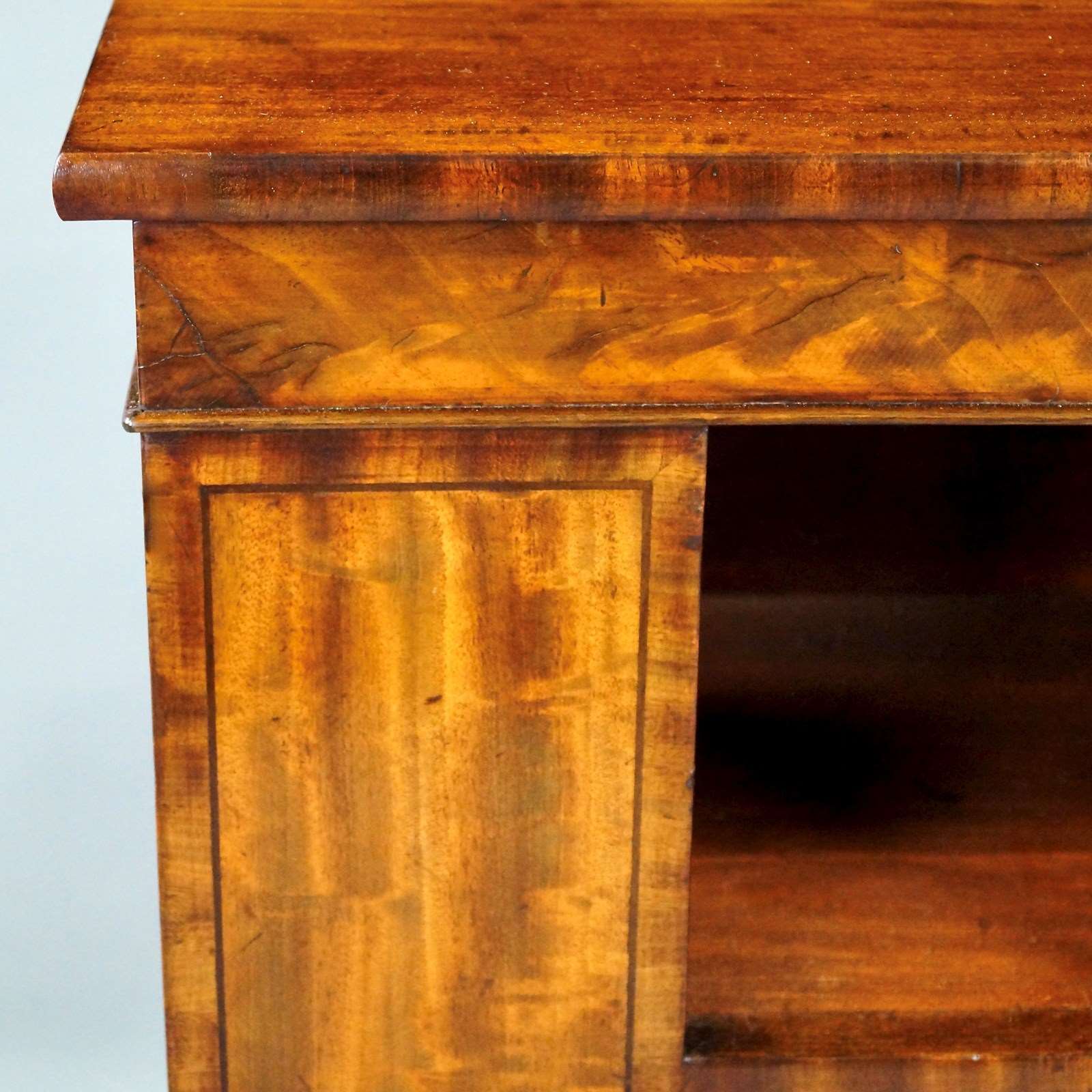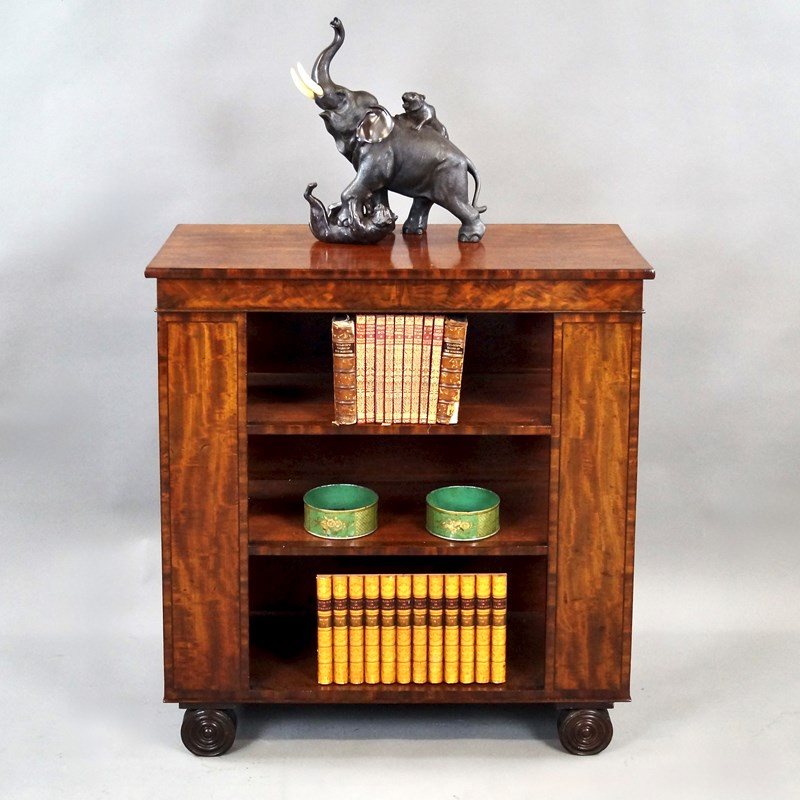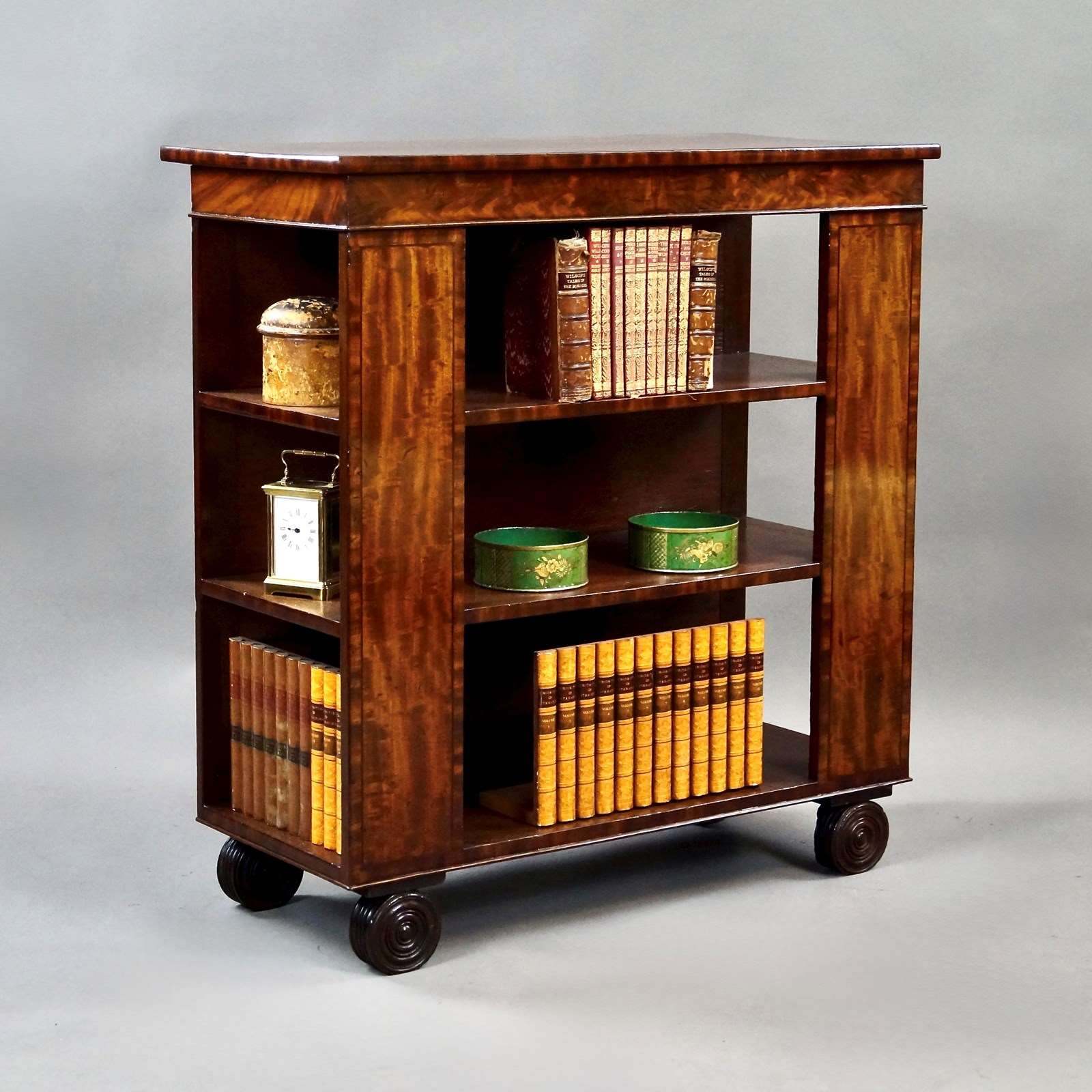 A lovely Regency dwarf bookcase. In well figured mahogany, the bookcase stands on "domino' feet and has two fixed shelves, open ends and with wide pilasters which are banded and have ebony stringing. In very good and original condition with an excellent mellow colour and patina. 820mm high, 790mm wide and 360mm deep. English. Circa 1825.