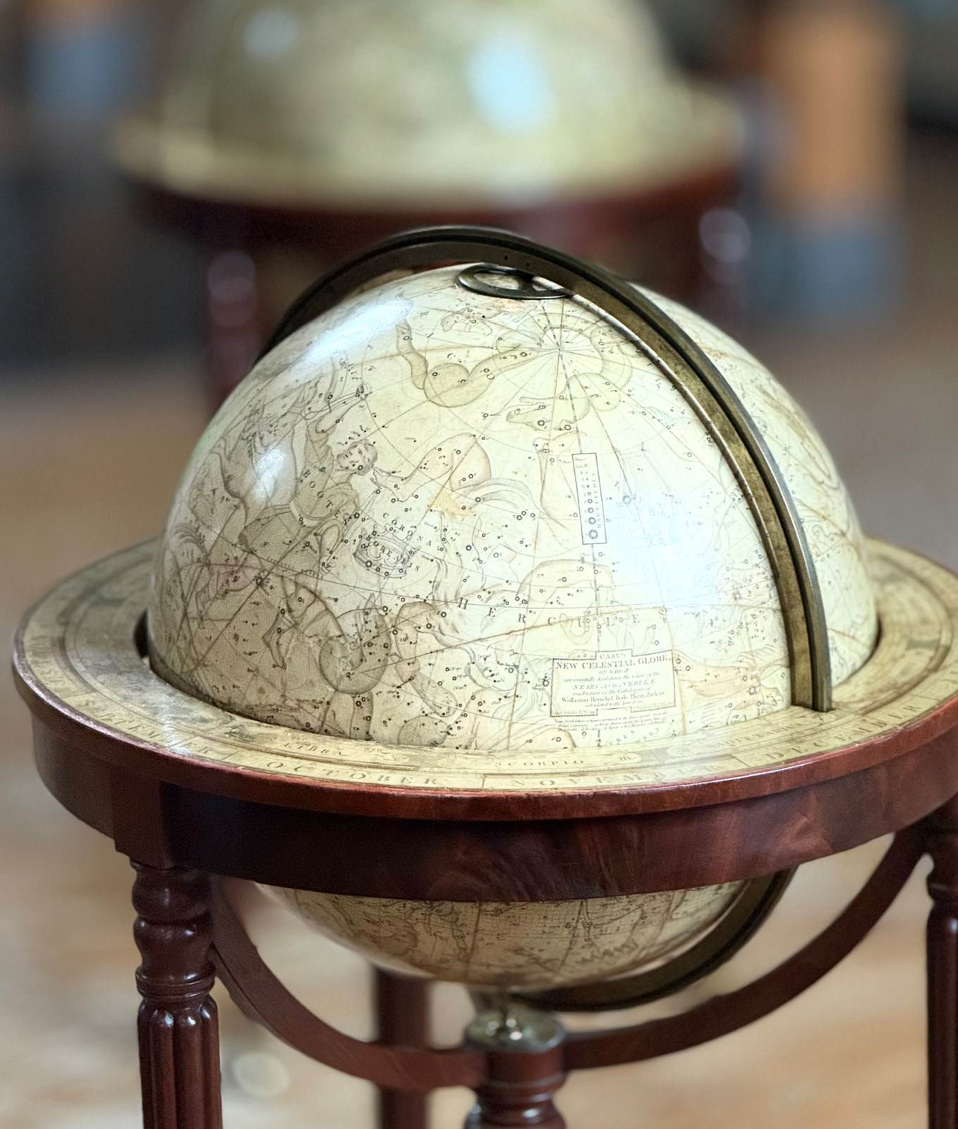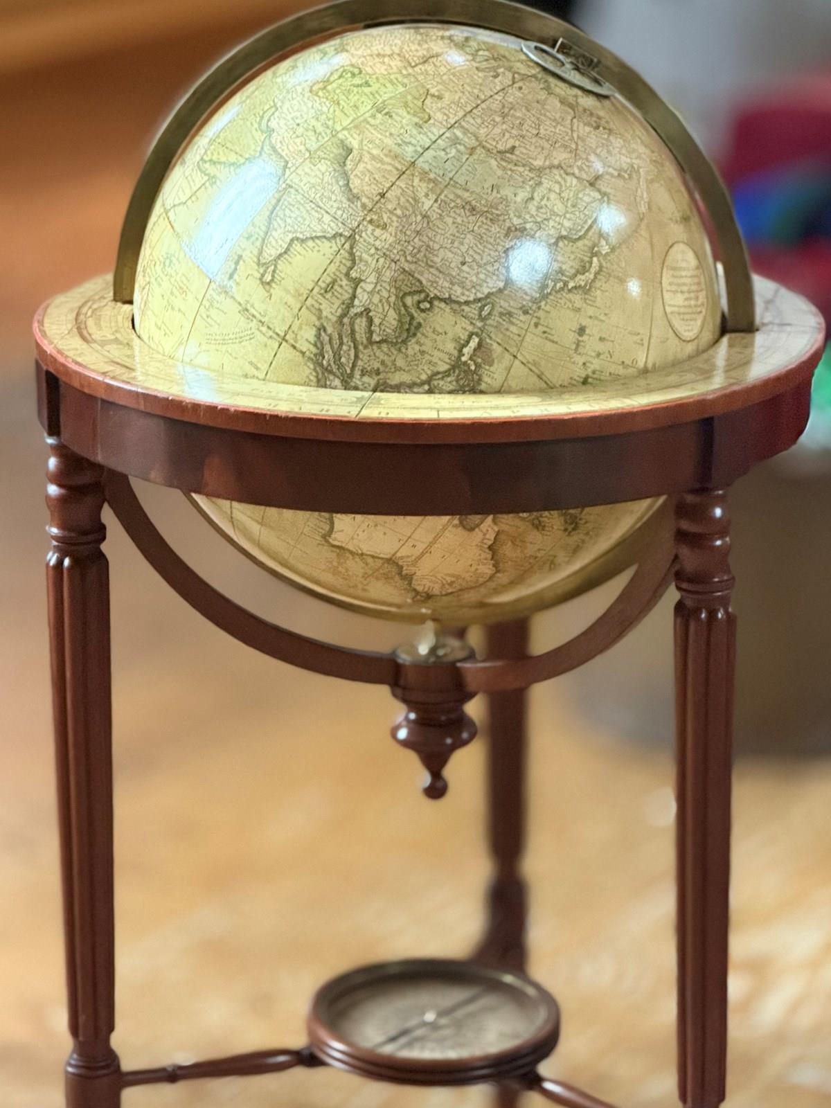Standing in their original mahogany bases with turned and reeded legs, the globes are in very good and sympathetically restored condition. 980mm high and 510mm diameter.