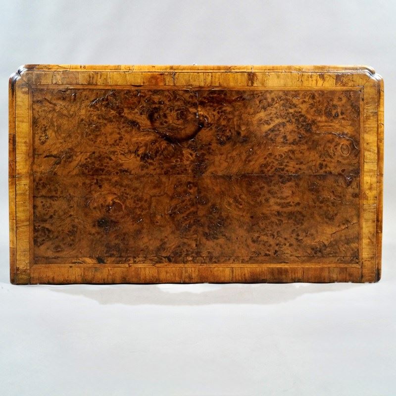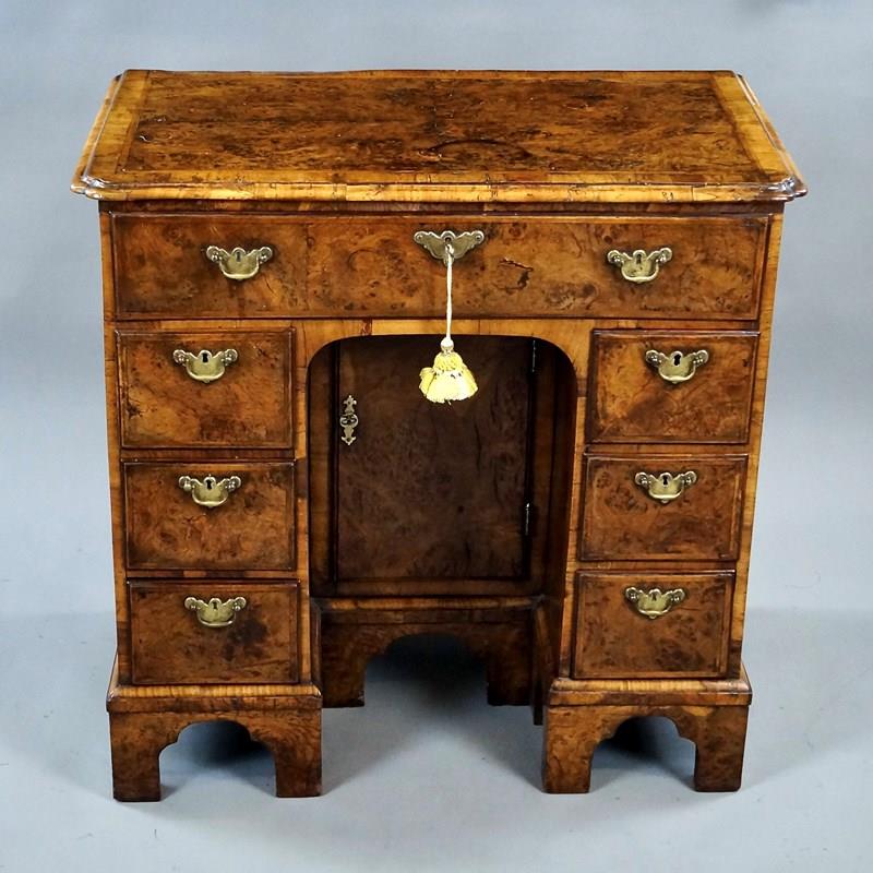 A rare George I, Burr oak knee-hole desk. Raised on bracket feet with seven oak lined drawers and knee-hole cupboard, all with original handles, and above a cross and feather banded top with molded edge and re-entrant corners. The desk is constructed in highly decorative burr oak which has adopted a lovely mellow colour. In very good and original condition. 830mm high, 850mm wide and 490mm deep. English. Circa 1725.