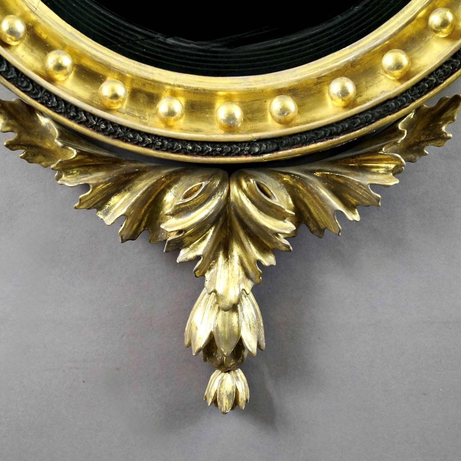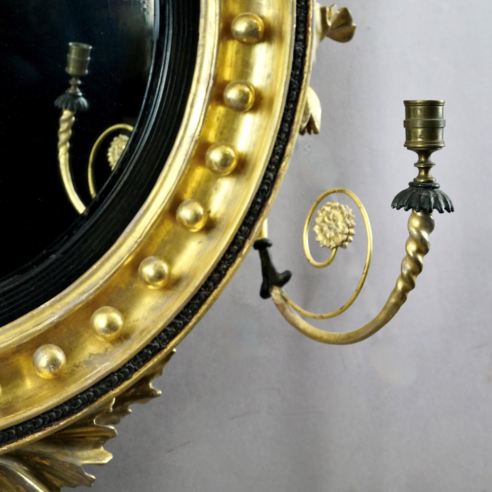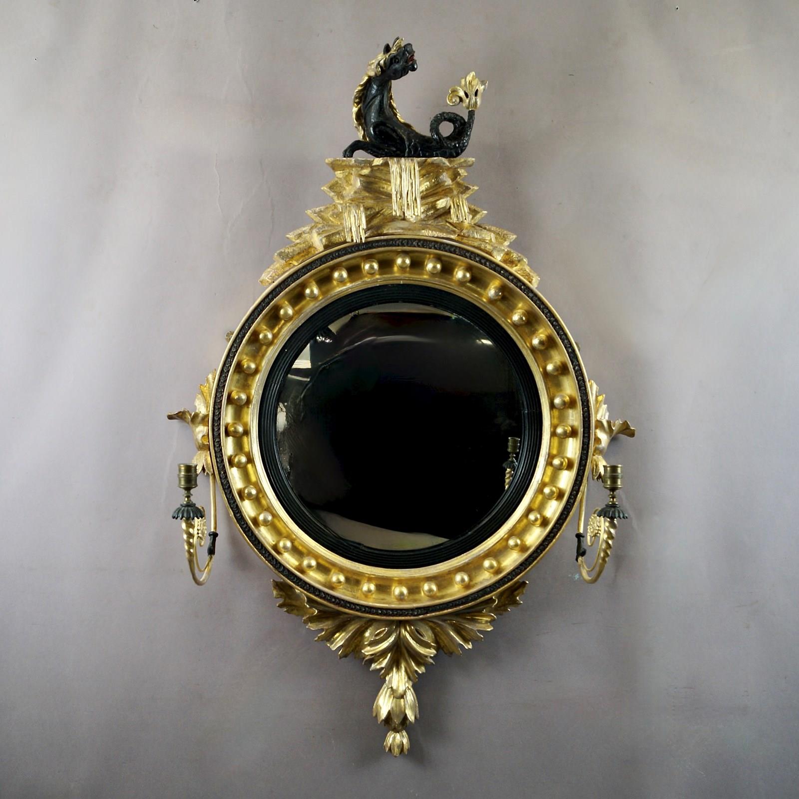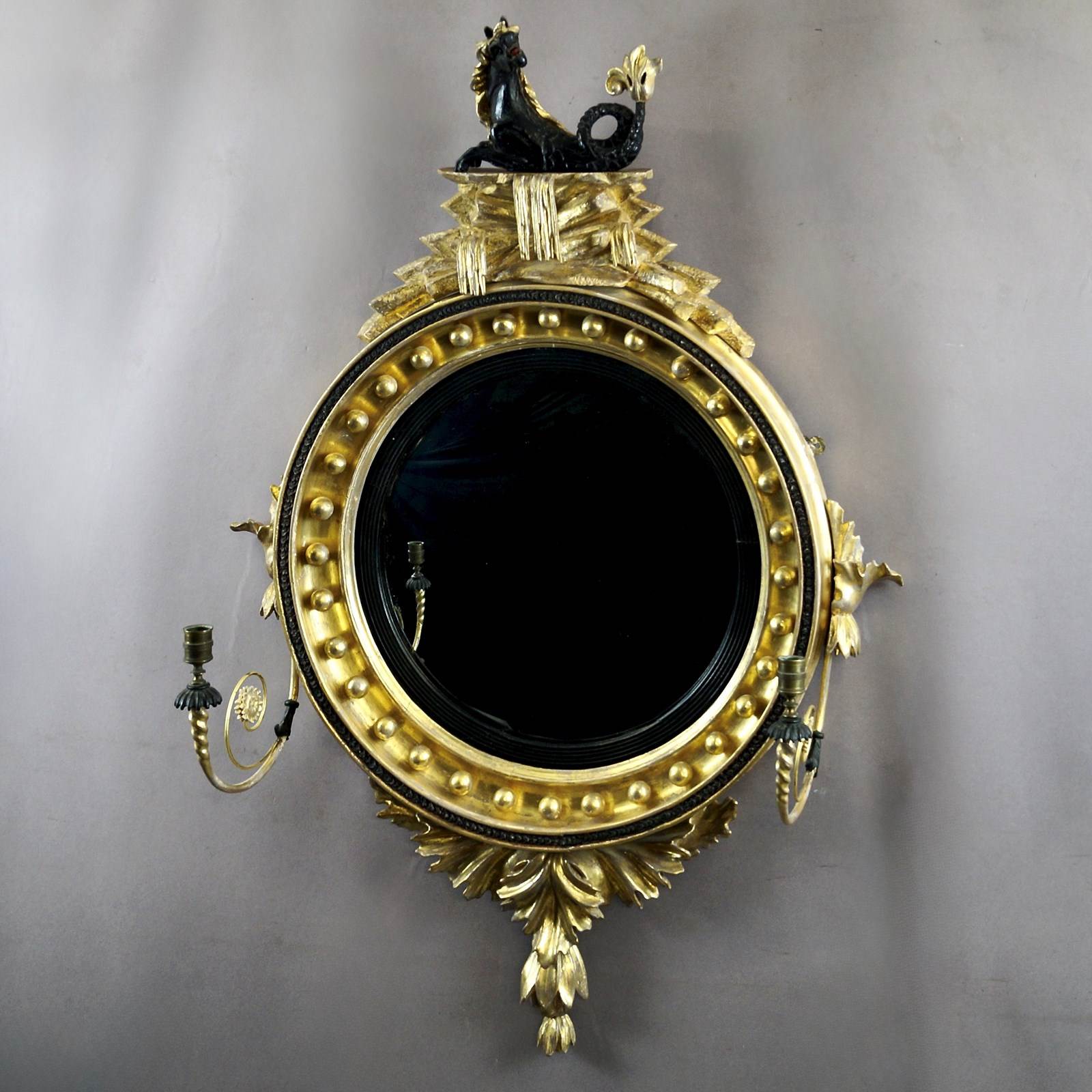 Fine Regency period gilt-wood convex mirror (Girandole) having well-carved stylized sea horse on a rocky ground cresting above turned frame with gilt balls and molded rim, acanthus leaves holding twist turned sconce arms, above sheaf base, the whole with good rich surface of gilt and bronzed highlights and with original mercury glass convex plate. 1040mm high, 690mm wide and 230mm deep. English. Circa 1820.