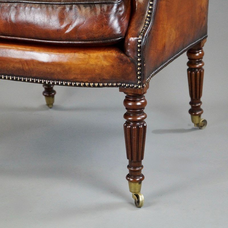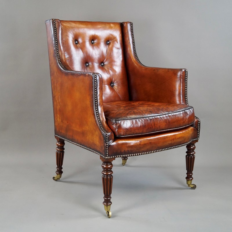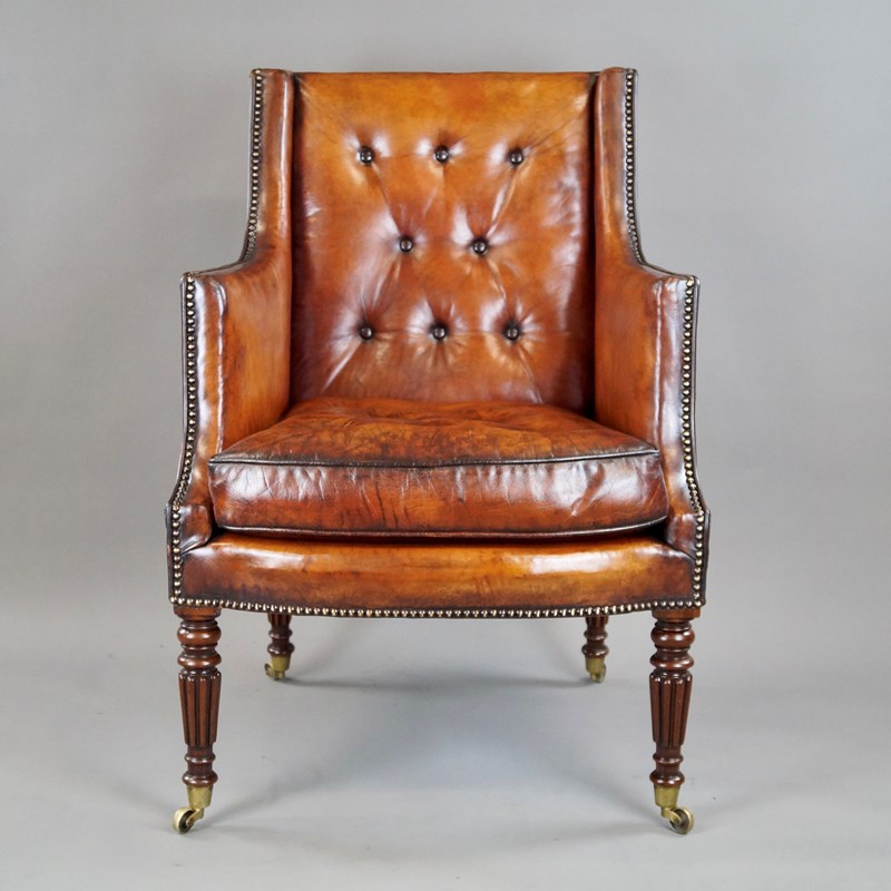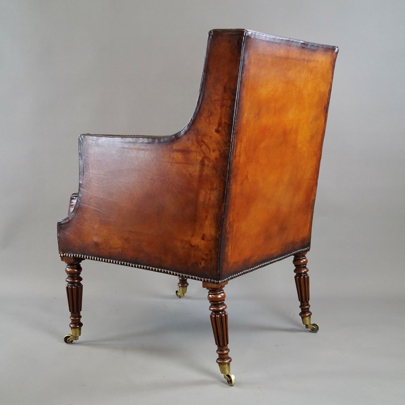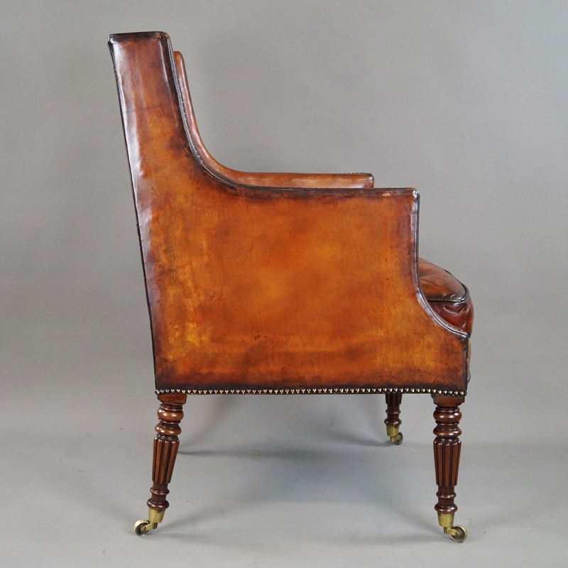 A fine Regency Library Arm Chair in the manner of Gillows. The chair stands on dense mahogany turned and reeded legs with brass castors and is beautifully upholstered in hand dyed leather which is buttoned and brass nailed. In very good and original condition. 970mm high, 660mm wide, 750mm deep and 490mm seat height. English. Circa 1815.