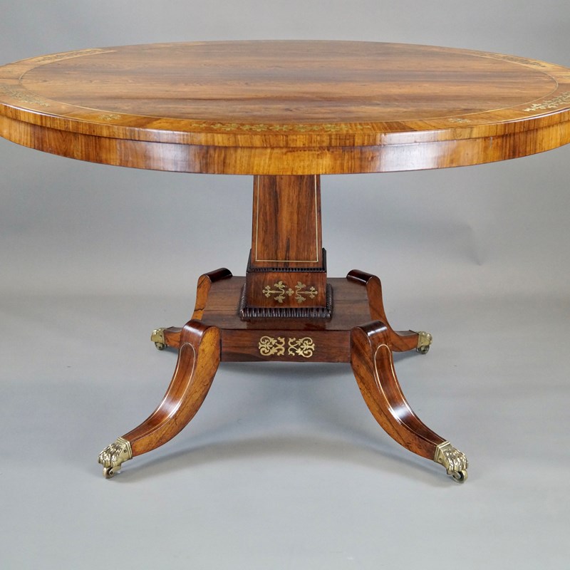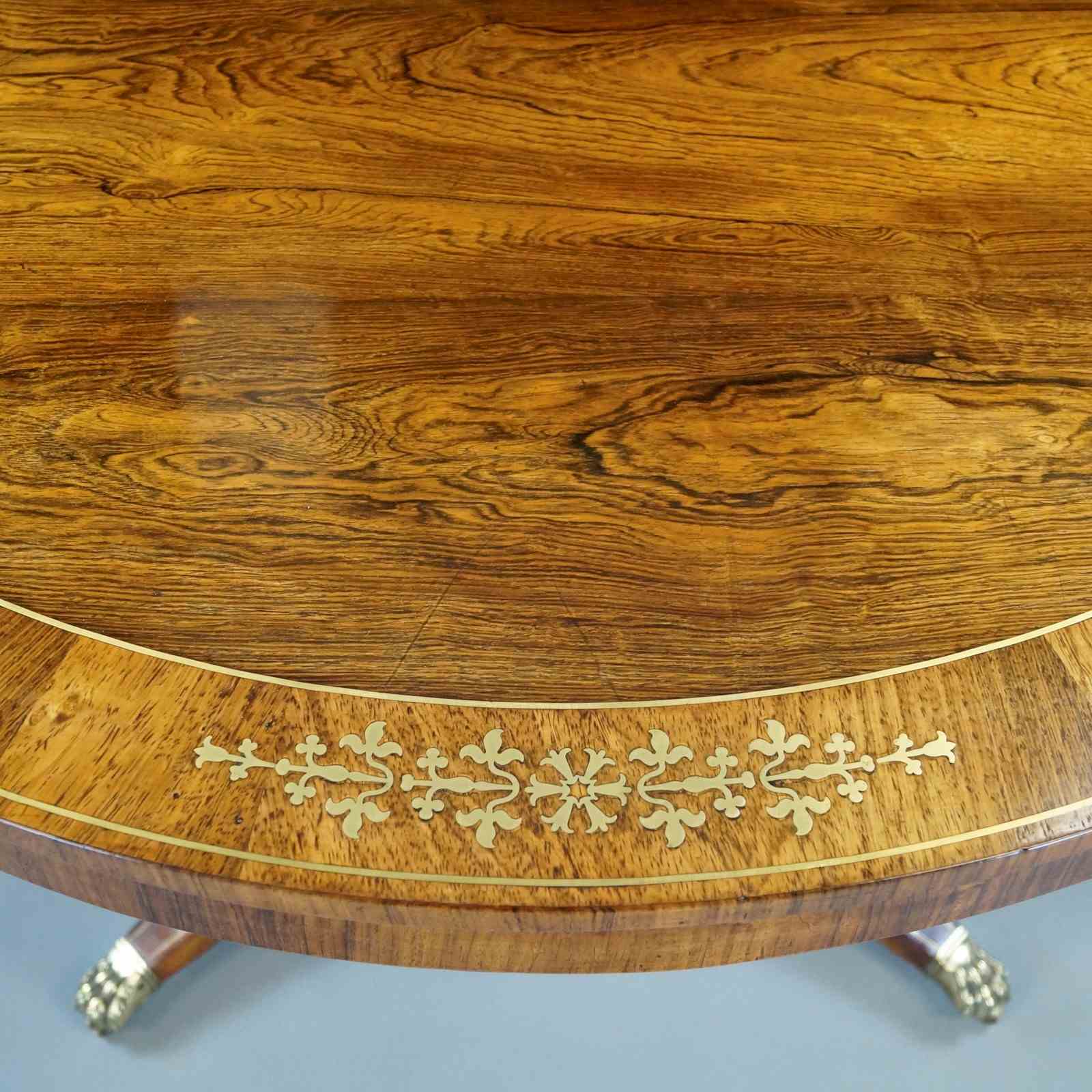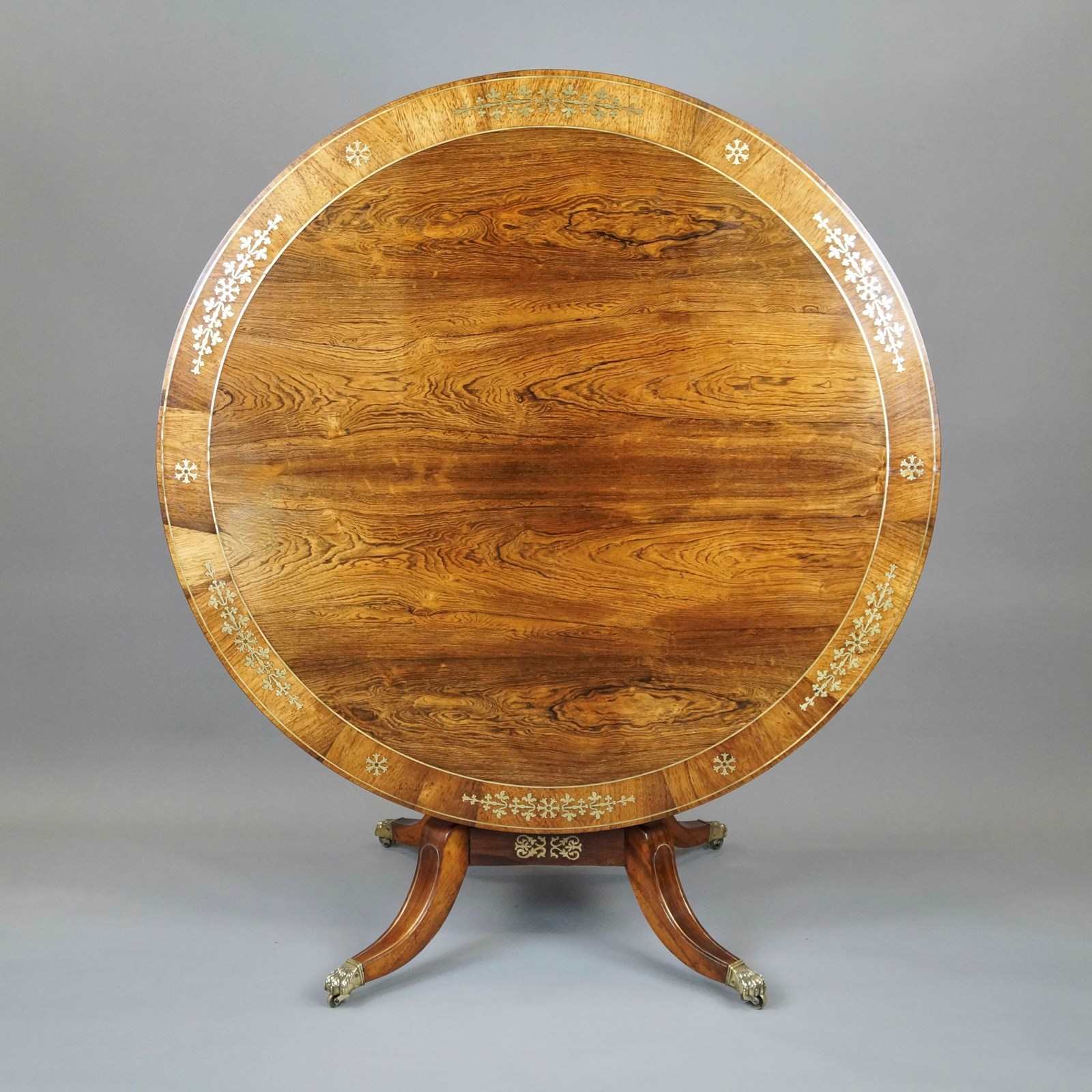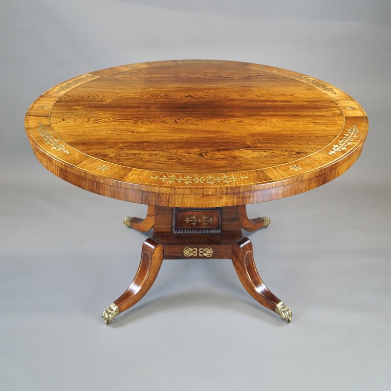 A very attractive Regency rosewood & brass inlaid centre table. With a figured, faded rosewood top with decorative brass inlay. Raised on a brass inlaid quattro-form base with cabriole legs brass claw castors. In very good condition. 730mm high and 1220mm diameter. English. Circa 1825.