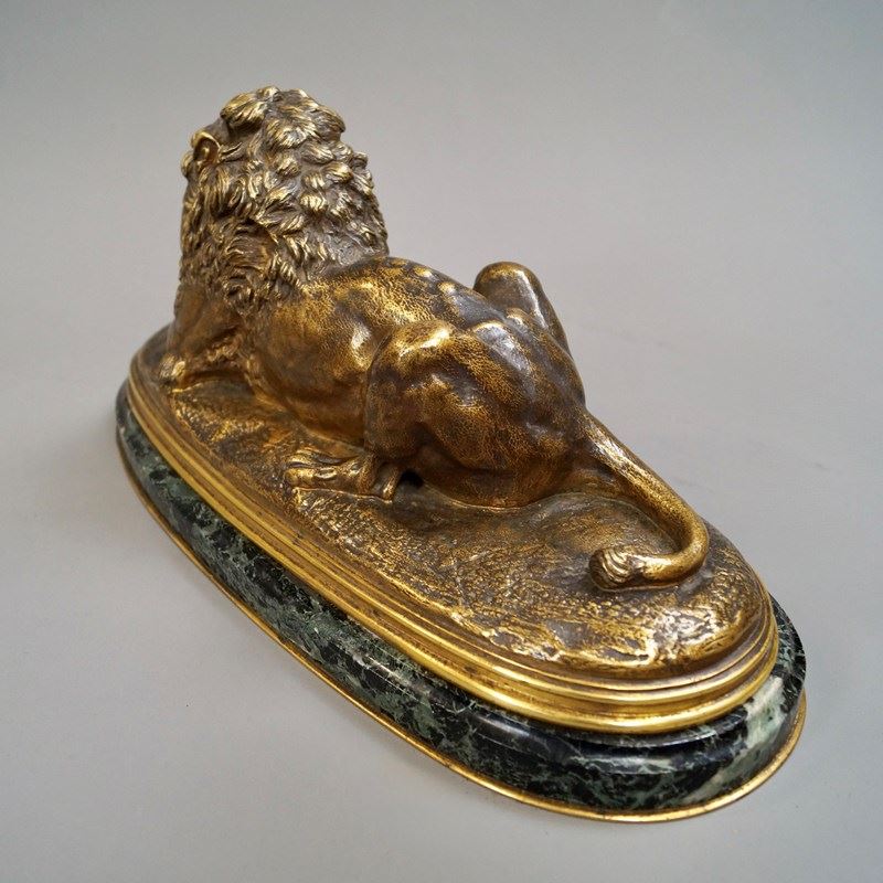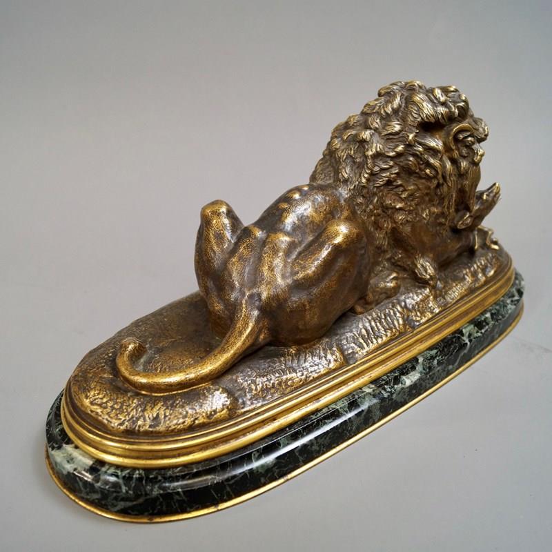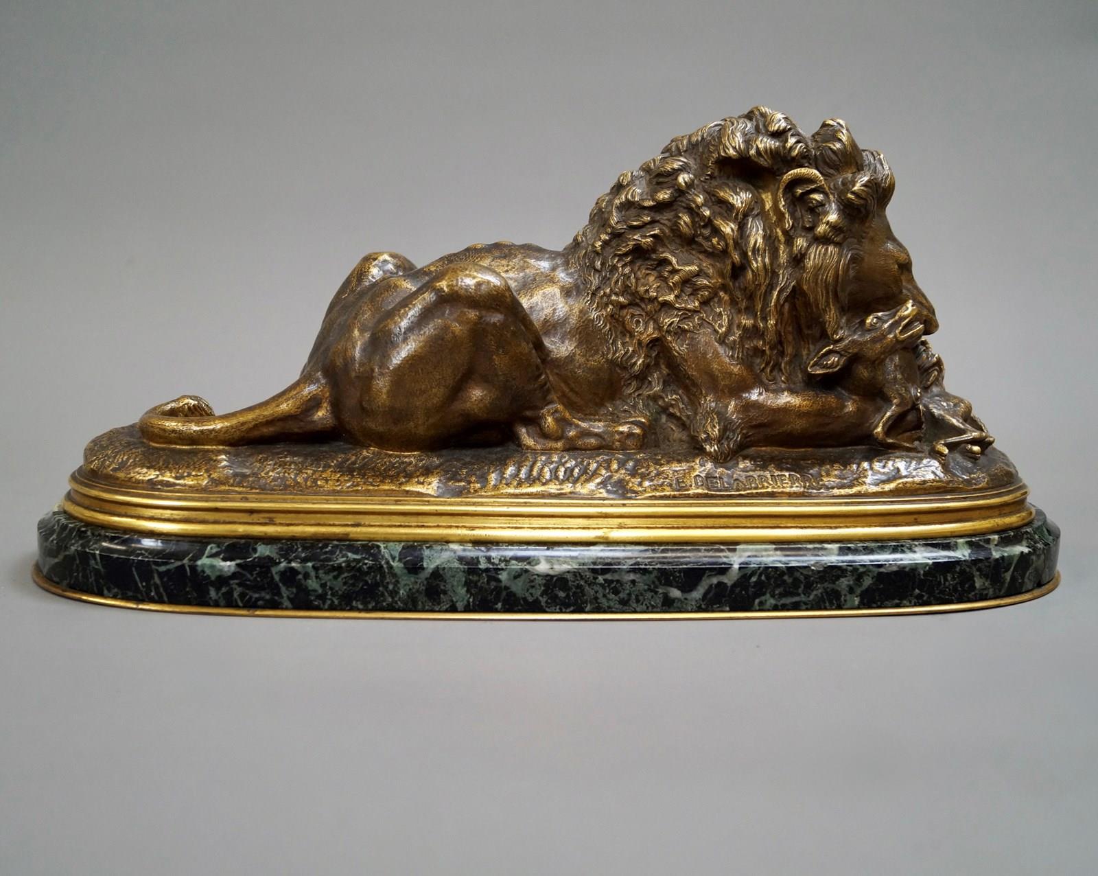 A superb bronze lion by Paul-Édouard Delabrièrre. Beautifully detailed and with a lovely golden patina and sitting on a Maurin Green marble base. 180mm high, 380mm wide and 150mm deep. French. Circa 1885.