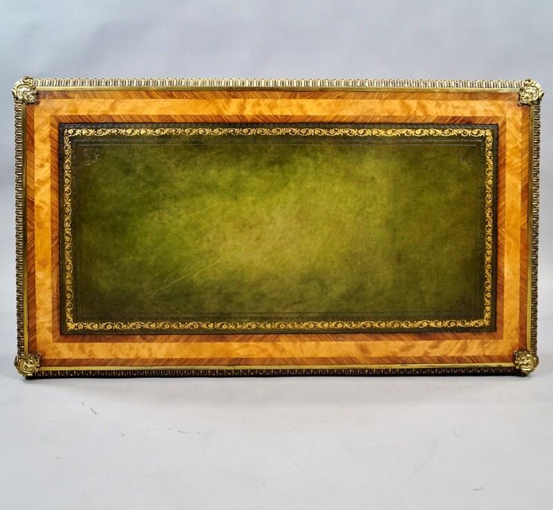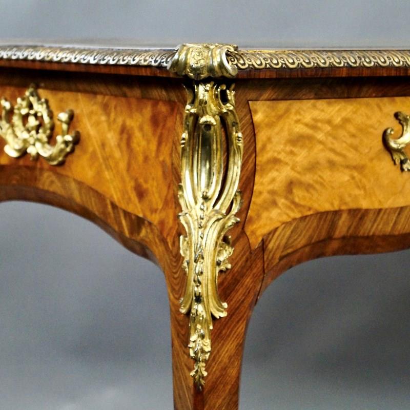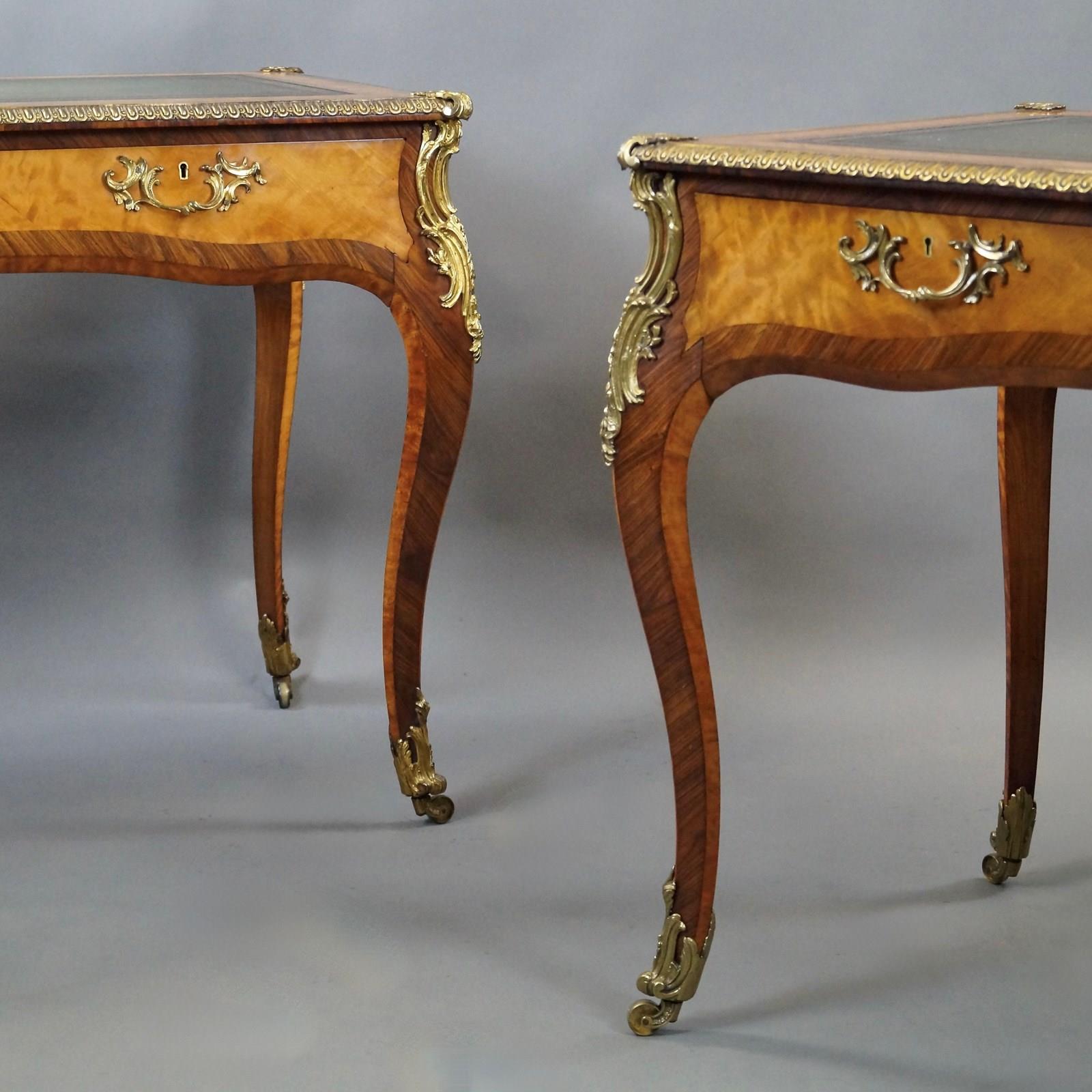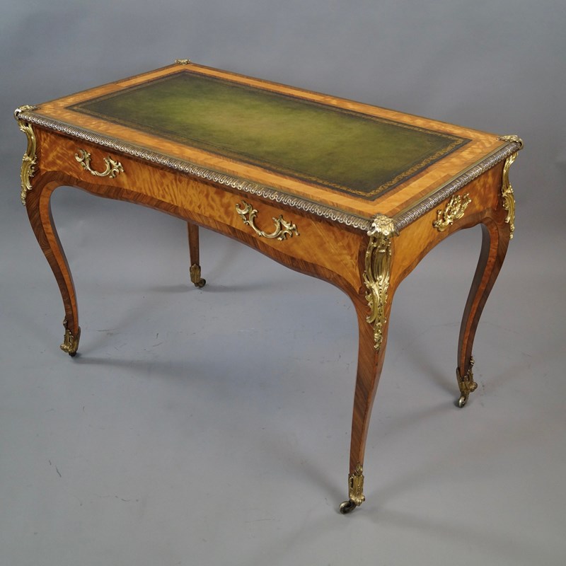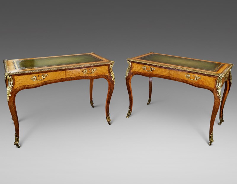 A very rare pair of bureau plat, in satinwood and rosewood with ormolu mounts, moldings and feet. This fine quality pair of writing tables are raised on cabriole legs with acanthus sabots and castors and above are drawers, with polished mahogany linings, and dummy drawers to the reverse. The tops are triple banded and have ormolu moldings and inset green leather writing surfaces. In very good and original condition. 750mm high, 1100mm wide and 640mm deep. English. Circa 1860.