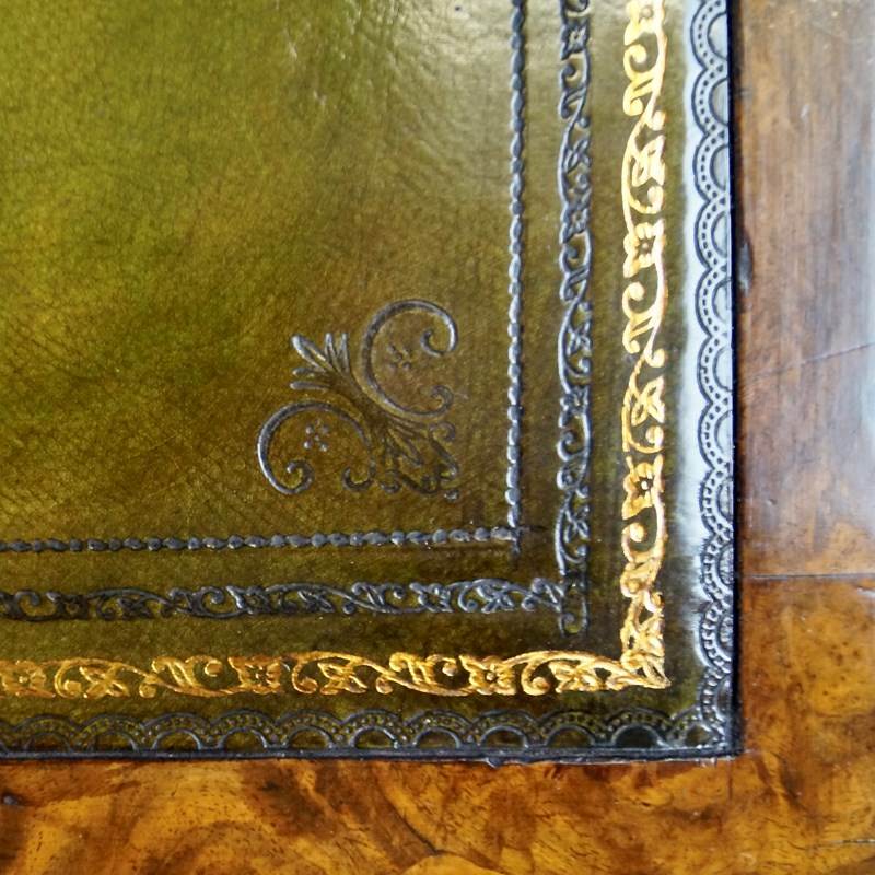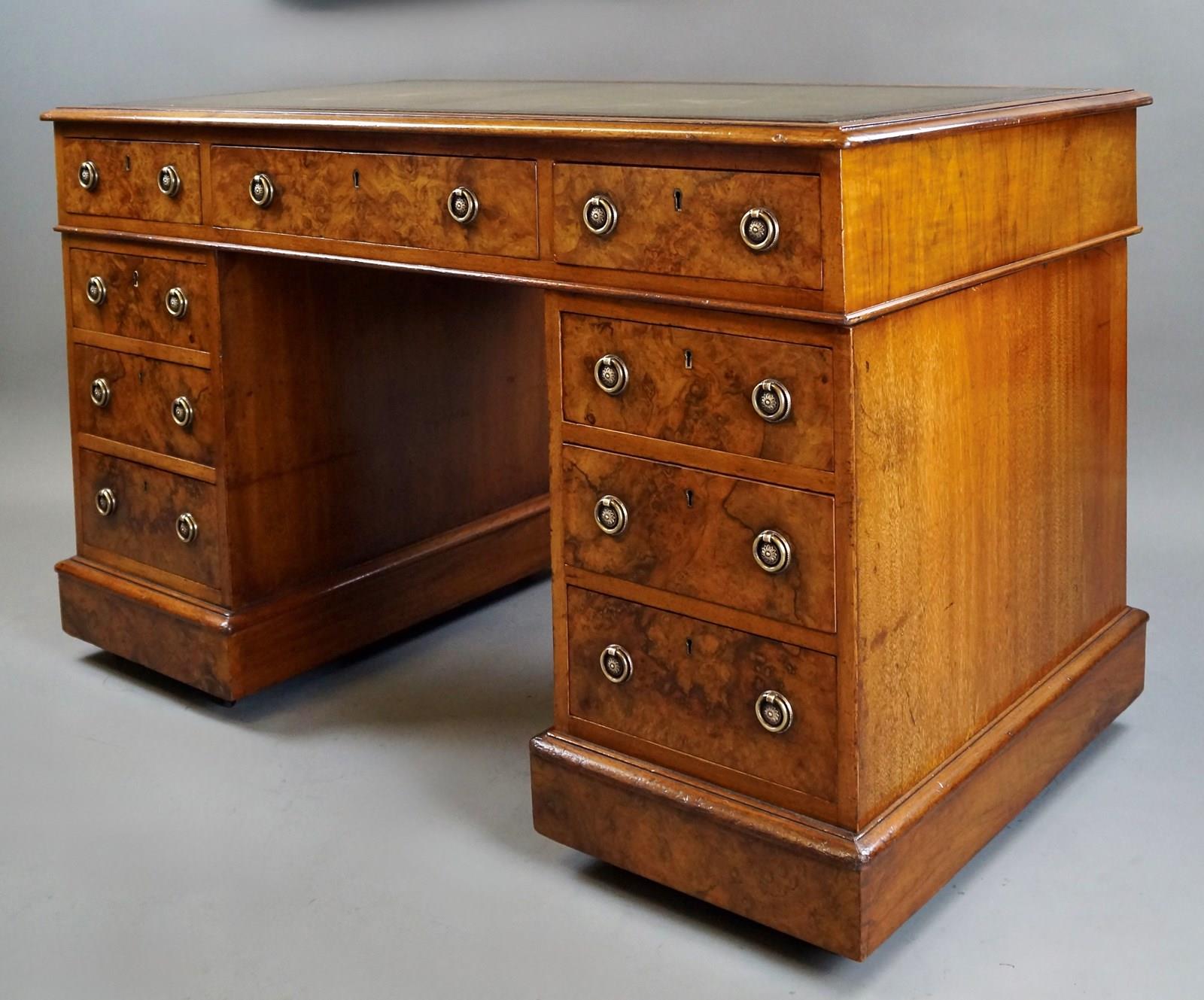 A Victorian Burr Walnut Pedestal Desk. With a lovely colour and raised on a plinth base with discrete castors under. The desk has nine drawers all with ring handles and is finished all the way around and with a velum green leather writhing surface with gilt and blind tooling. In very good condition. 790mm high, 1310mm wide, 690mm deep and the knee-hole measures 610mm high and 540mm wide. English. Circa 1860.