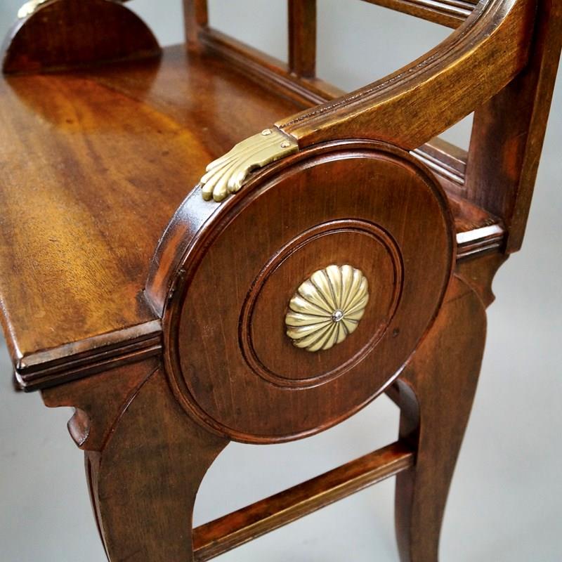 James Shoolbred and Co. (aka Jas Shoolbred) were established in the 1820s at 155 Tottenham Court Road. It was originally a drapers supplying the furniture trade. In the late 1860s/early 1870s the company began designing, manufacturing and selling high quality furniture, of their own design. Their sophisticated designs referenced Regency aesthetics which were informed by antiquity (Greek/Roman styles).