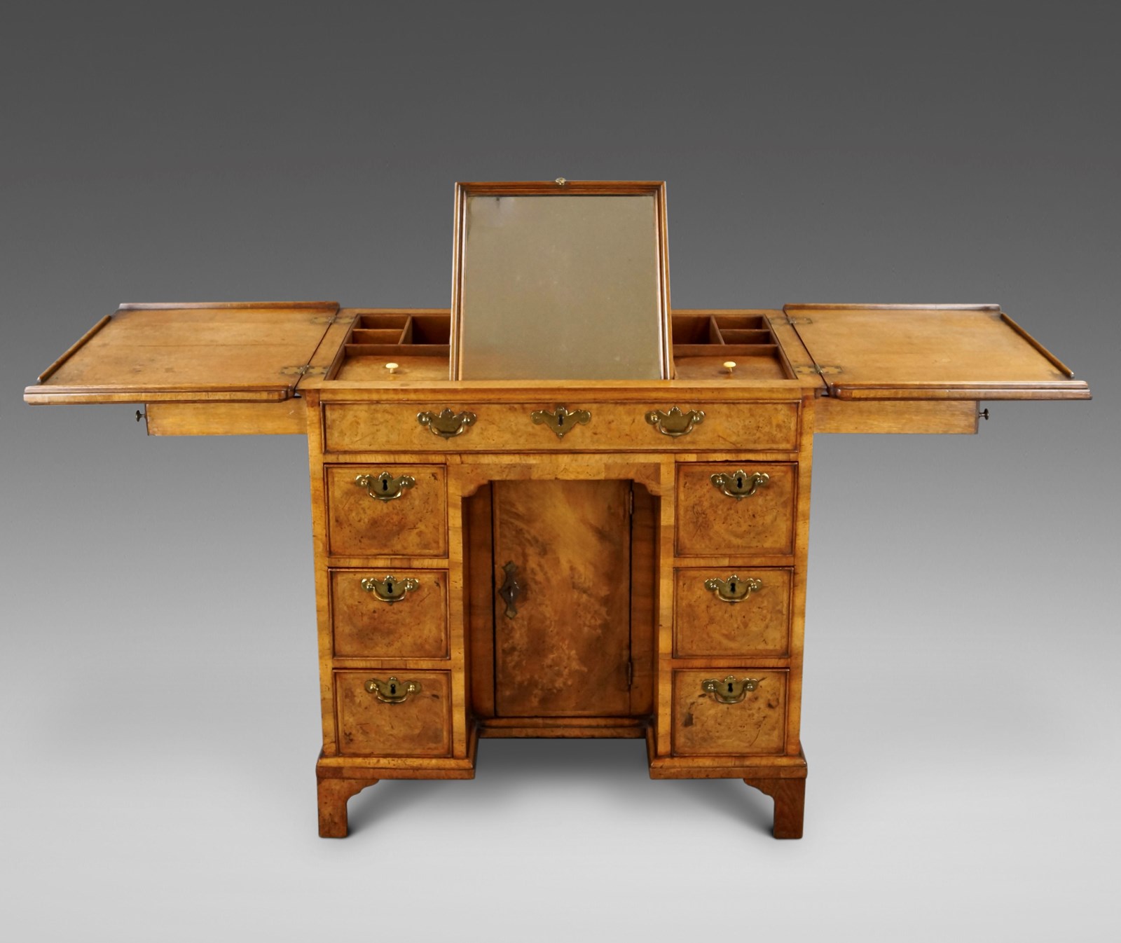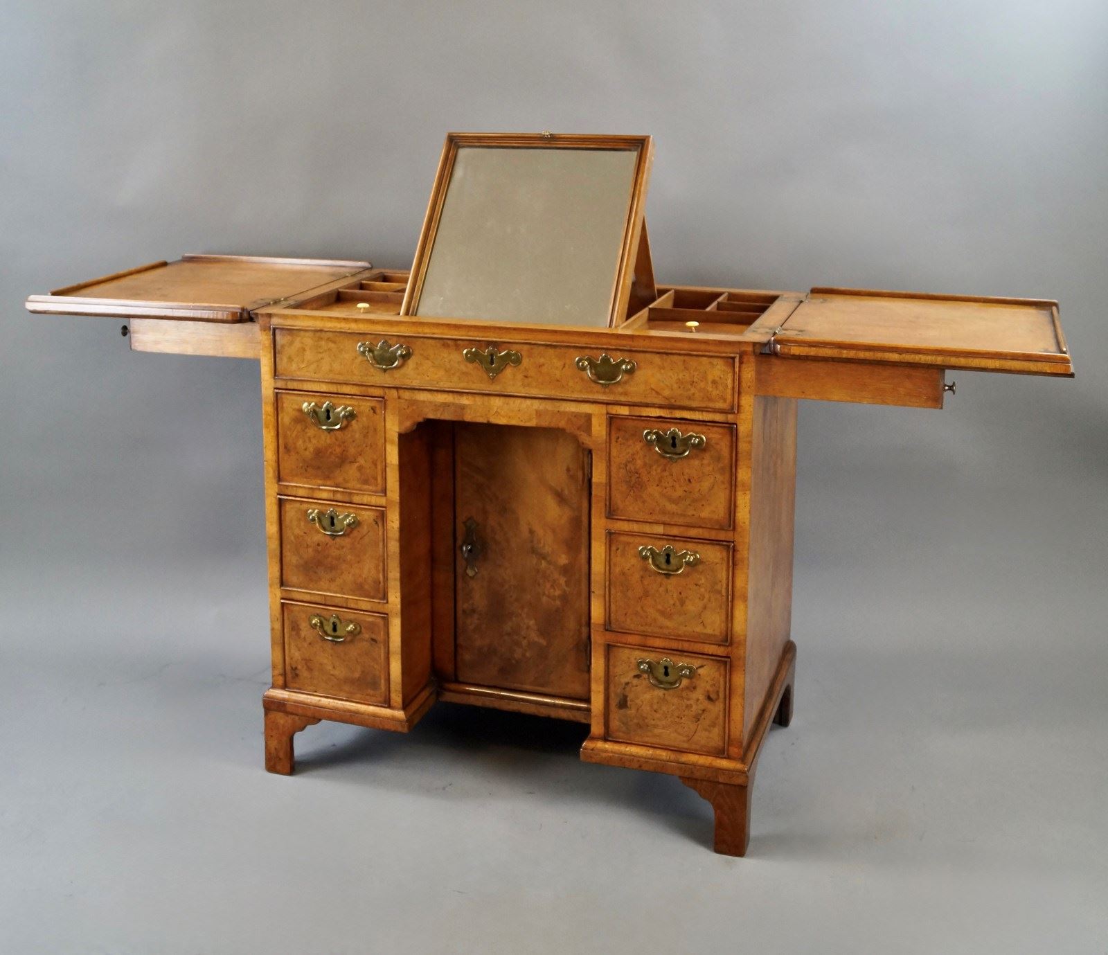 An unusual George I walnut knee-hole dressing chest. Raised on bracket feet with central recessed cupboard bordered by three oak lined and cock beaded drawers to either side and dummy drawer over, all with original brass handles. The top, with re-entrant corners and cross-grain molding, folds open open and is supported by lopers, the interior has a selection of compartments and a central adjustable mirror. The chest has a lovely mellow colour and patina. 770mm high, 790mm wide and 480mm deep. English. Circa 1725.