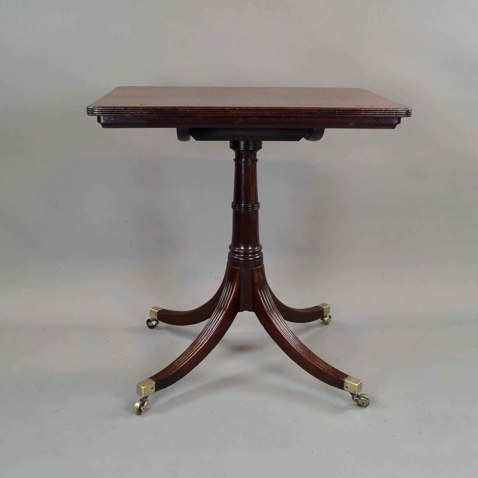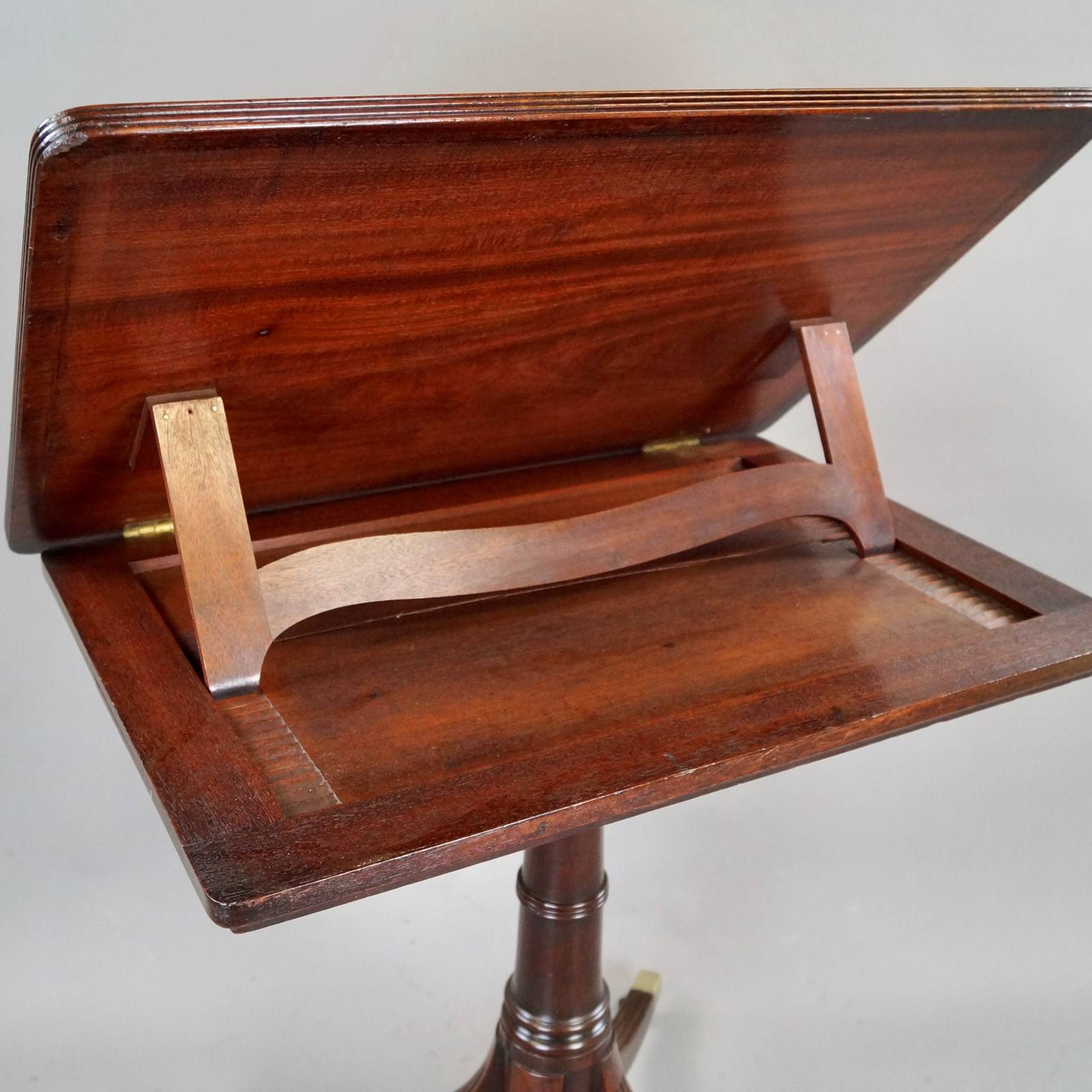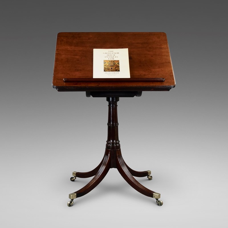 George III, Cuban mahogany reading table. Raised on reeded splay legs which terminate in brass castors and with a turned column. The top has a ratchet adjustment and removable book rest. The whole is in dense Cuban mahogany which retains a good colour and waxed patina. In very good and original condition. 730mm high, 700mm wide and 500mm deep. English. Circa 1780.