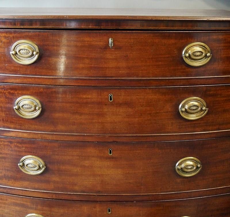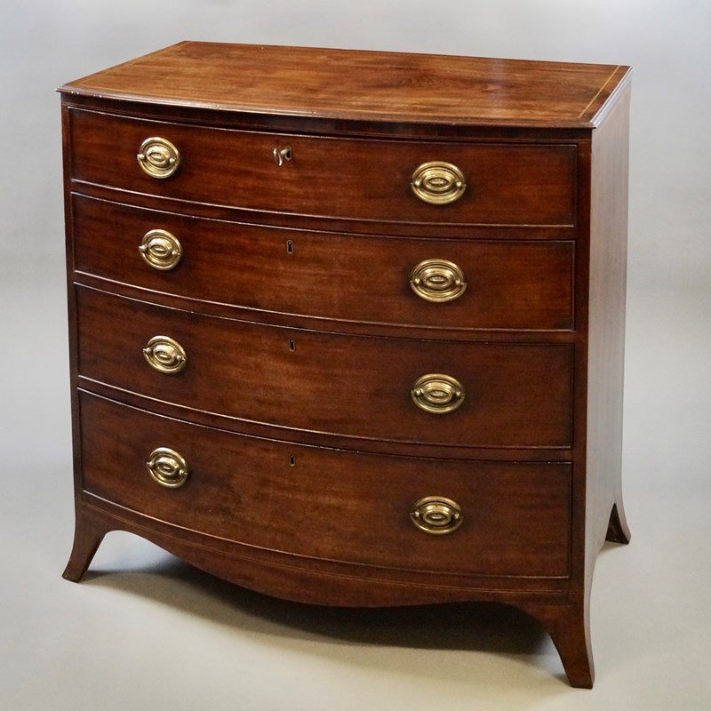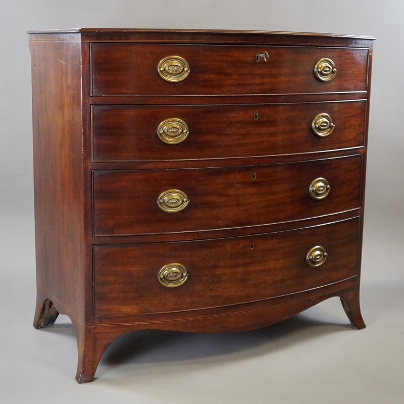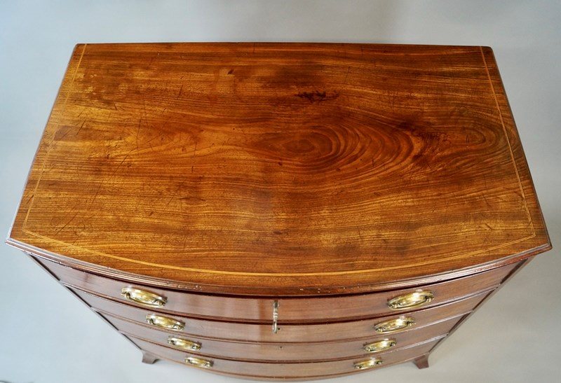 A superior quality George III period mahogany bow-fronted chest. The well figured top inlaid with boxwood and ebony line. The four oak-lined drawers fitted with the original brass handles and original locks. In very good original condition throughout and retains a great surface and colour. 920mm high, 930mm wide and 570mm deep. English. Circa 1810.