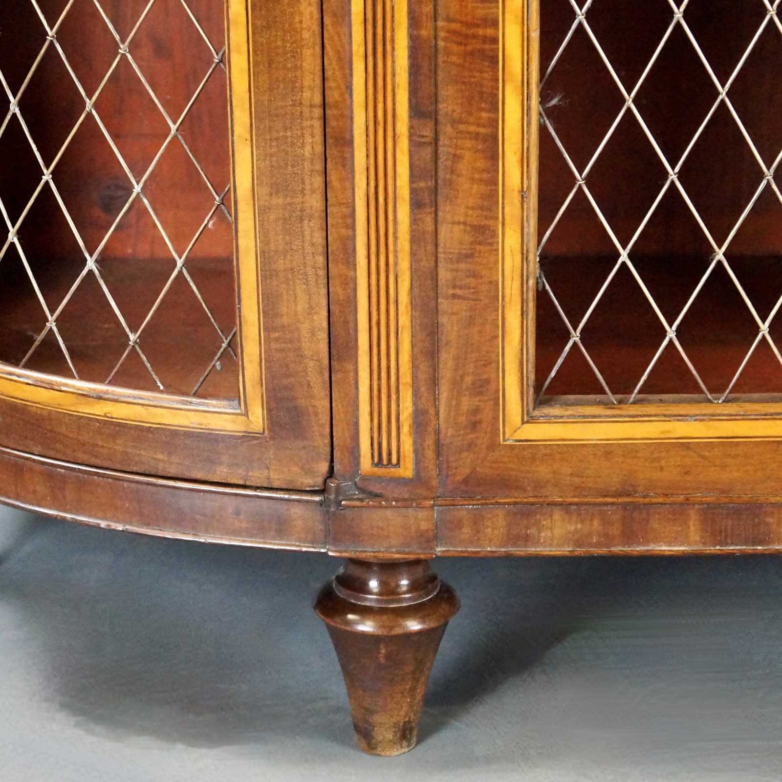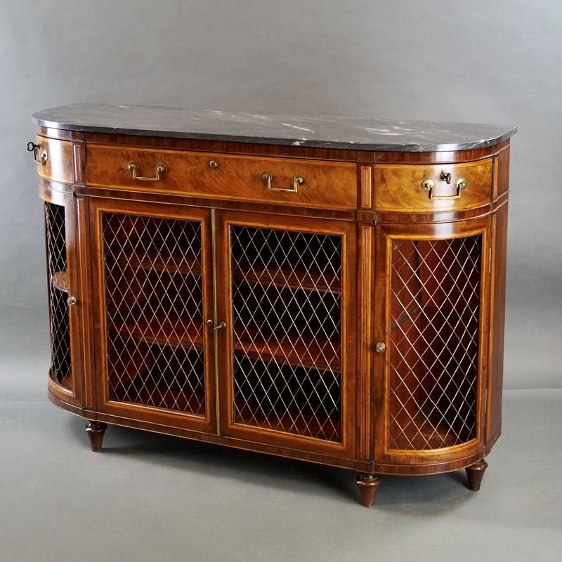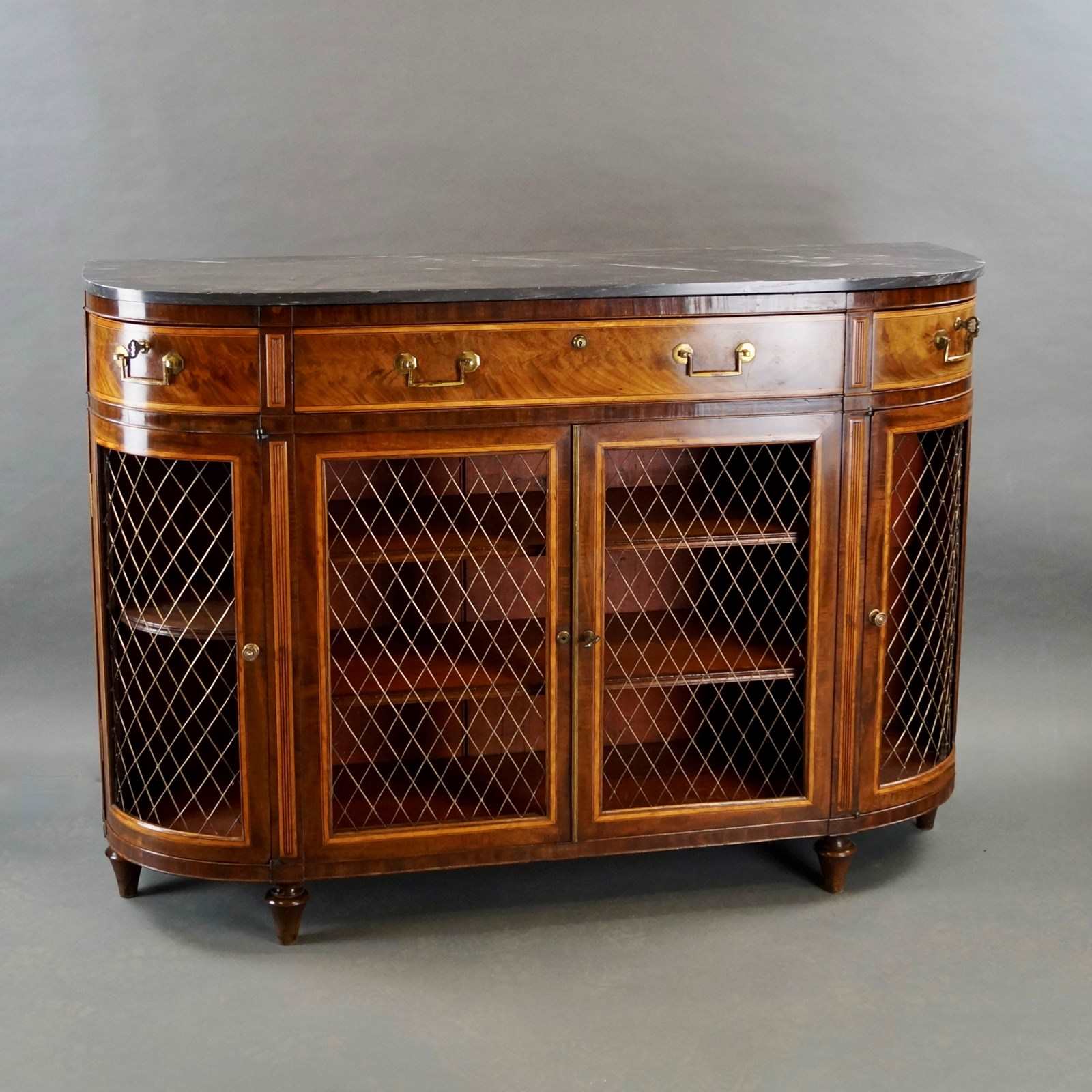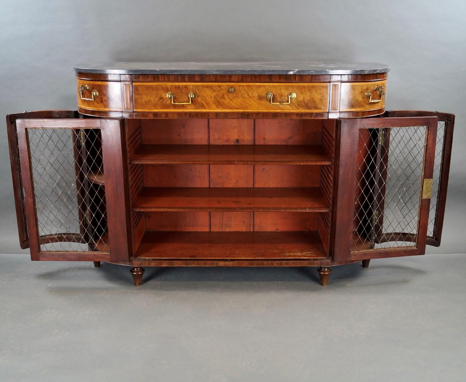 A fine George III Mahogany Side Cabinet. Raised on turned feet and above are four satinwood inlaid doors, all with original brass grilles, behind which are adjustable shelved interiors. There are three frieze drawers, all with original brass handles and locks. The cabinet is topped with what we believe to be its original Grigio Collemandina Marble. In very good condition, shallow proportions and retaining a lovely mellow colour. 920mm high, 1320mm wide and 410mm deep. English. Circa 1820.