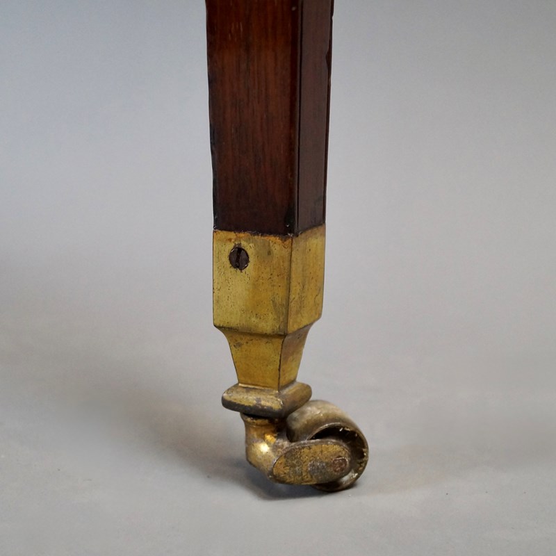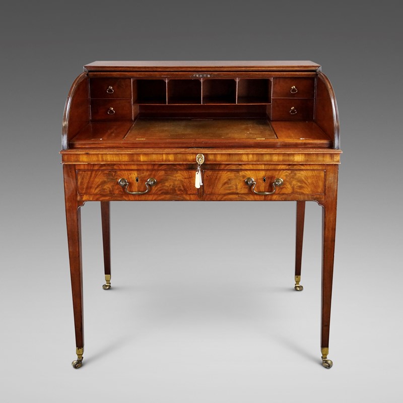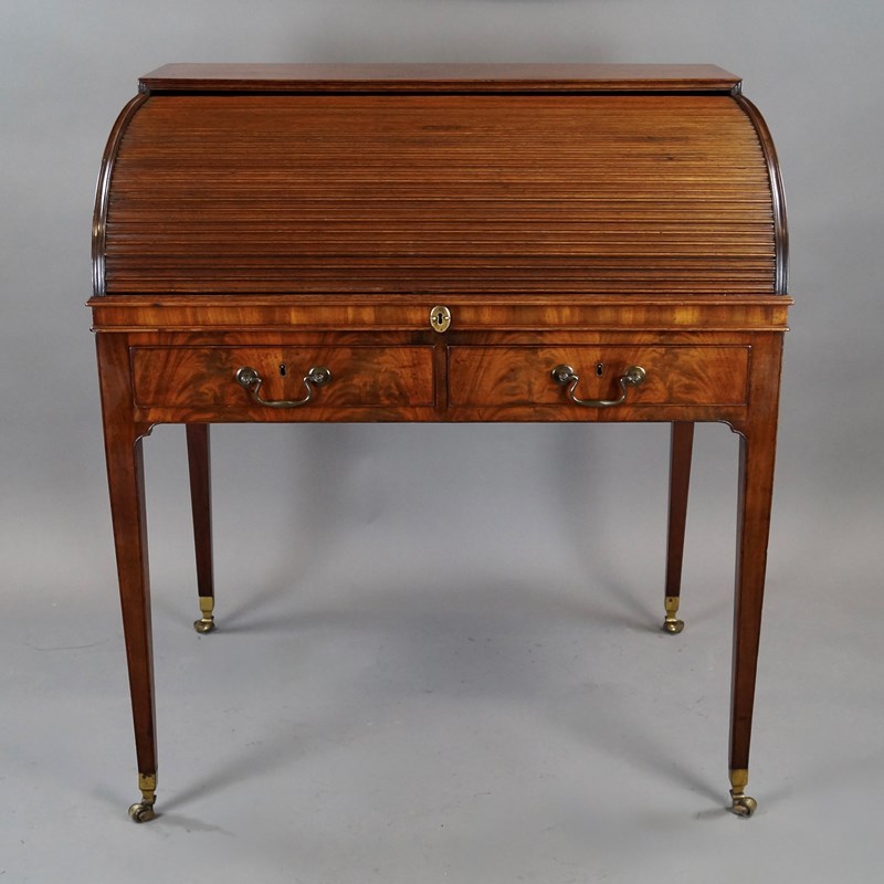 A very attractive George III flame mahogany roll top desk. Raised on square tapered legs with original shaped brass castors and at the top, re-entrant corners. The frieze consists of two drawers to the front and to either side one drawer and one dummy, all with original swan neck handles and working locks. The tambour top rolls opens to reveal an interior of pigeon holes and drawers with a slide out desk and rising leather writing surface. In excellent and original condition and with an excellent colour and waxed patina. 1000mm high, 890mm wide and 640mm deep. English. Circa 1790.