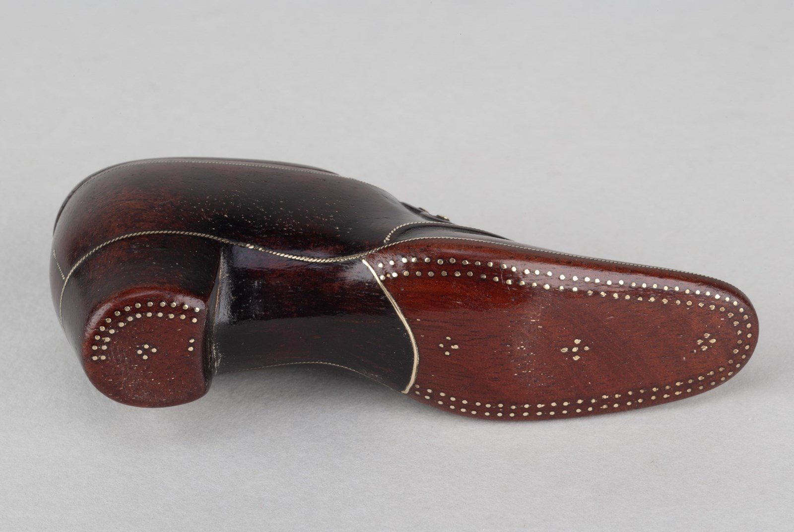 Made with a cobblers' know how, the pins to the shoe's sole authentically positioned whilst a twisted and flattened wire make a good job of suggesting the shoe's welt seam. Three buttons securely hold over the shoe's vamp.