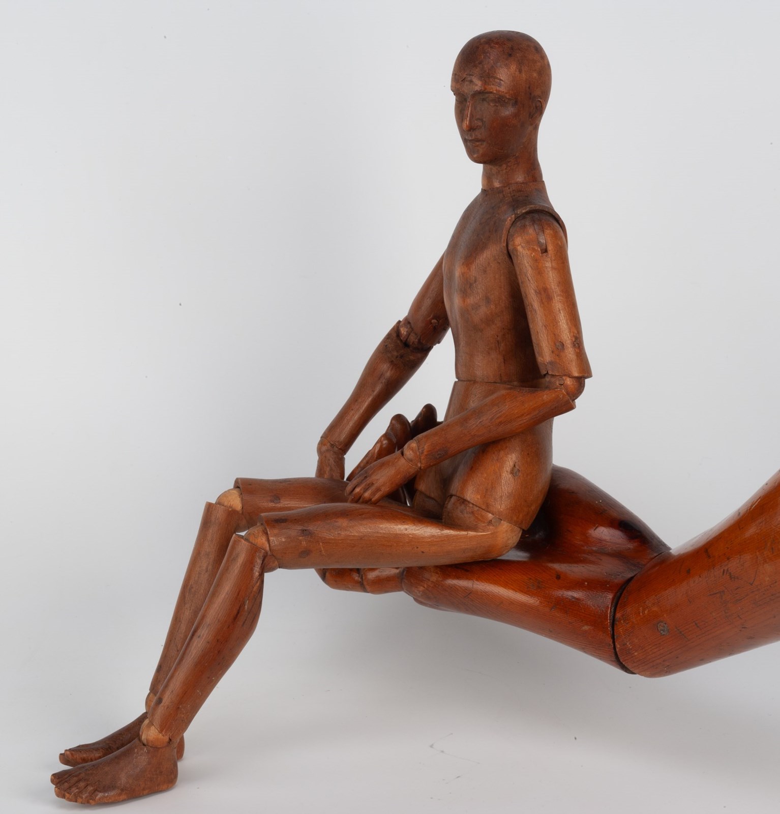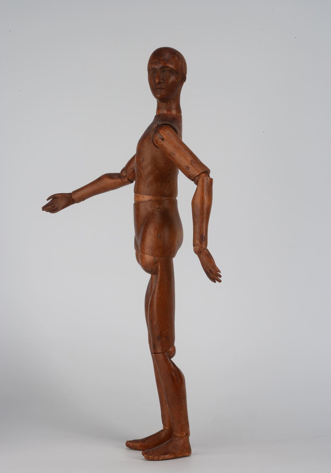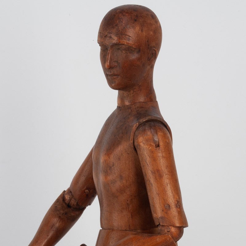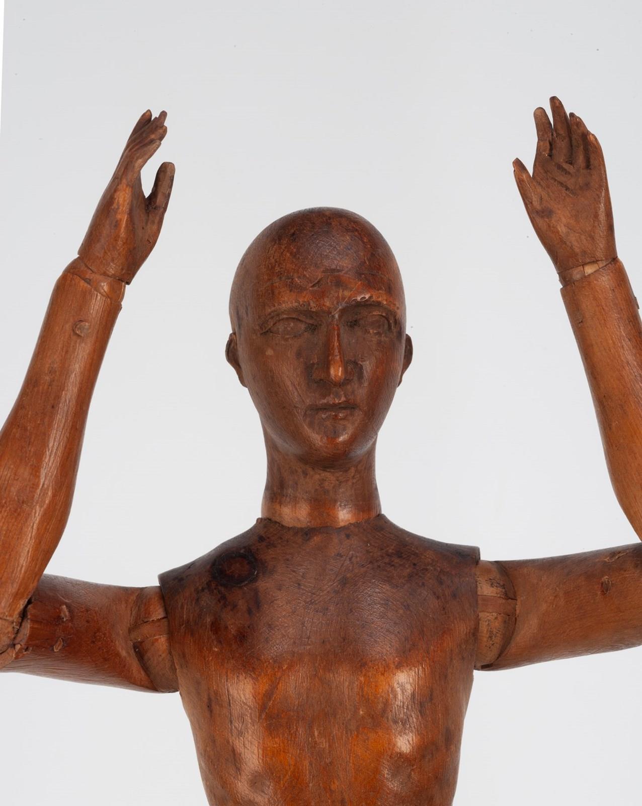 A fine French artists' lay figure made from fruitwood, with finely detailed carving to the face, feet and hands.