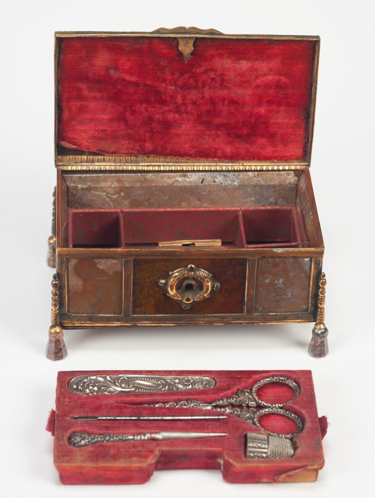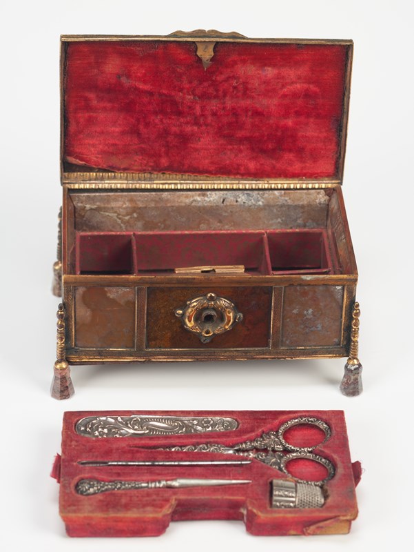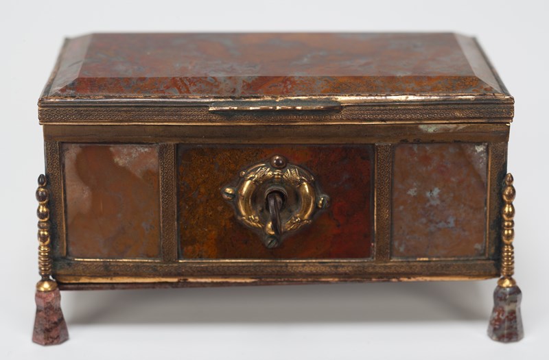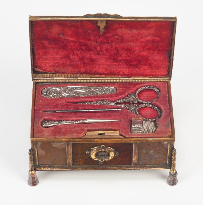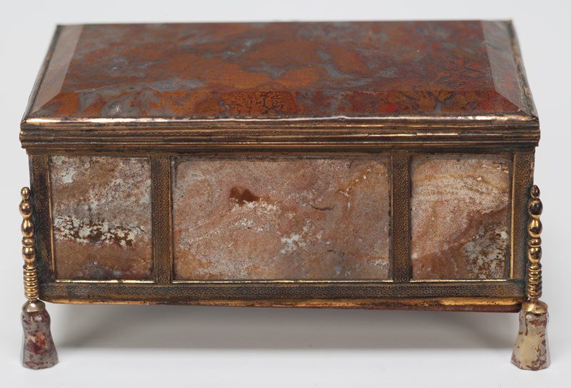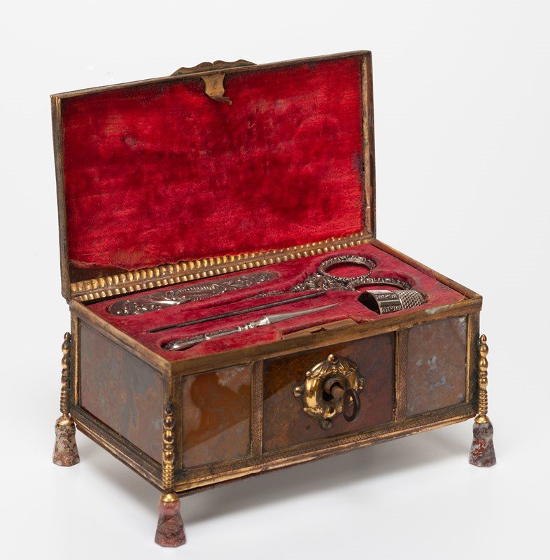 Early to mid 19th century Austro-Hungarian sewing box made of polished agate panels set within a machine engraved and gilded brass frame with escutcheon, lock and key; standing on four matching agate feet cut to resemble tassels. Within is a lift-out tray holding sewing tools; scissors, bodkin, thimble, large needle and a folding knife. This last item, evidently original to the box, is stamped on the blade James Rodgers, beneath a crown and V.R.; the company using this mark around 1840.