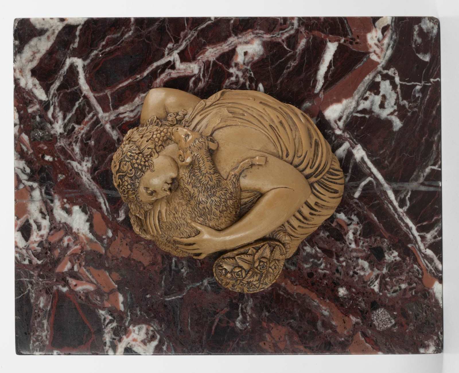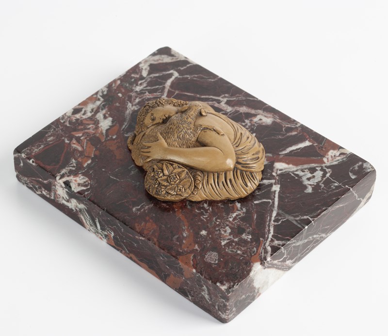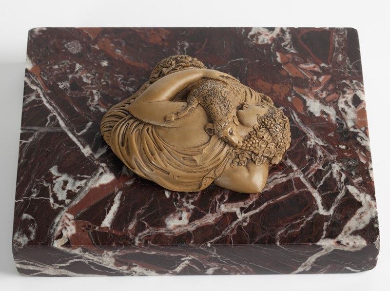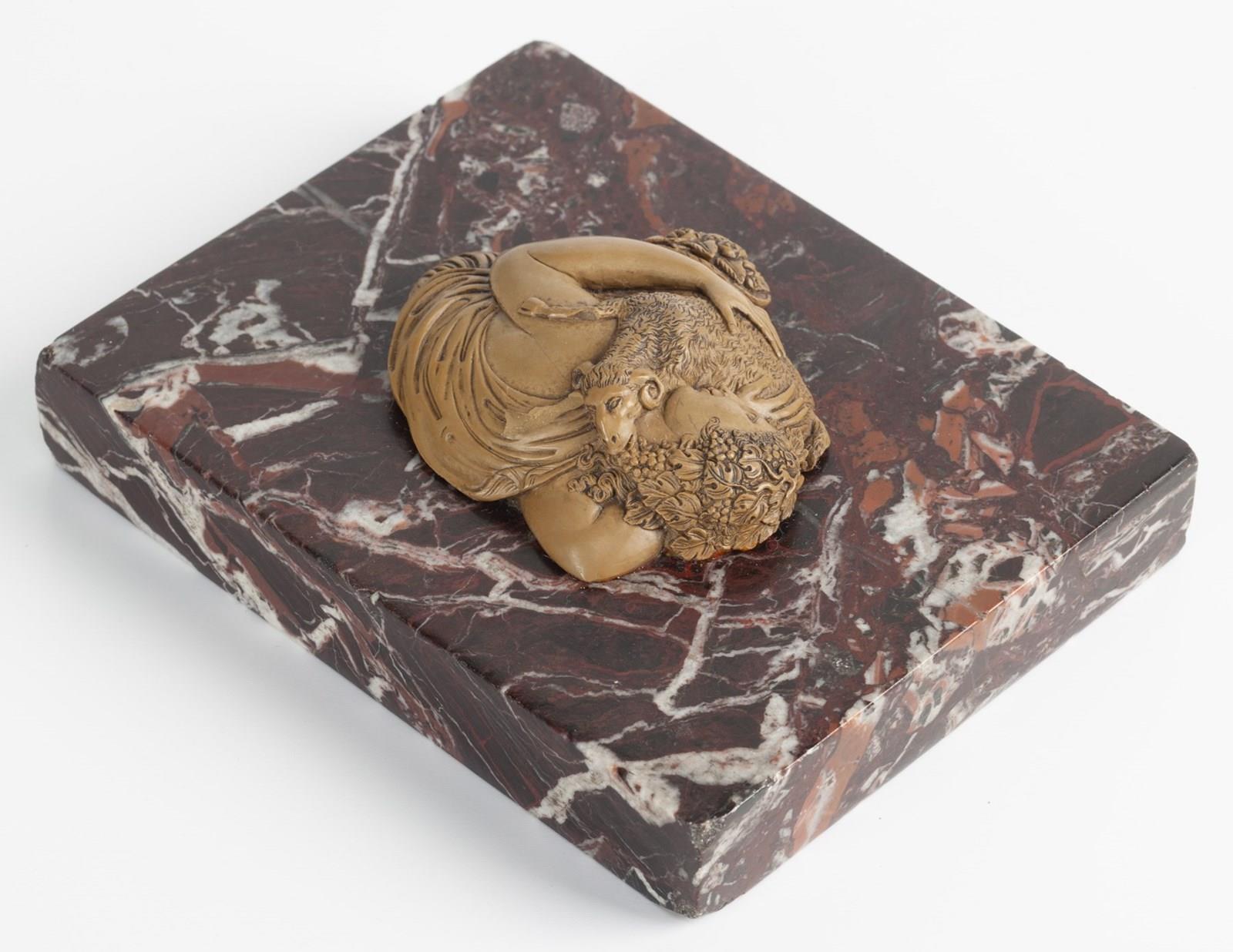 A fine cameo carved from limestone, commonly referred to as 'lava', depicting Bacchante with a Ram mounted as a paper weight on a piece of Breccia marble.
