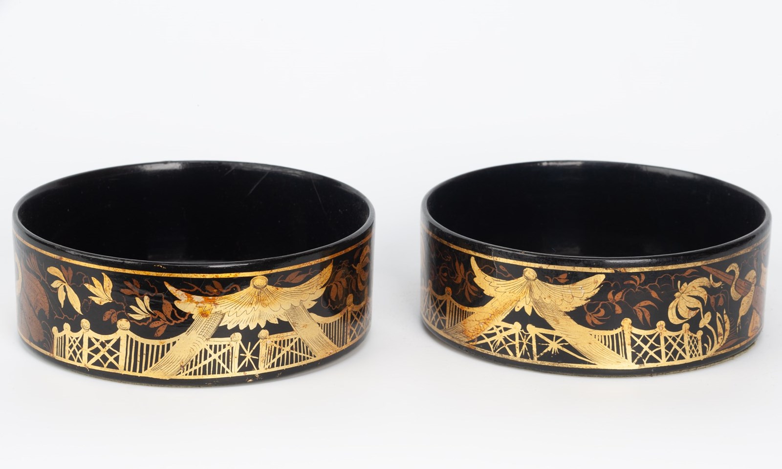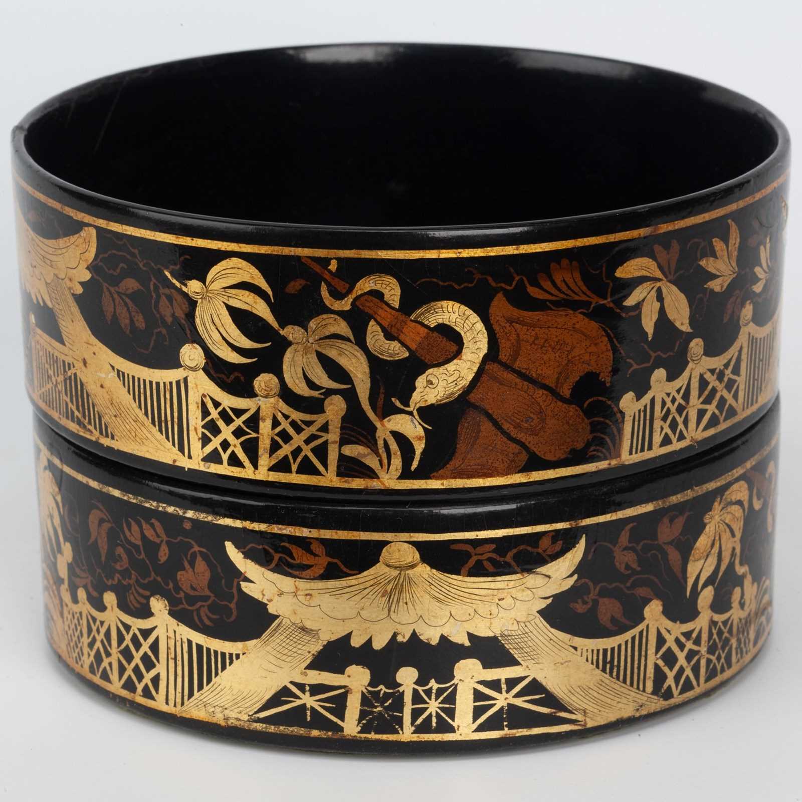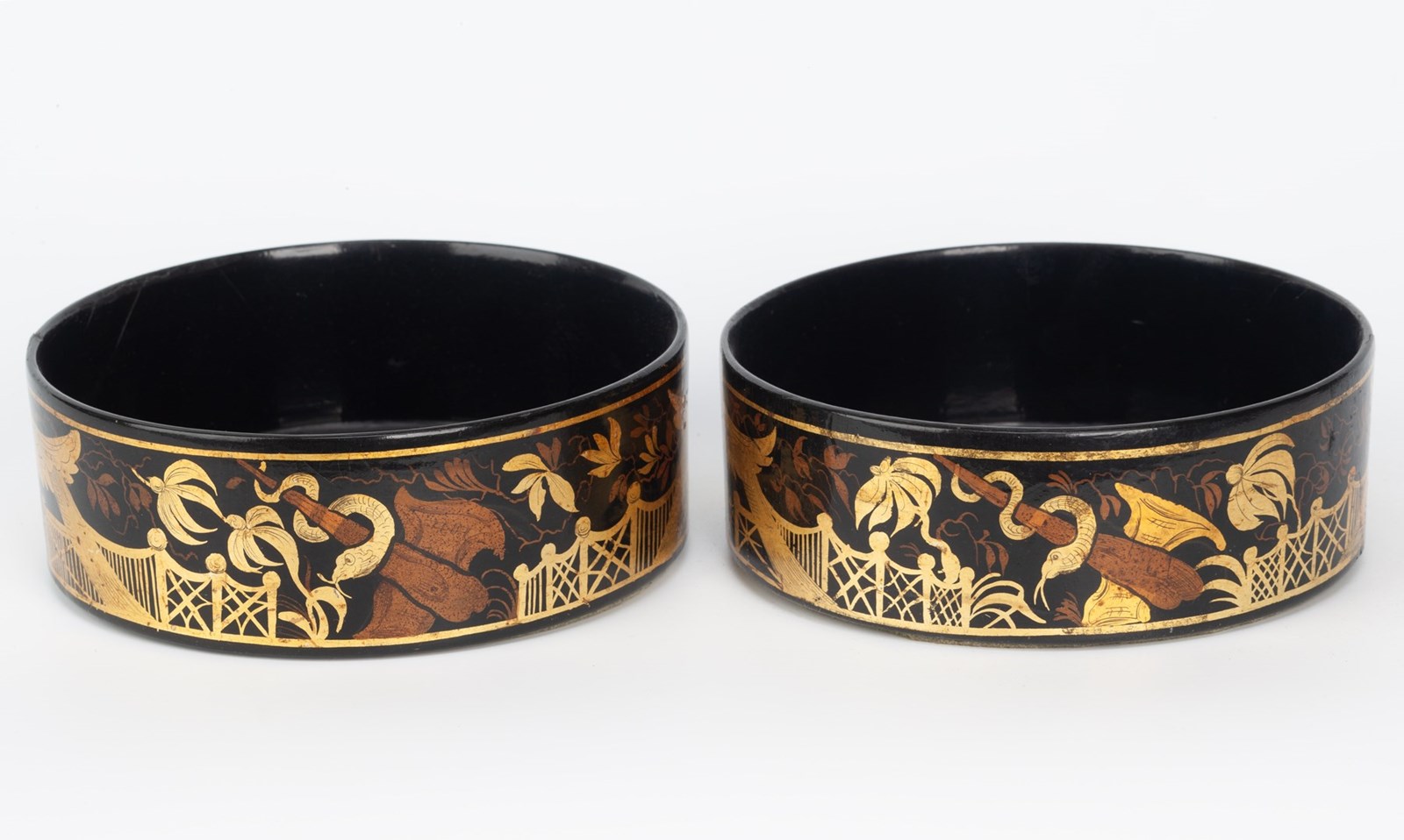 A fine pair of Regency period papier mâché bottle or decanter coasters, decorated around with a design of Chinese style fencing, the design often encountered in blind frets on mahogany furniture of the Georgian period, with a gazebo, palm trees and a serpent wrapped around a club. Probably made by Henry Clay at his London Factory around 1820.