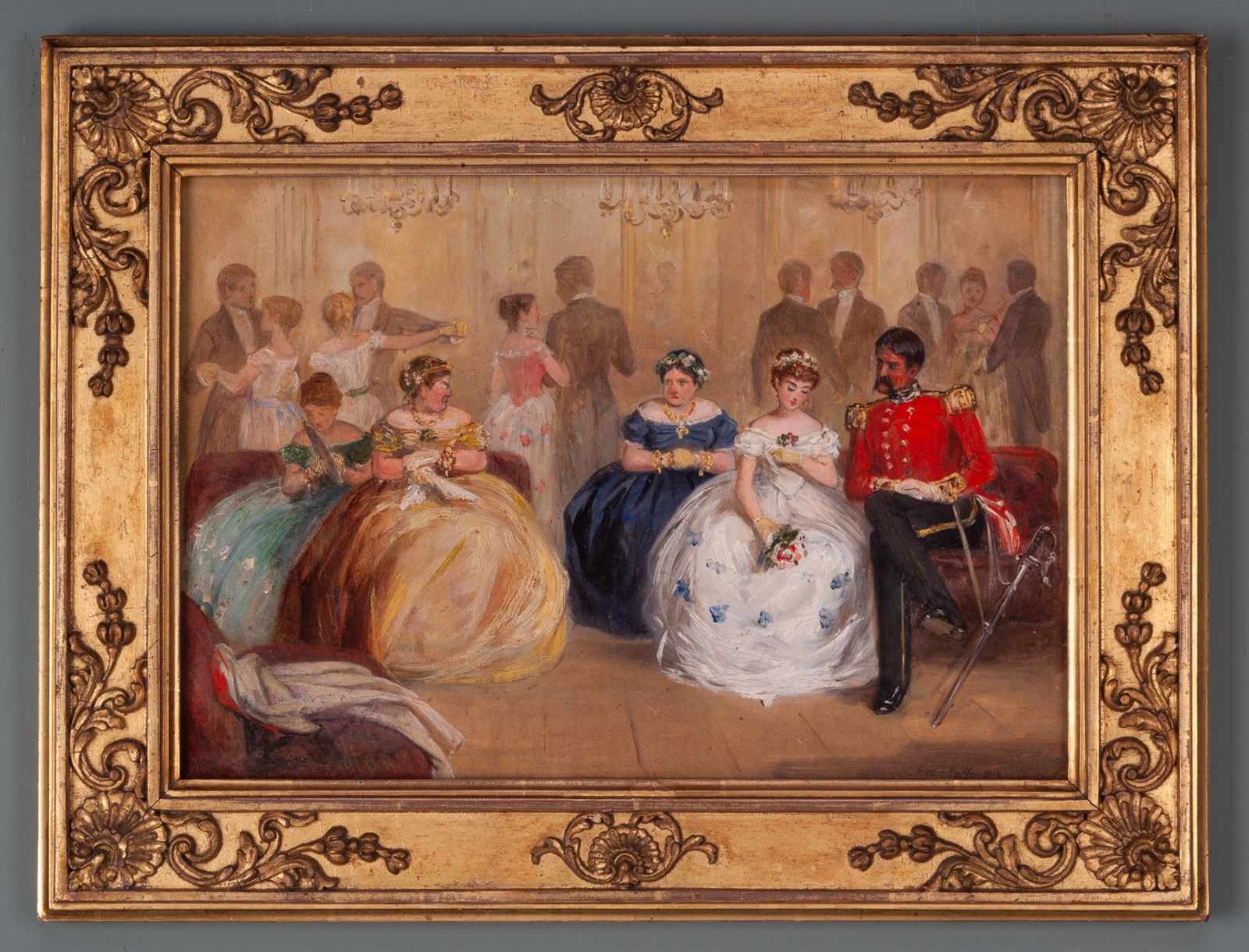 An amusing painting, executed in oil on artists' board by C.W Nicholls RHA, offering something of a play on the fairy tale of Cinderella at the ball. The dashing prince, an officer of the First Life Guards, engages in conversation with his 'Cinderella' whilst the two ugly spinster stepsisters glower on disapprovingly.