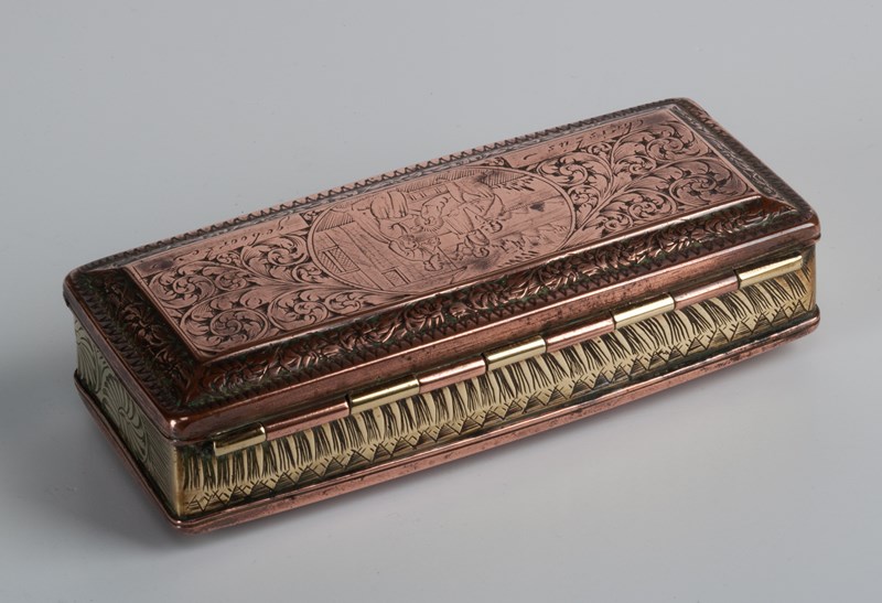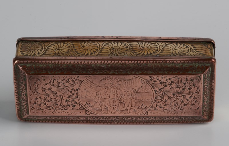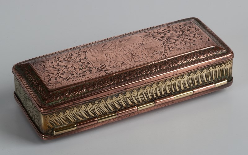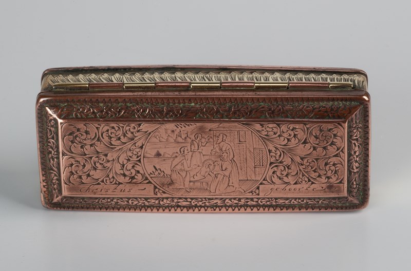 Dutch tobacco box engraved all over with a brass body and raised copper lid and base, each engraved with scenes taken from the Christmas story. The lid with the nativity outside of the inn; the base with the shepherds receiving the news from the angel.