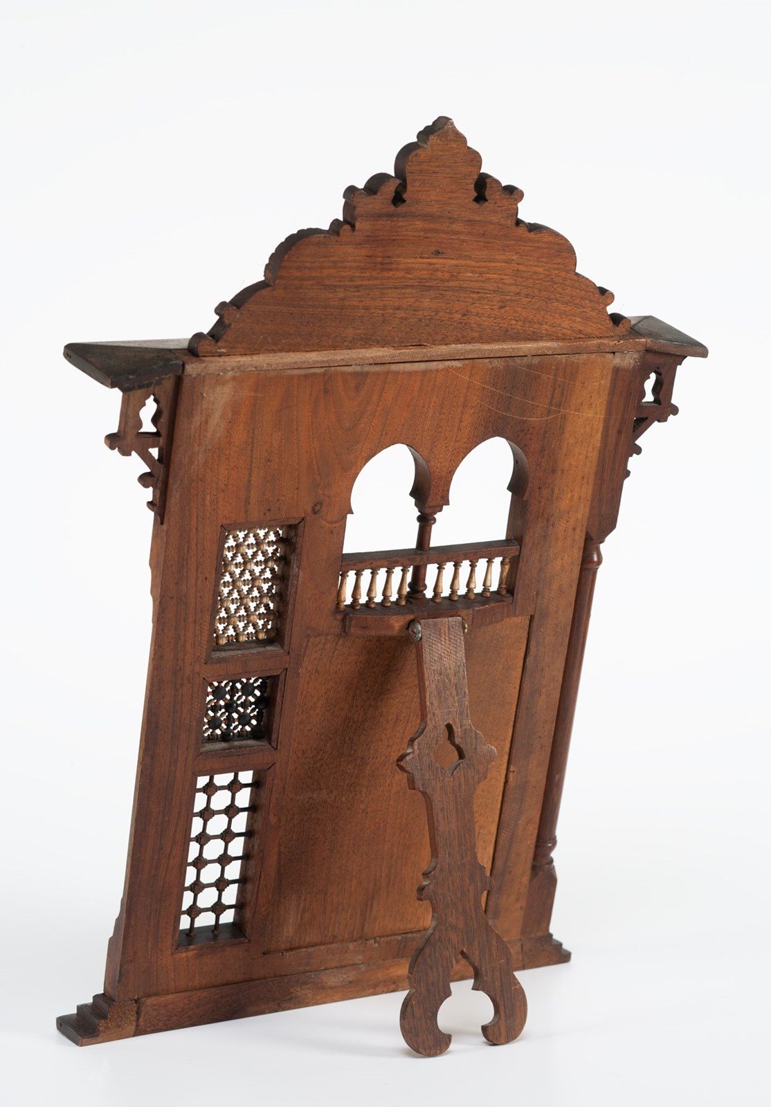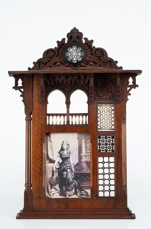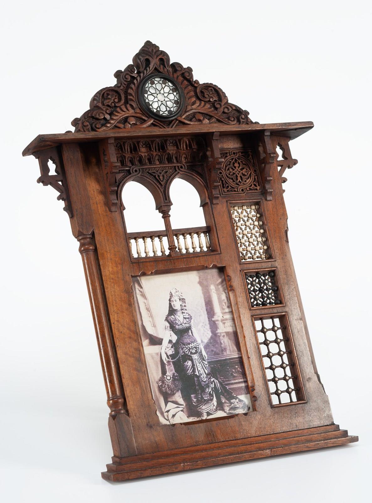 19th century Ottoman photo frame made of walnut and to an architectural design with very finely turned bone and wood panels, a carved pediment with an inlaid Ottoman geometric mother-o-pearl roundel and further carved wood panels and architectural details.