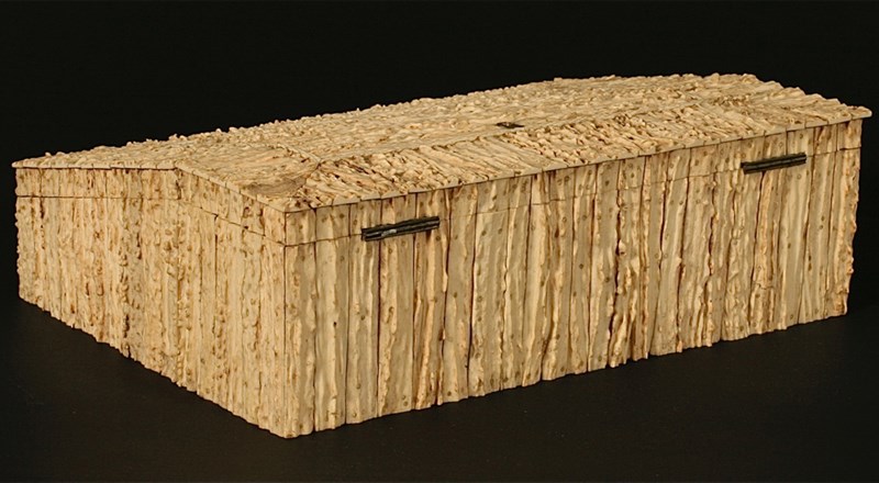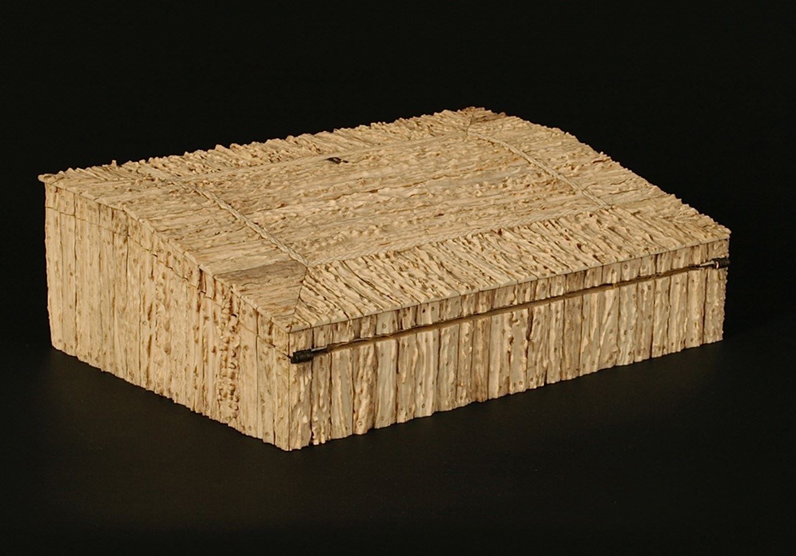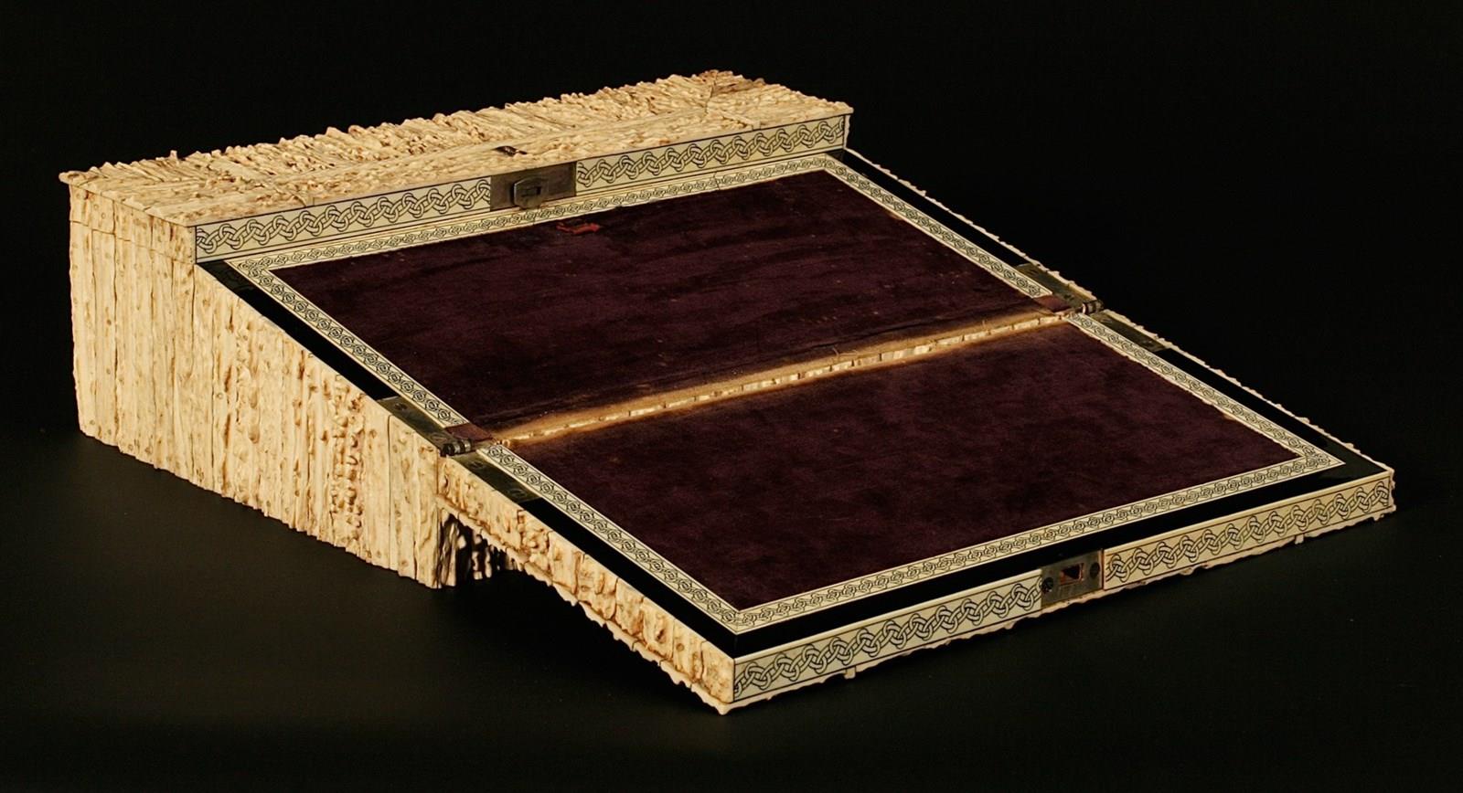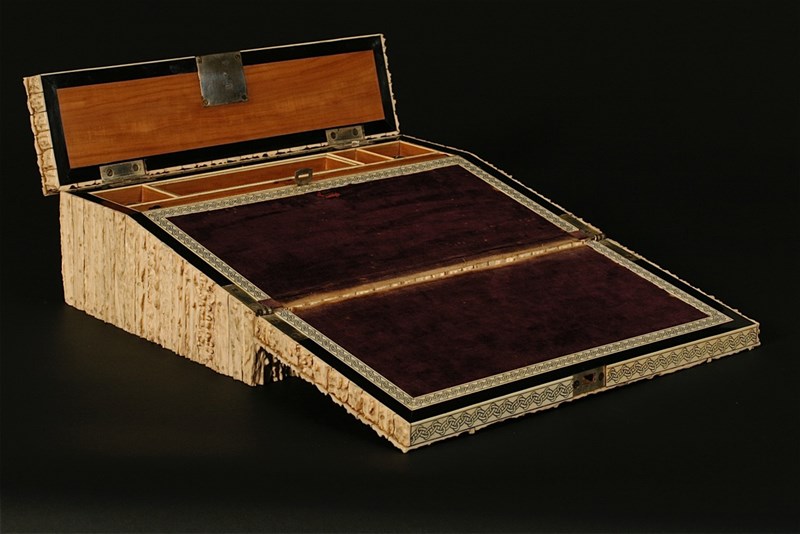 Early 19th century lap desk of bleached elk horn, the interior sandalwood with black horn edging.