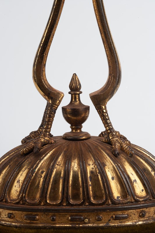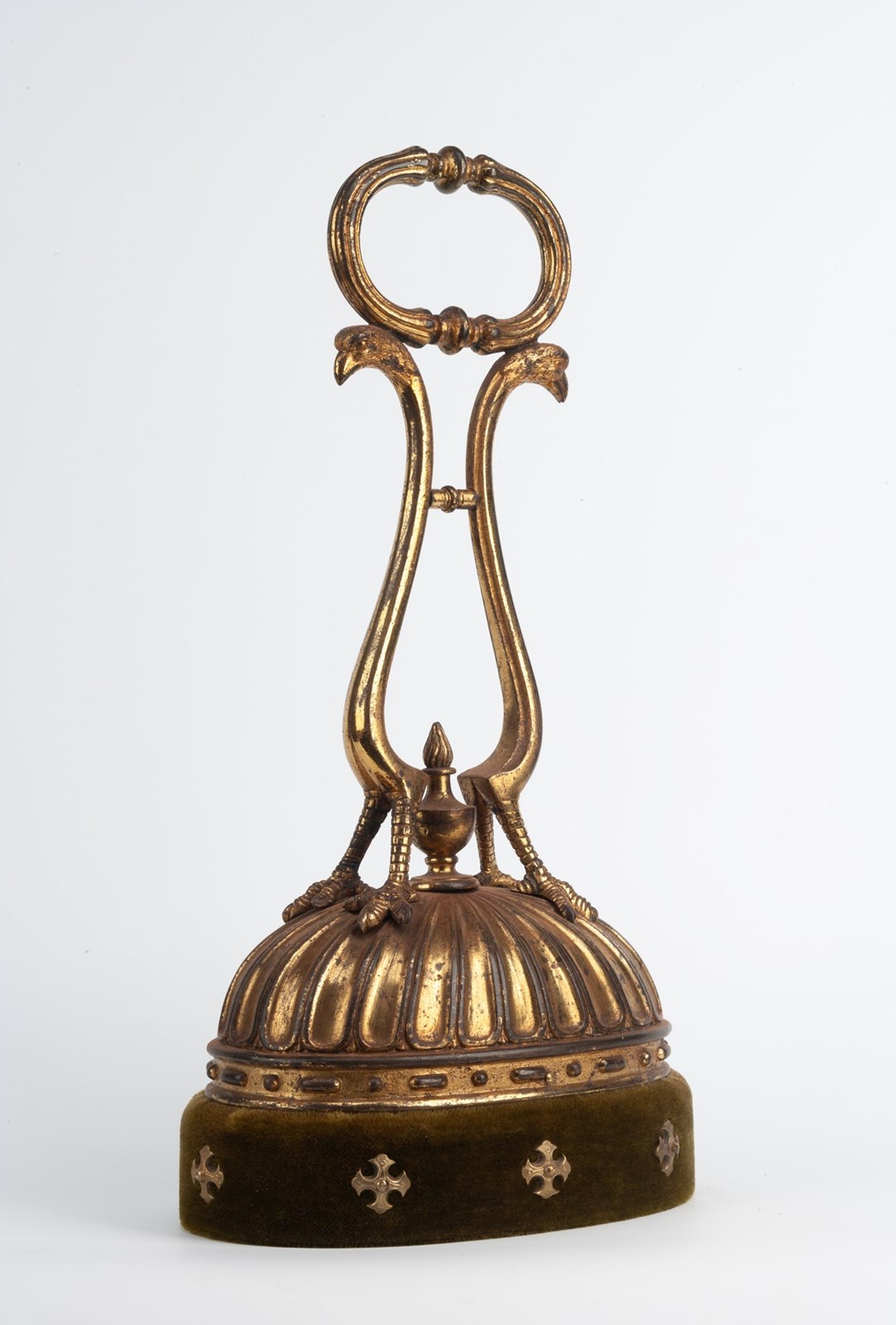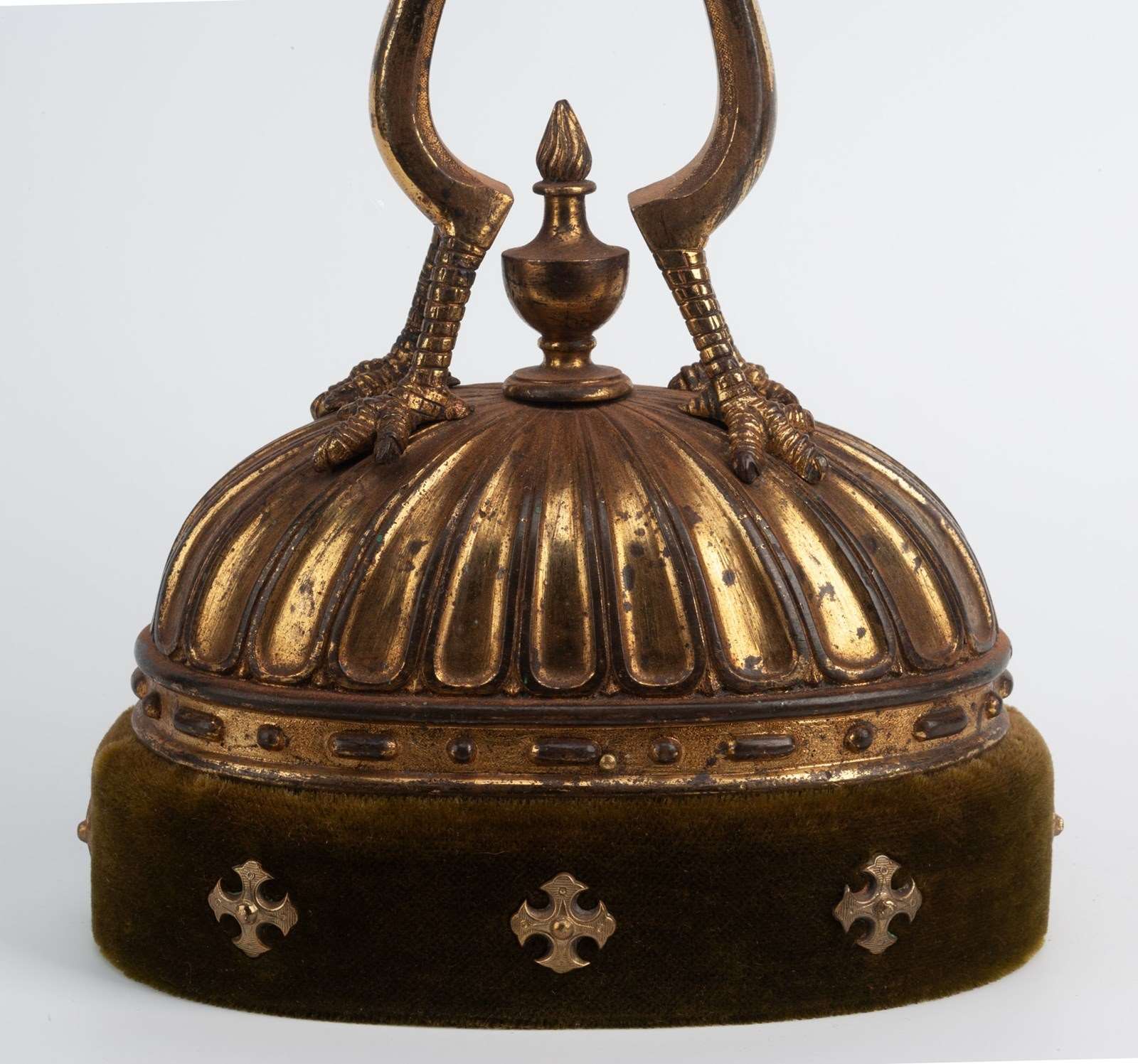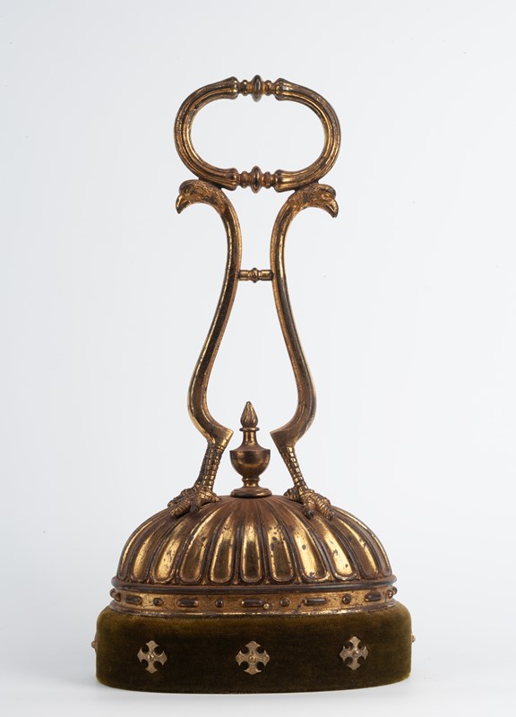The design being as a gentleman's fob seal, cast in brass and retaining, unpolished, much of the original gold-tinted lacquer together with the frosted chasing and bright burnished contrast. Mounted on a green velvet covered base decorated with pressed and gilded upholsterer's nails.