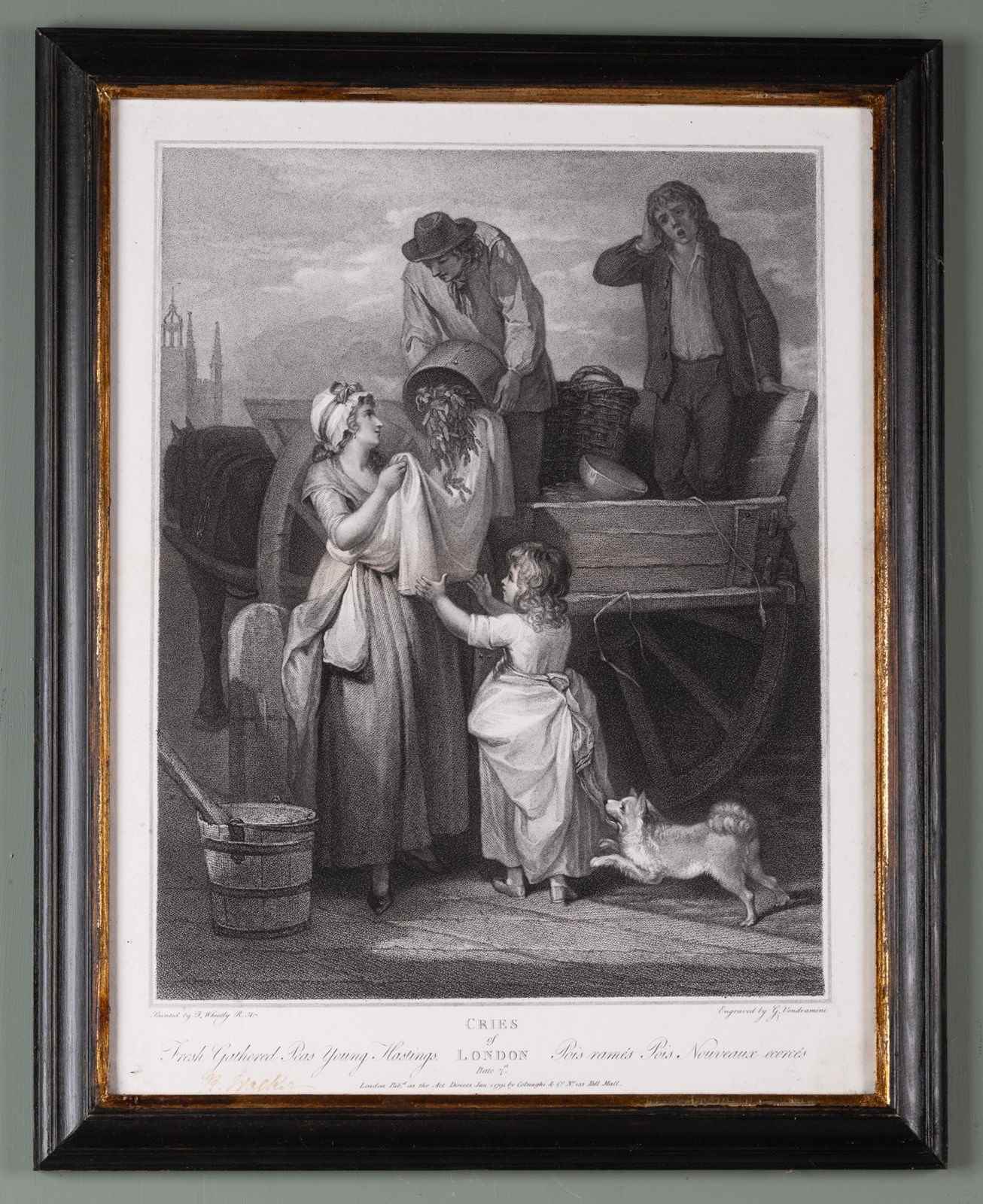 Plate 7 from the first and most famous series of ‘London Cries’ produced by Colnaghi & Co after the works by Francis Wheatley, exhibited by him at the Royal Academy between 1792 and 1794 and published by them from 1795; this plate in January of that year. All respectfully record the working Londoners who would make their living on the streets, calling their ‘cries’ as they went, from sale to sale; job to job. This plate showing a vendor of ‘Fresh Gathered Peas Young Hastings’; the word ‘hastings’ derived or corrupted from hasty, hastily grown; new and young; not old and starchy. Fourteen works by Wheatley were exhibited over the period and to great acclaim, such that Colnaghi quickly agreed to publish the group as a suite, dropping one from the eventual set, which were sold individually or in a portfolio collection of thirteen. The prints were stipple engraved by some of the best and most highly regarded engravers of the Georgian period, this plate by Giovanni Vendramini; others by Thomas Gaugain or Luigi Schiavonetti. It is interesting to note that complete collections of the "Cries" remained immensely popular, and by 1910 they were fetching more at auction than even James Audubon's folio "Birds of America". Within a replica of a Georgian period print frame. o.s:15 in x 18.75 in