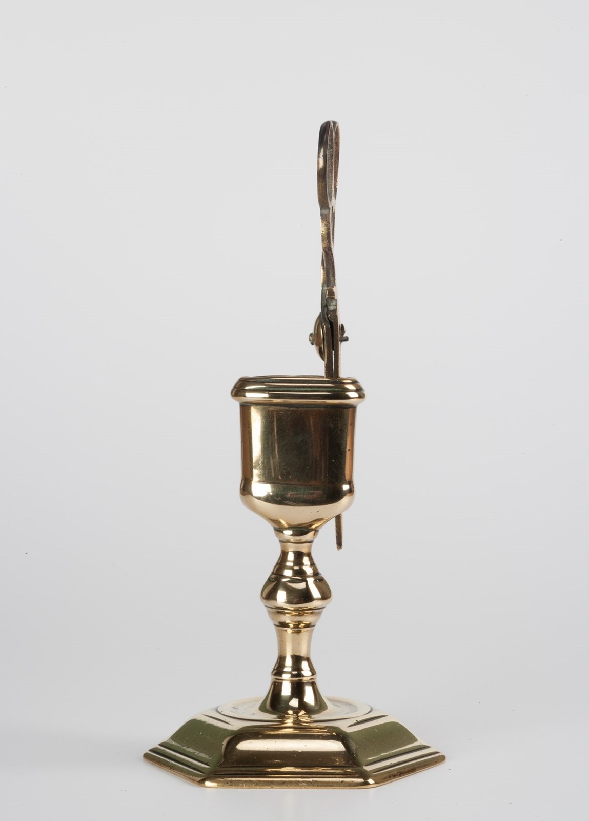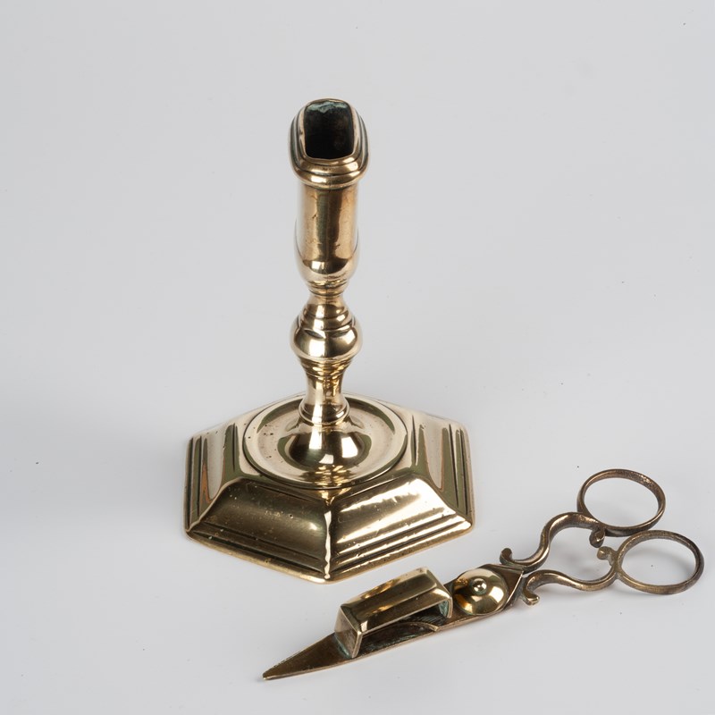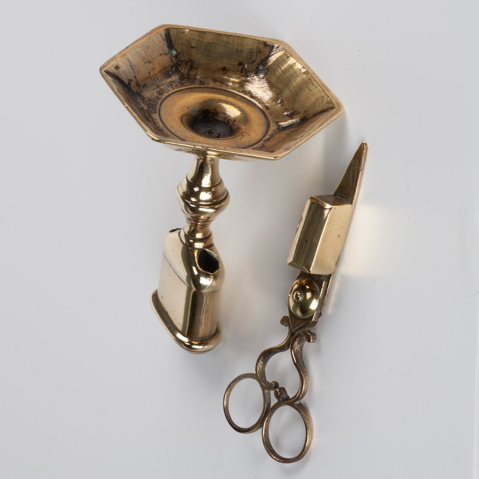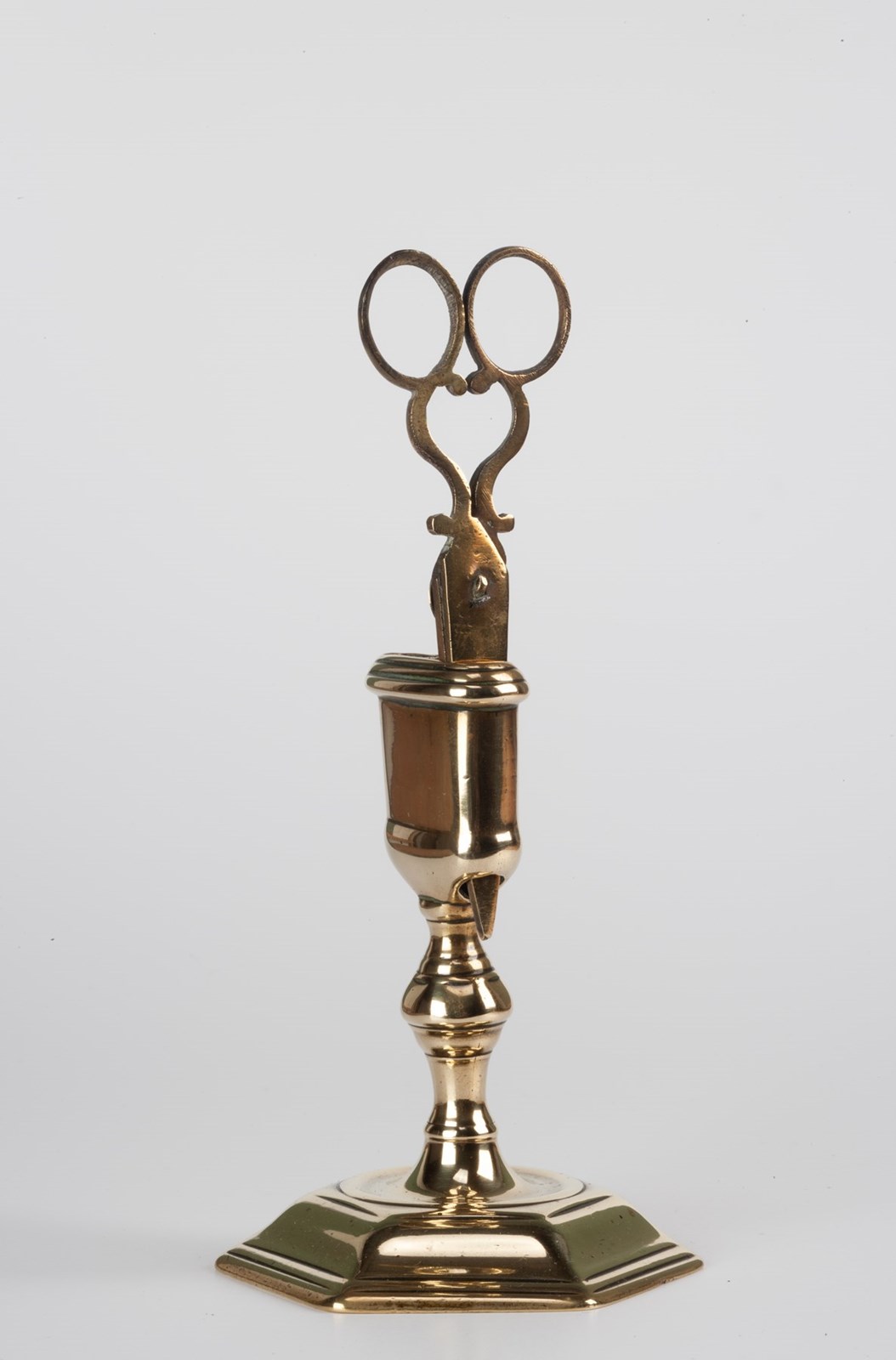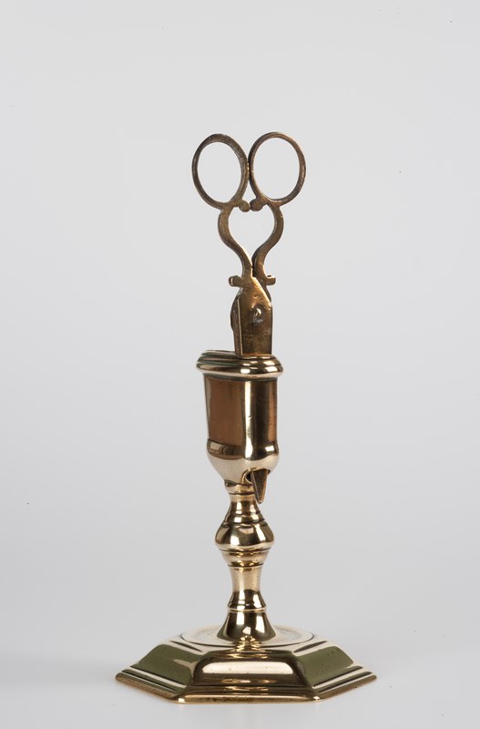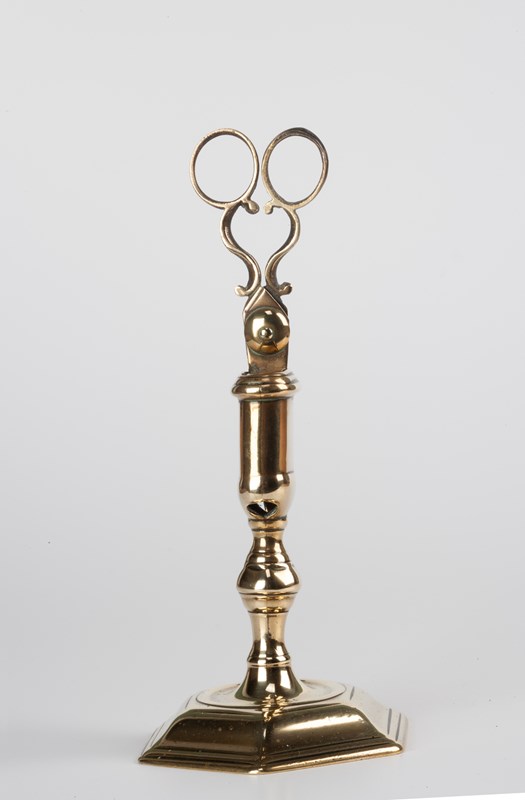 Rare George I/II brass snuffers and stand, the scissor-like snuffers "constructed to cut off the excrescence which accumulates on the wick of the candle during combustion, retaining the snuff in a box or cavity".