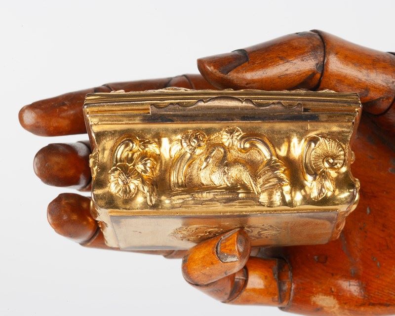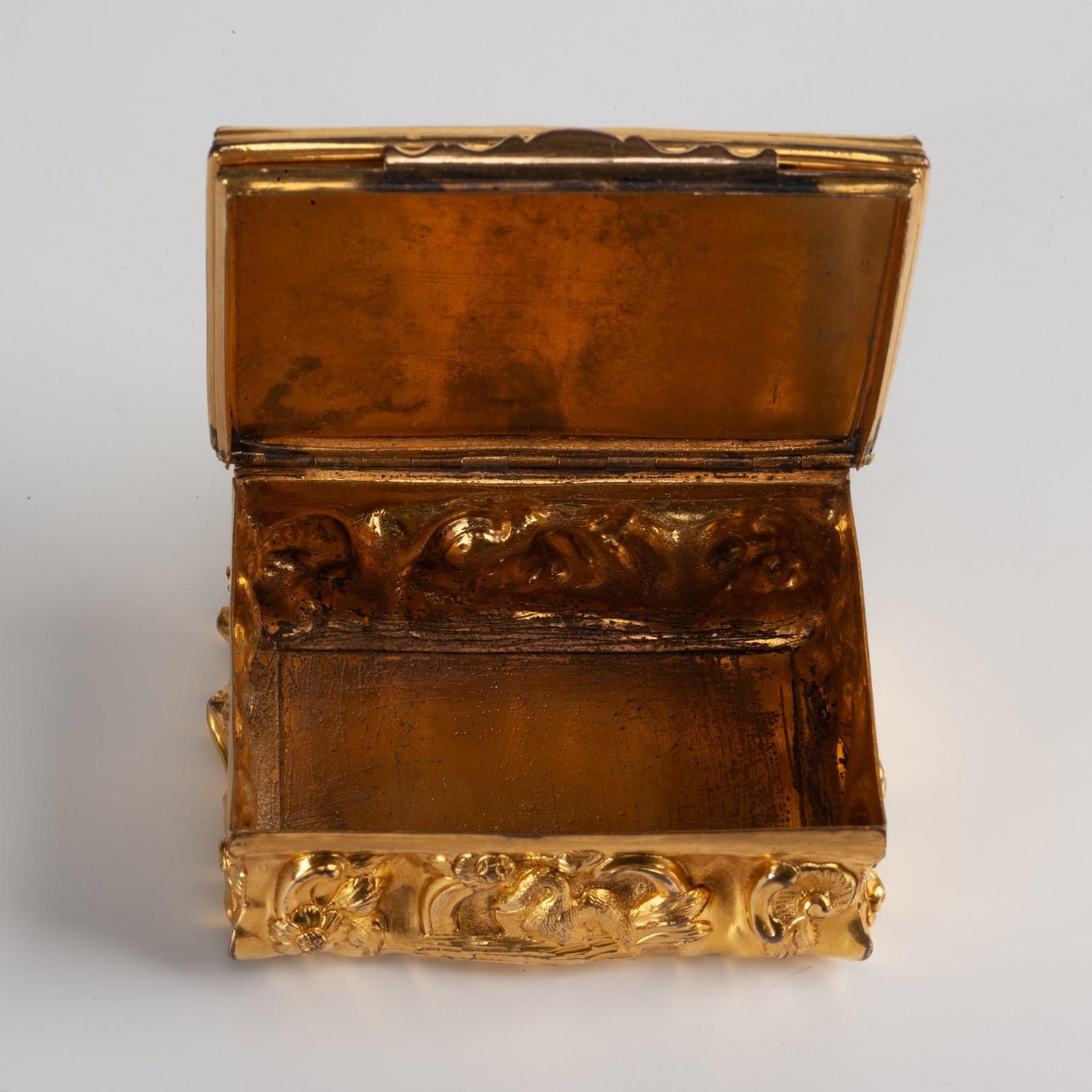 The lid stamped with a French theatrical scene, perhaps after a work by Gravelot or Ravenet, the base made of two pairs of panels; front and back with a swan on the water with shell and flowers, the sides with flowers. All produced with considerable depth, burnished and chased to great effect.