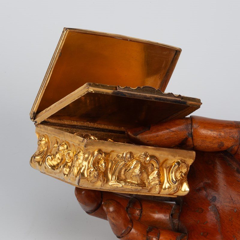 The lid is constructed with a concealed panel, presumably made to hide a miniature, probably erotic, painting. All produced with considerable depth, burnished and chased to great effect.