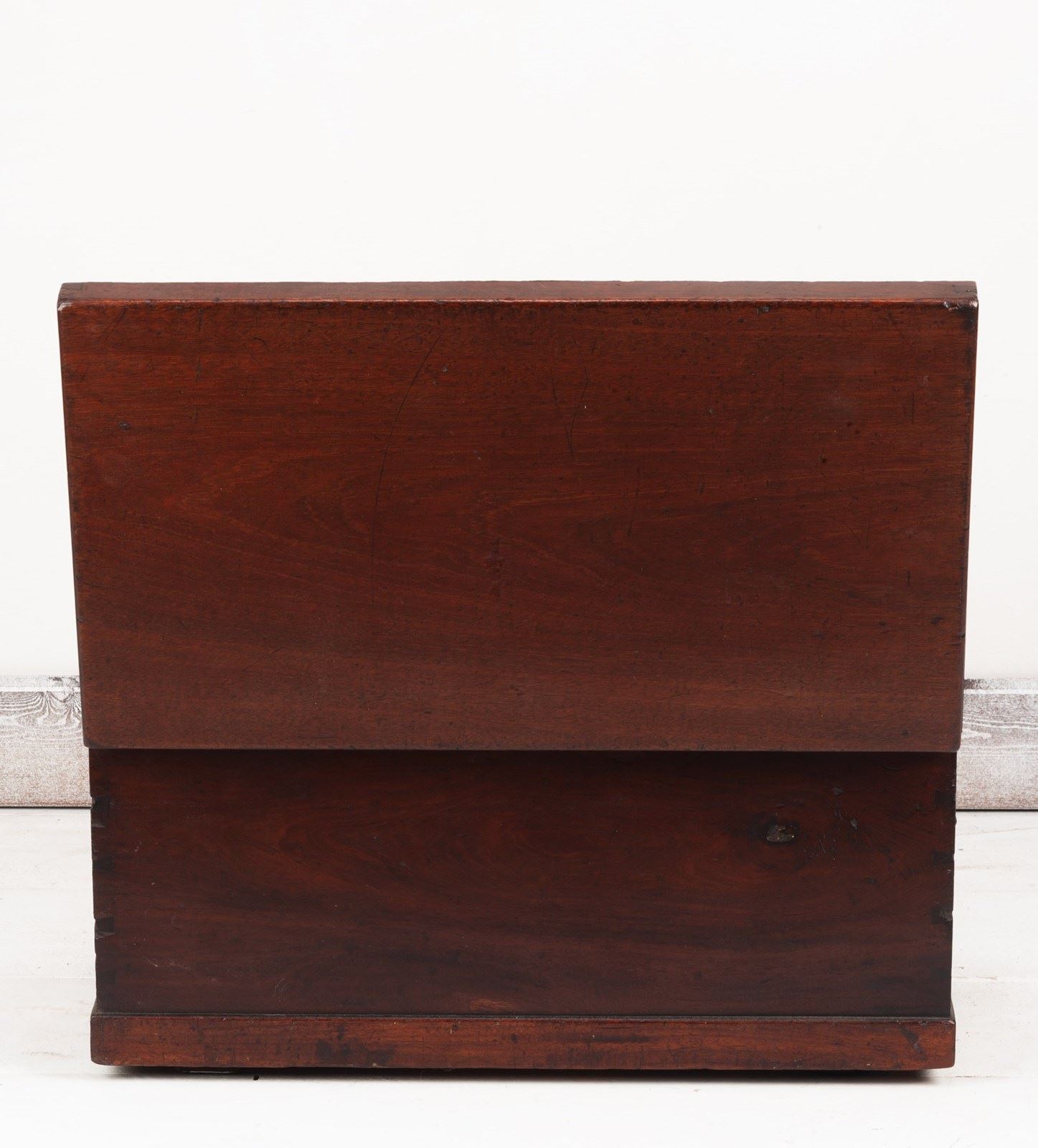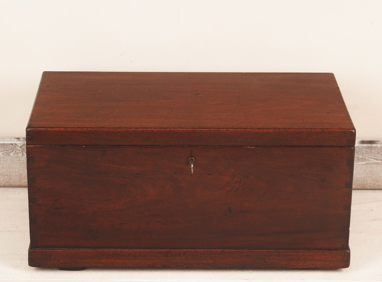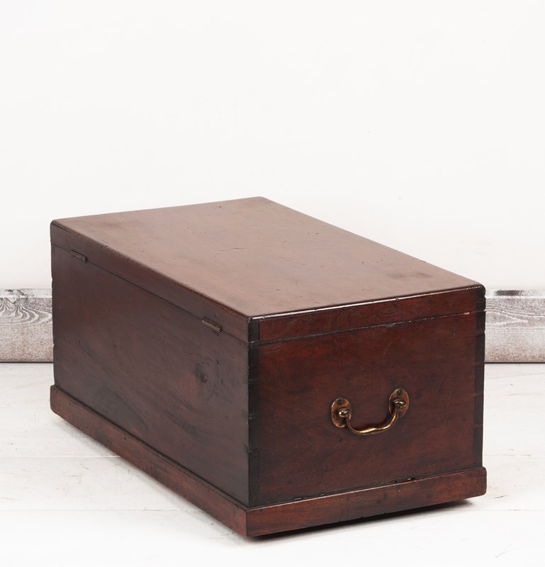 Made from planks of solid mahogany, joined by dovetail joints, clearly and attractively in evidence at each corner, with original brass fittings; lock, drop down handles and hinges, all fixed with steel screws.