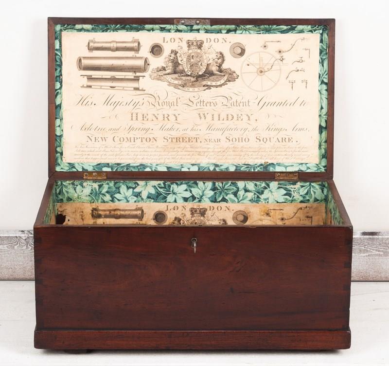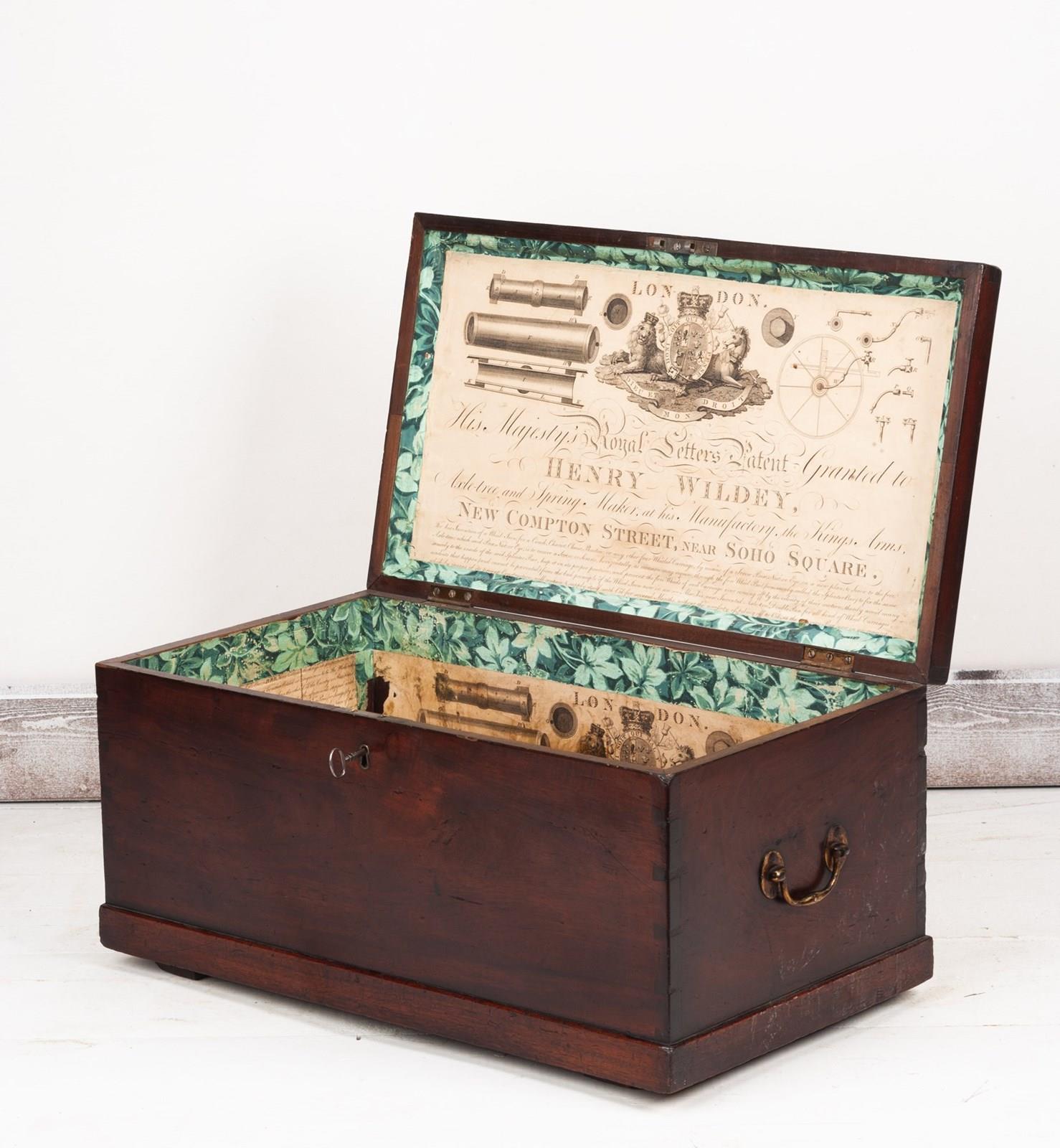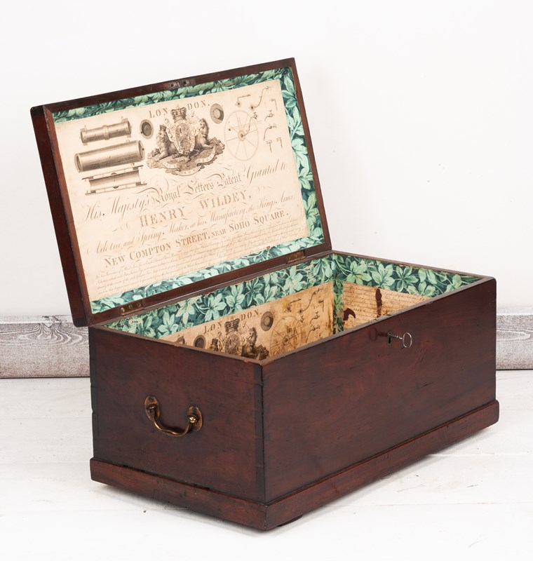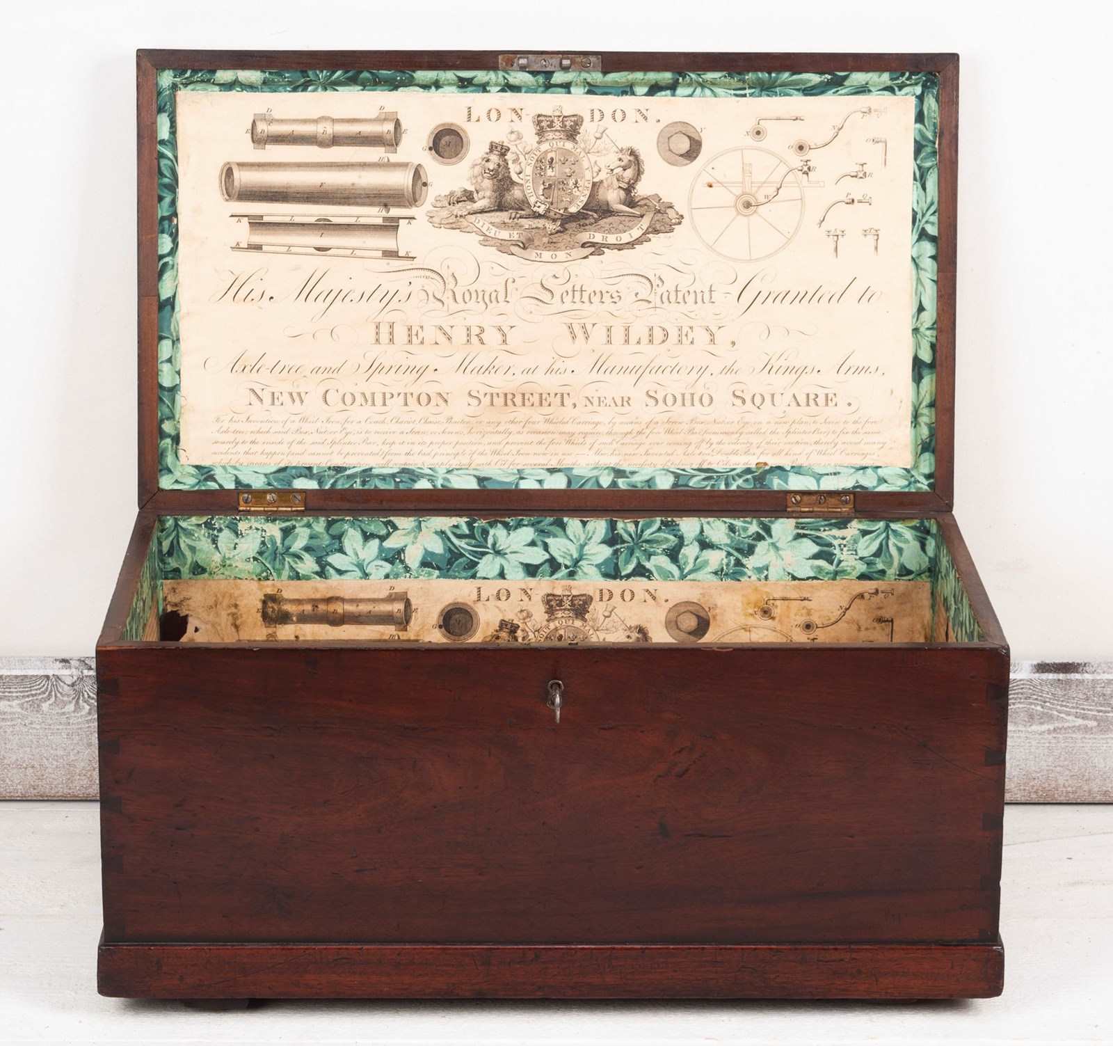 A military campaign silver chest dating from around 1800, most attractively lined with a printed paper for Henry Wildey's patent for a Wheel Iron, the remains of this same printed paper lining the base of the chest.