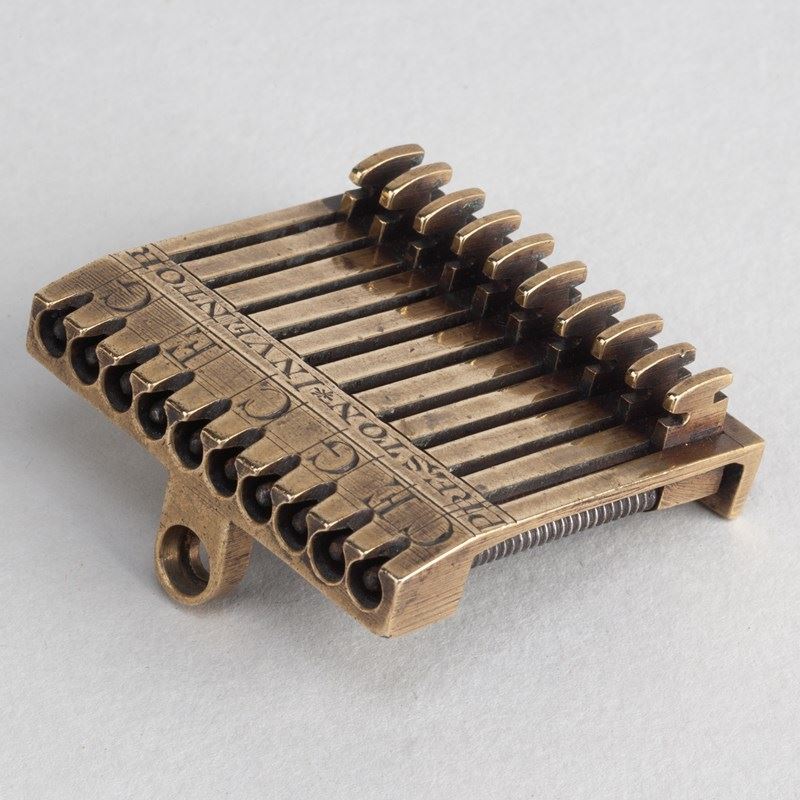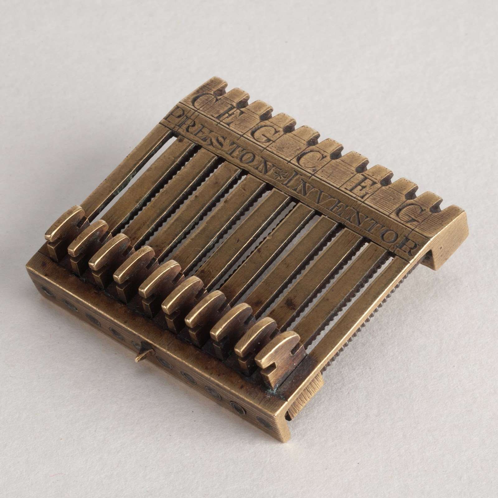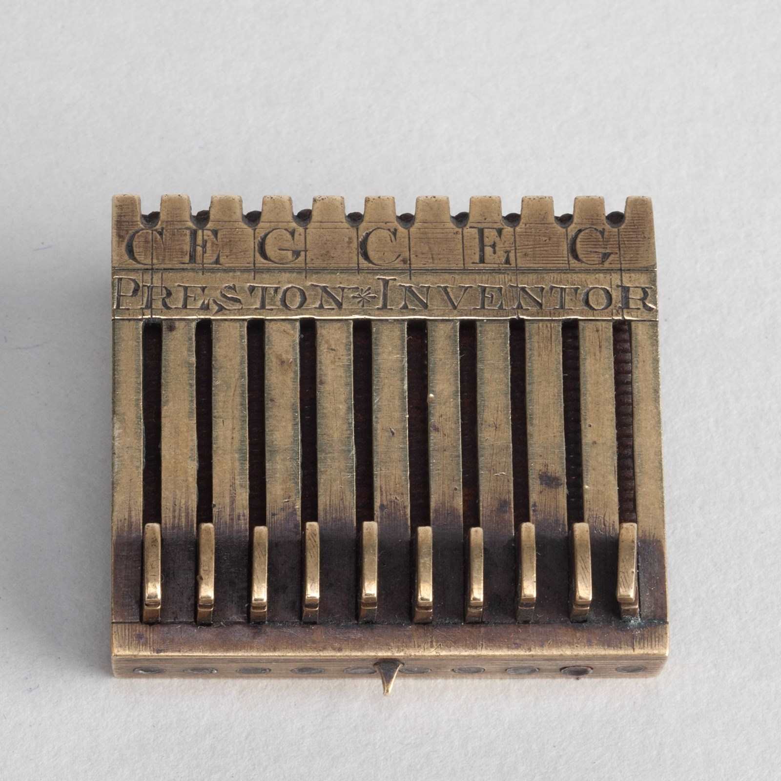 Engraved with the details 'PRESTON INVENTOR'. A tuning device, fixed to the head of an English Guitar or Cittern in order to facilitate fine and accurate tuning.