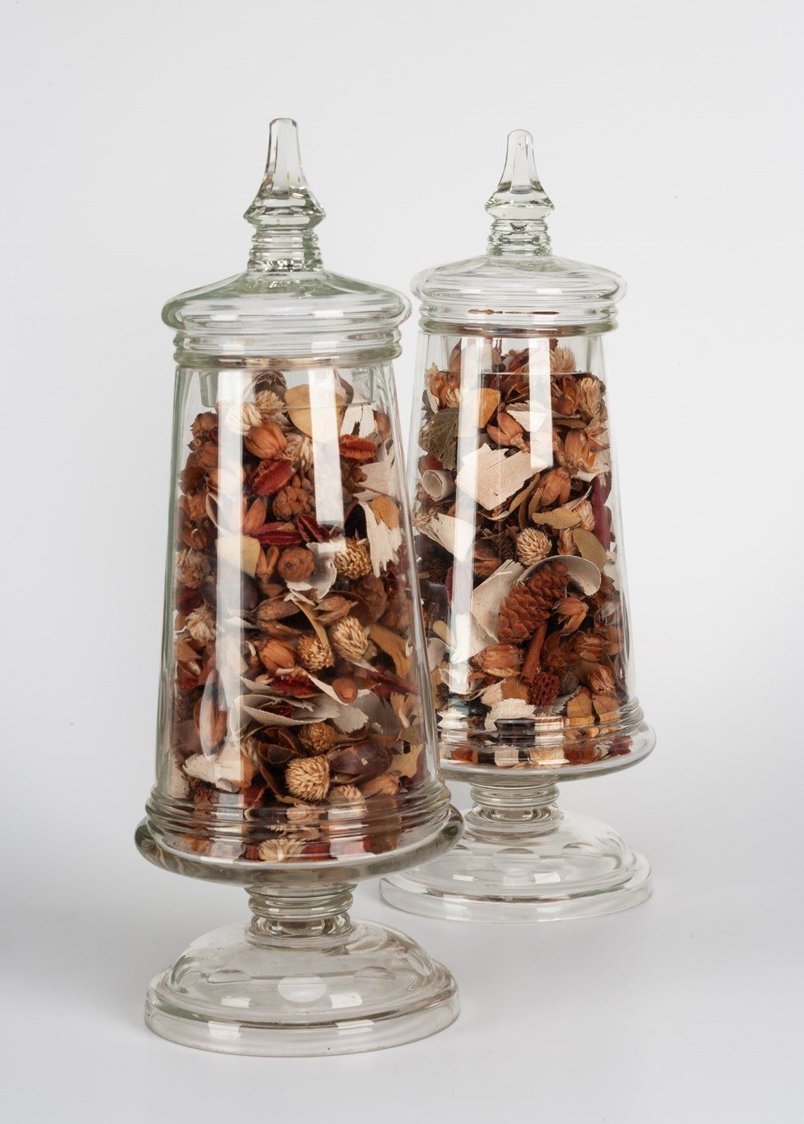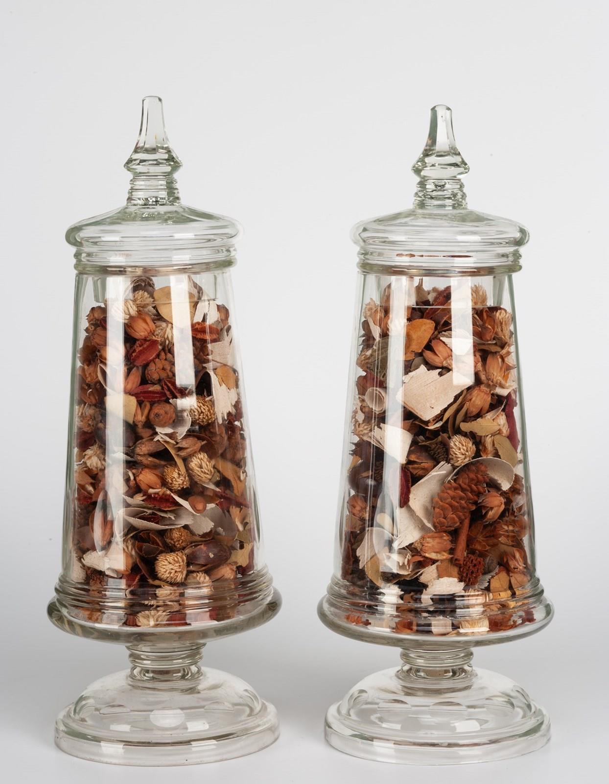 A pair of lidded glass jars standing on a foot with cut dimple decoration, the lids with facetted finials.