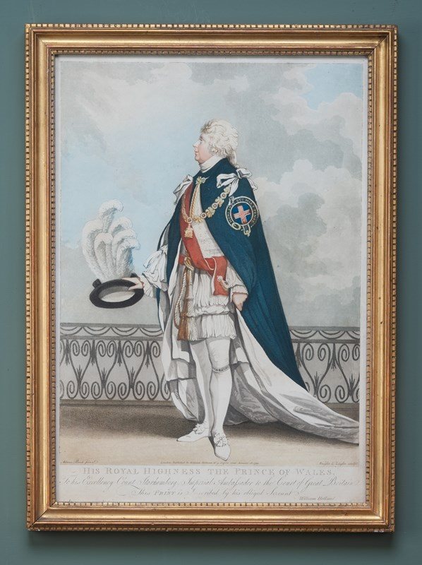 A fine stipple engraving with colour of His Royal Highness The Prince of Wales, engraved by Wright & Ziegler after the original work by Adam Buck. Published by William Holland in January 1799. Within a later, circa 1890, gilded 'Hogarth' fame. o.s:14.5 in x 19.75 in