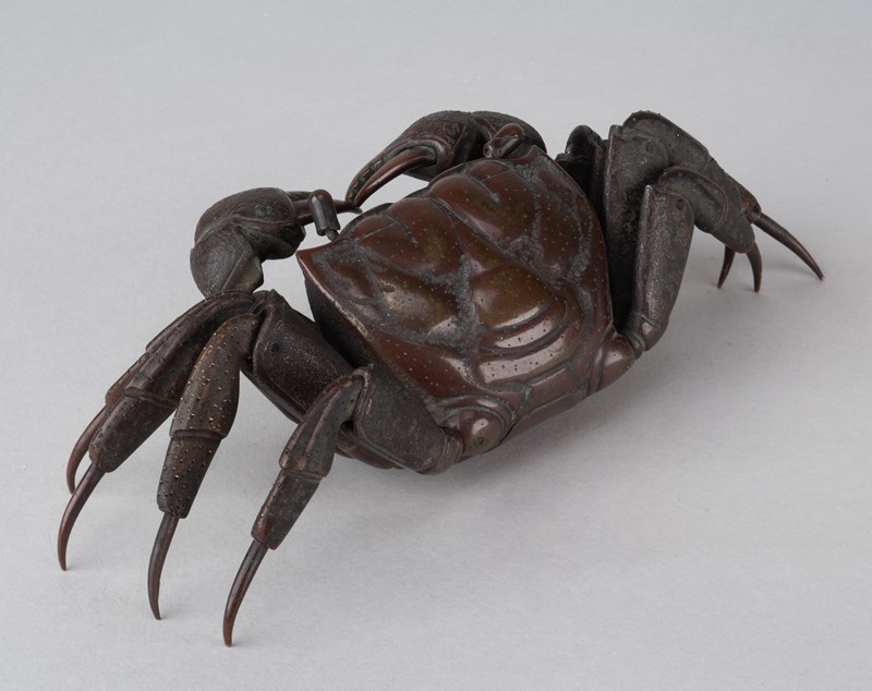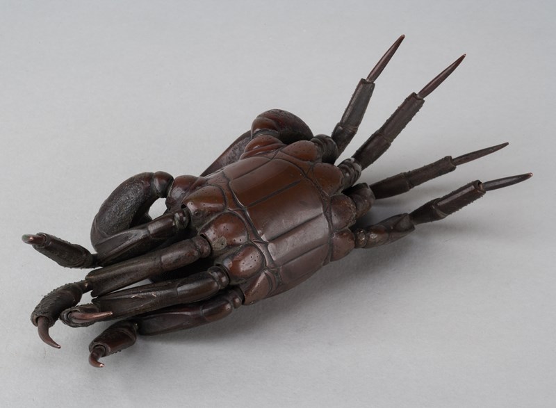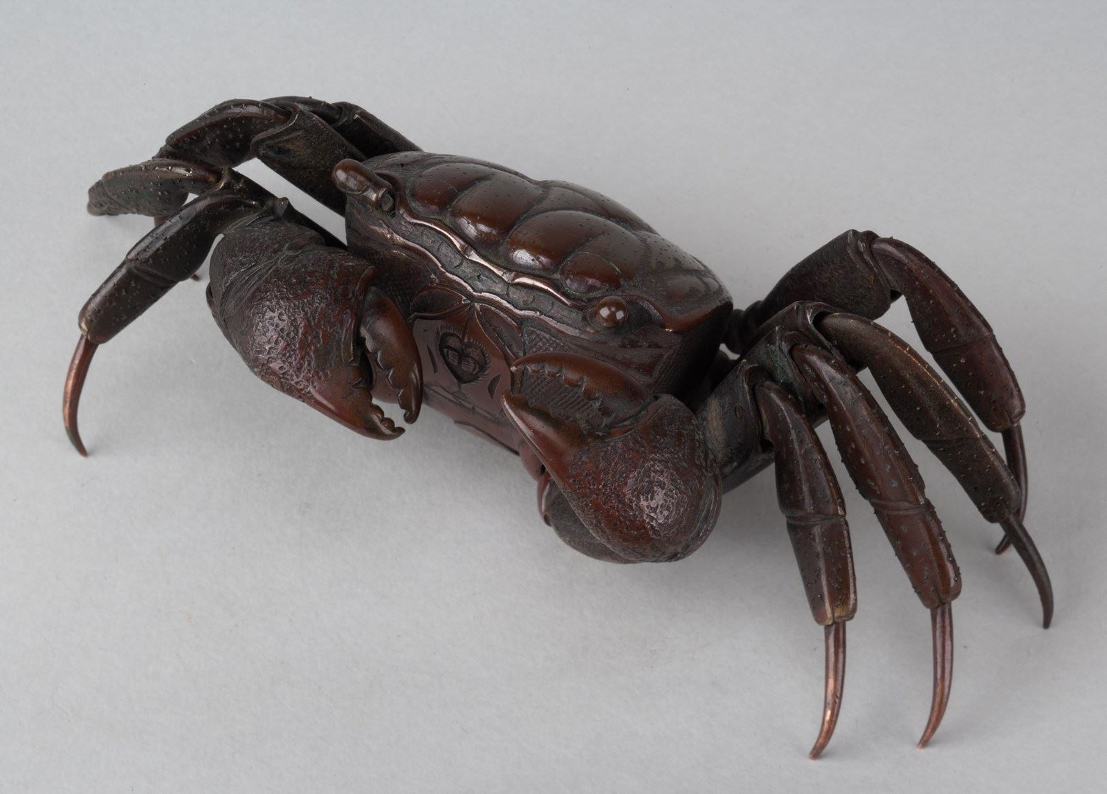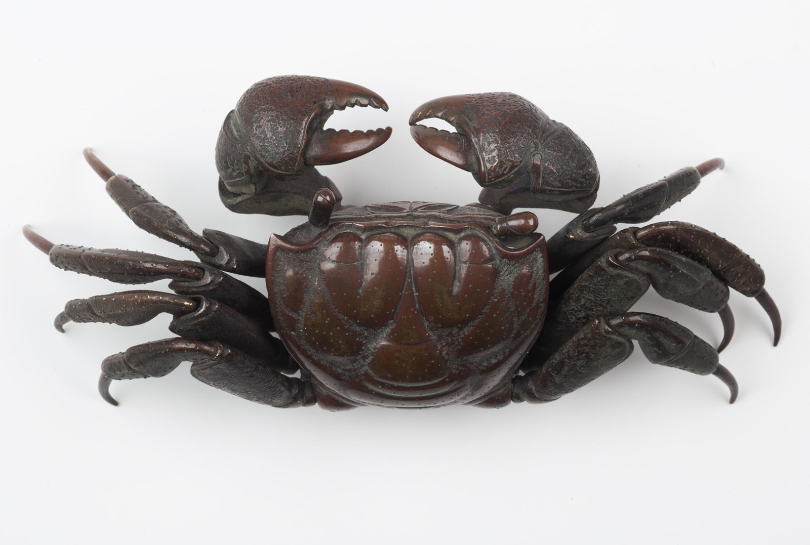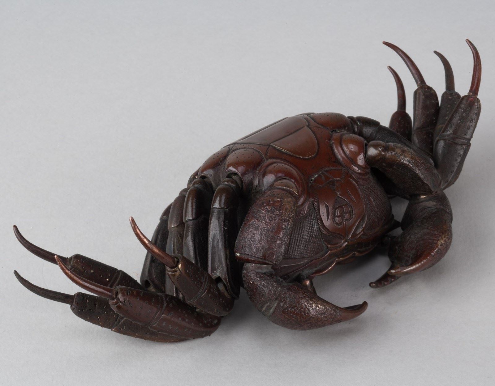 A Meiji period (1868-1912) articulated bronze model of a crab, 32 movable parts emanating from the body of the crab, all meticulously and thereby realistically finished.