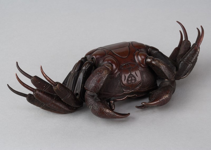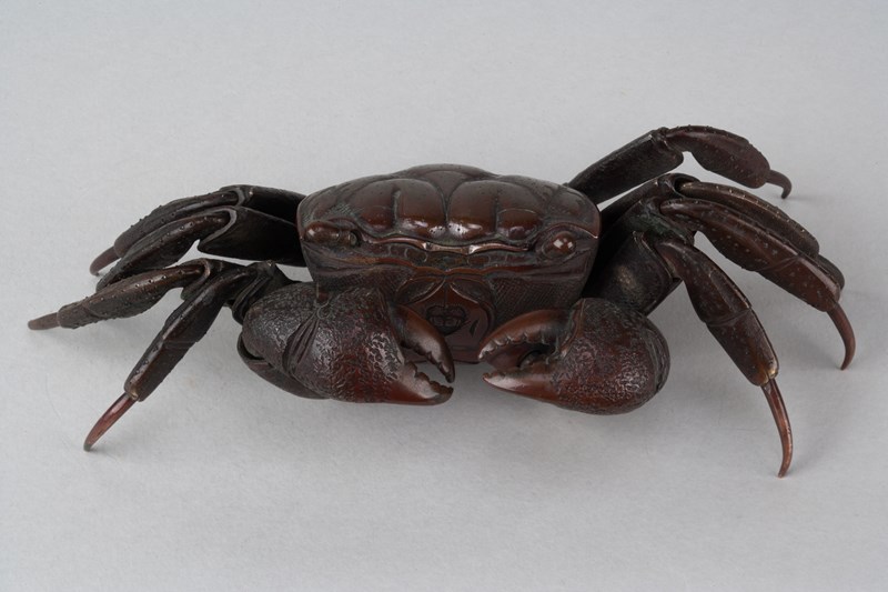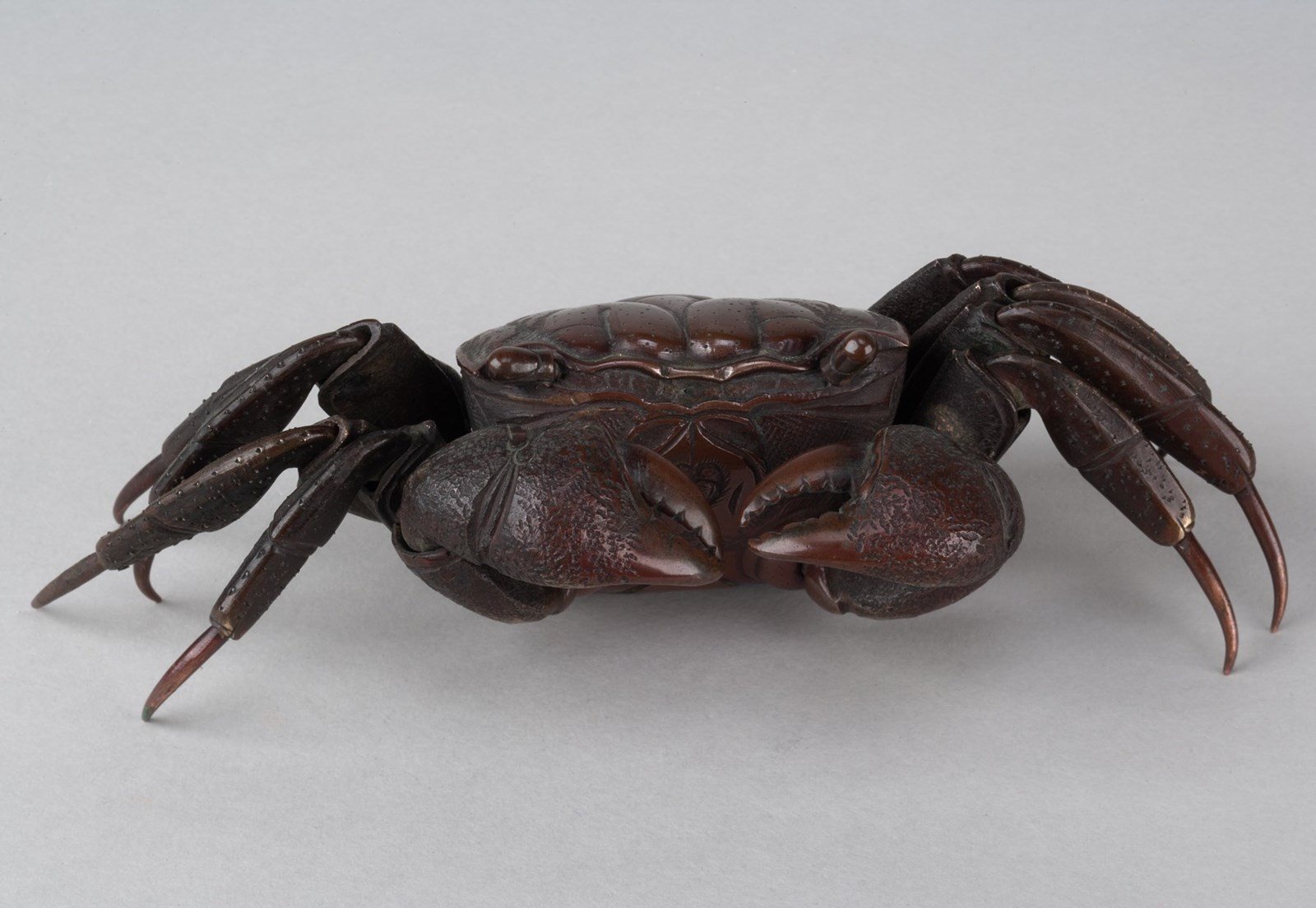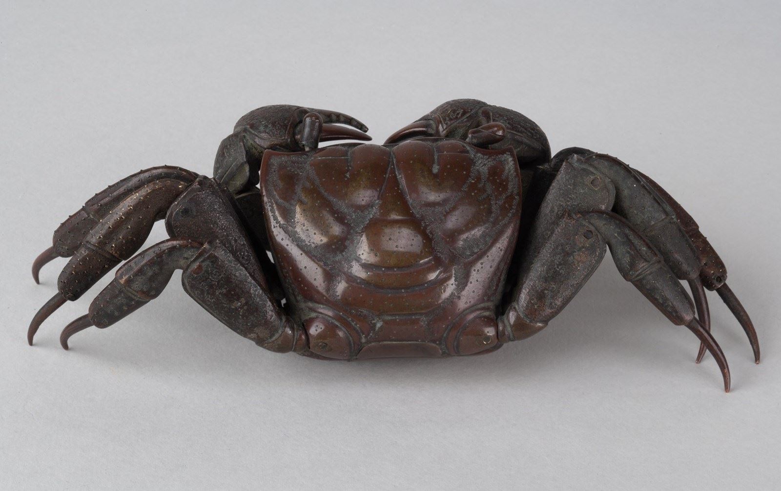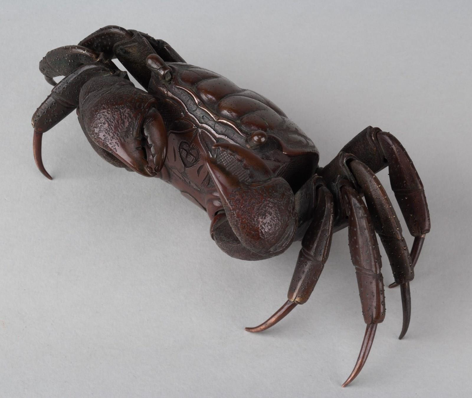 A Meiji period (1868-1912) articulated bronze model of a crab, 32 movable parts emanating from the body of the crab, all meticulously and thereby realistically finished.