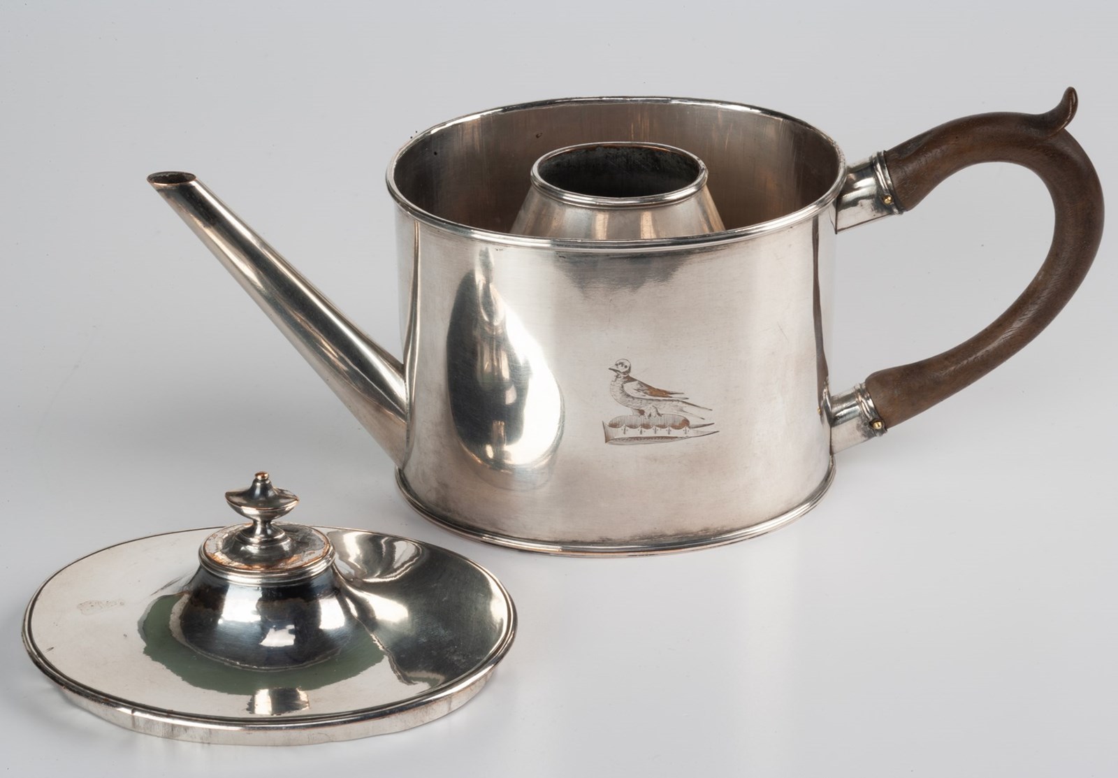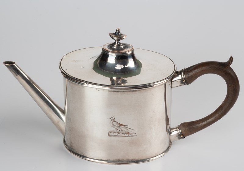 An early example of an Old Sheffield Plate Argyle with a central cone to fill with boiling water in an effort to keep the gravy hot. As plain in design as the fashion of the time would allow, save for the engraving on one side of a family crest taking for its design a martlet on a chapeau, for the family of Arundel, Arundell,Blage, Blake, Cardiffe, Duperon, Eland, Eyland, Fyske, Heyland, How, Lawson, Mell, Monkton,Overton,..........or Proctor.