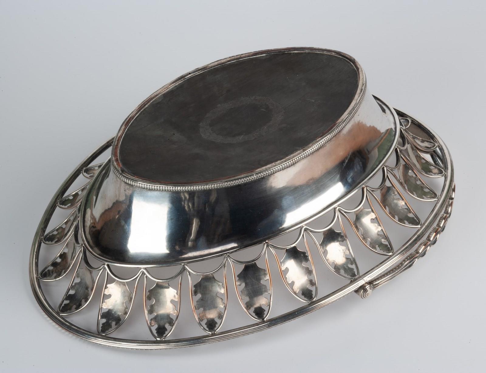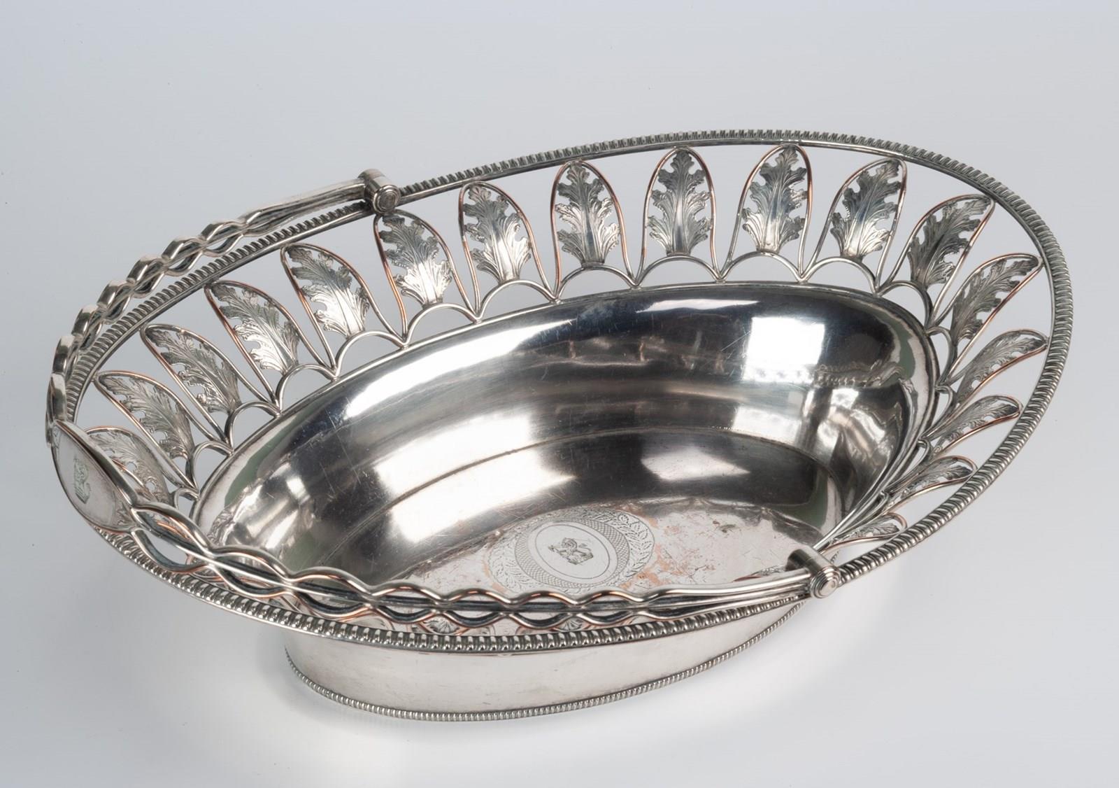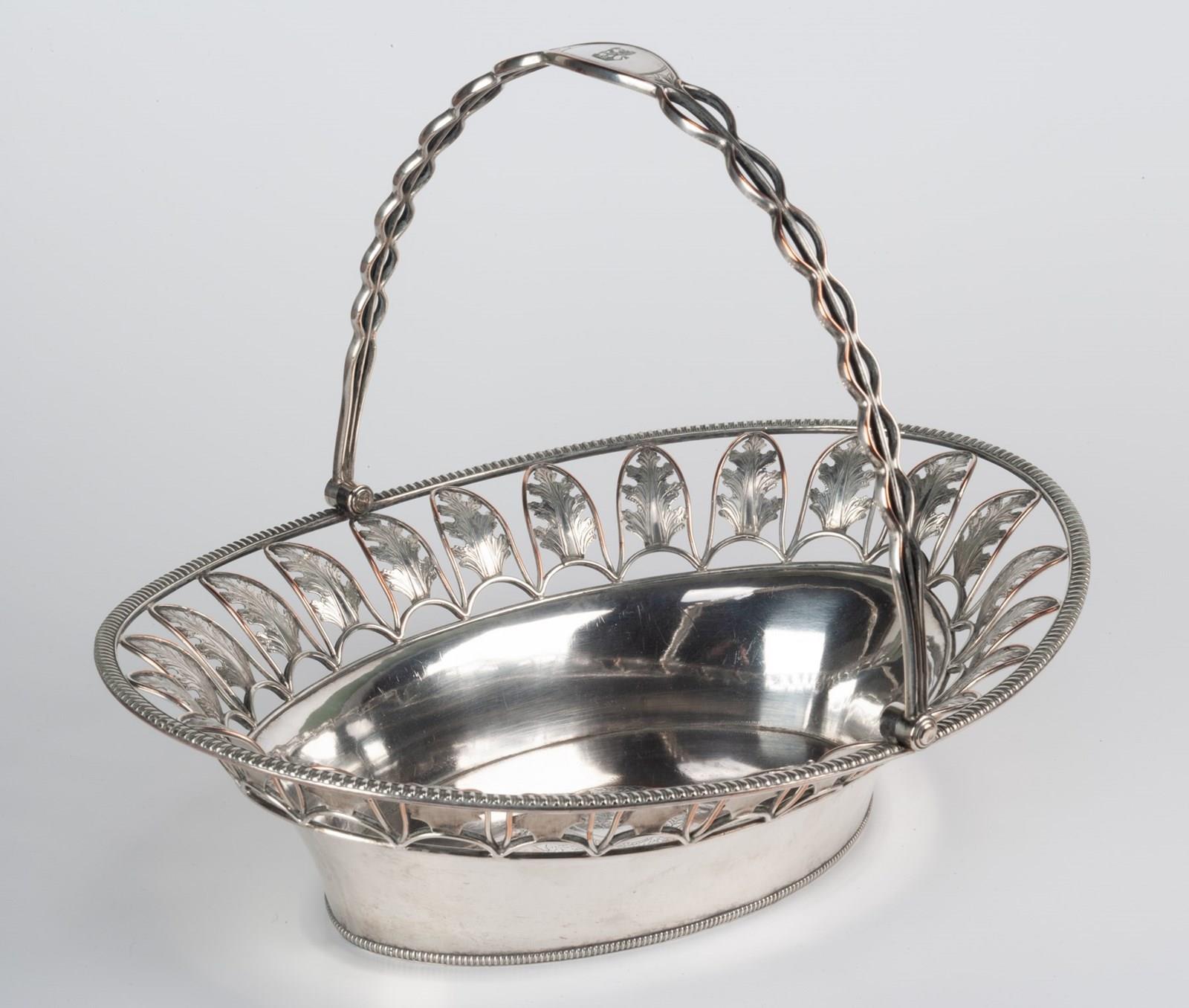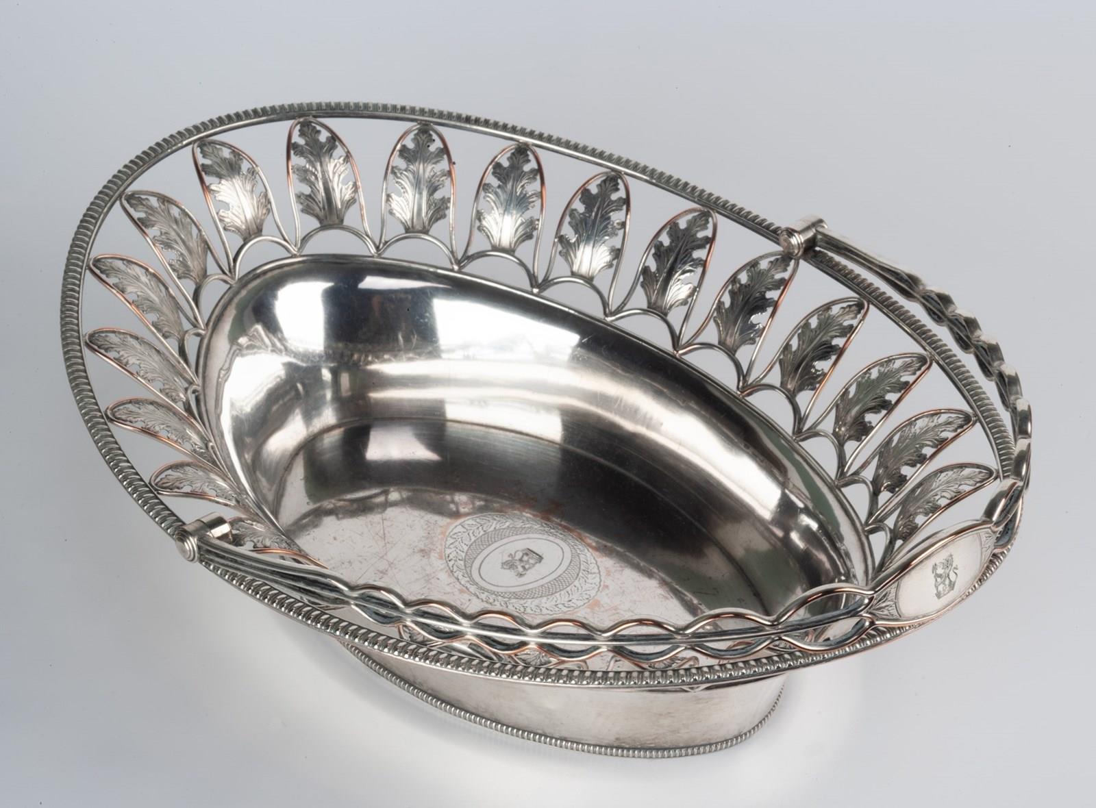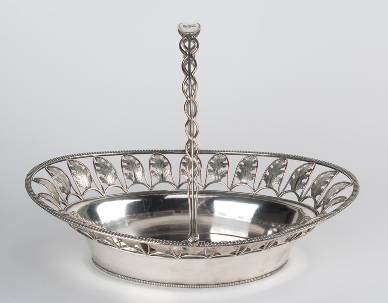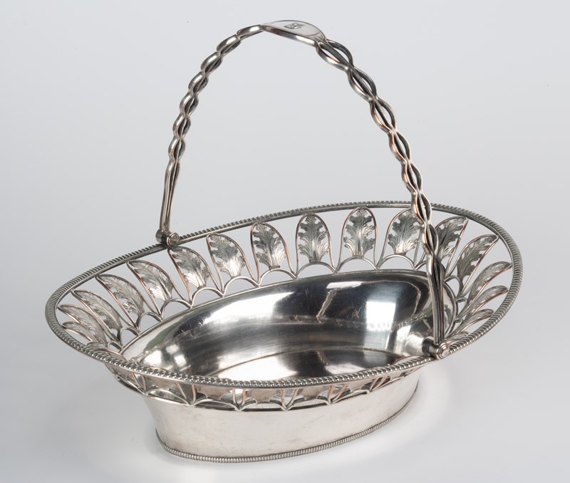 The base of the basket and a cartouche set in the swing handle engraved with the crest of a Demi Lion out of a Mural Crown with a Pole-Axe: Hanbury, Leigh-Hanbury, Wildman, Williams.