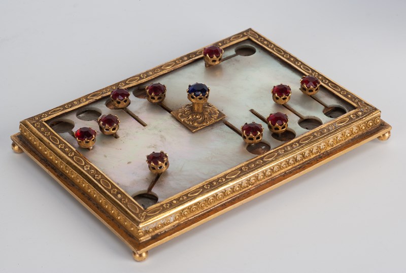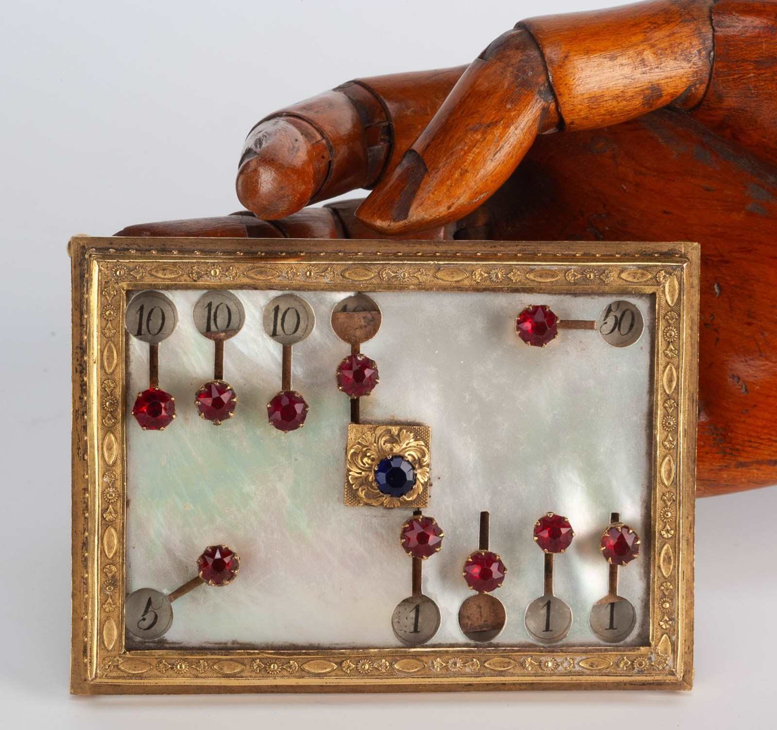 A fine Charles X ormolu and mother-o-pearl counter or marker for the French game of Piquet, the fine quality and combination of mother-o-pearl mounted in a decorated ormolu frame tells of its Palais Royal, Paris, origins.