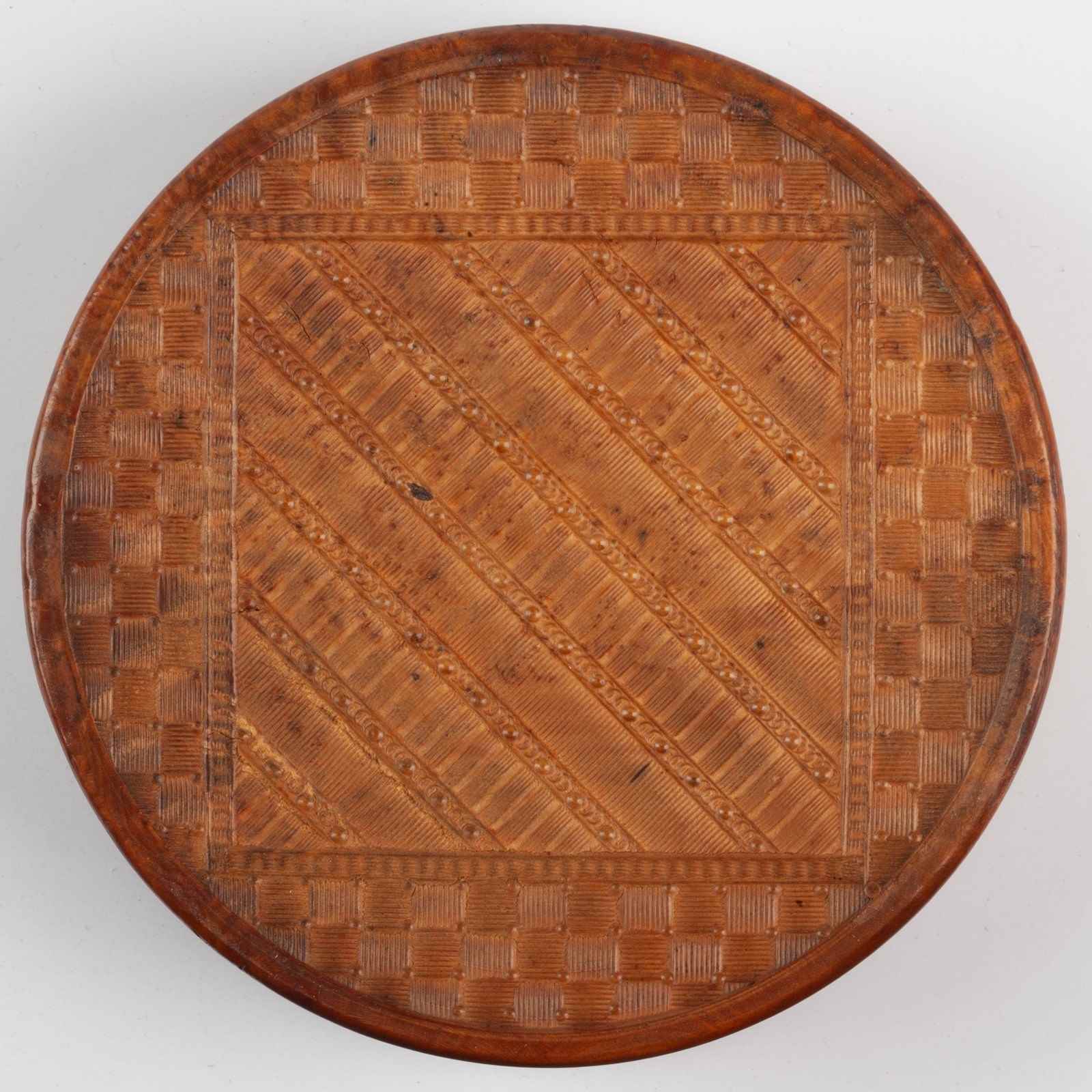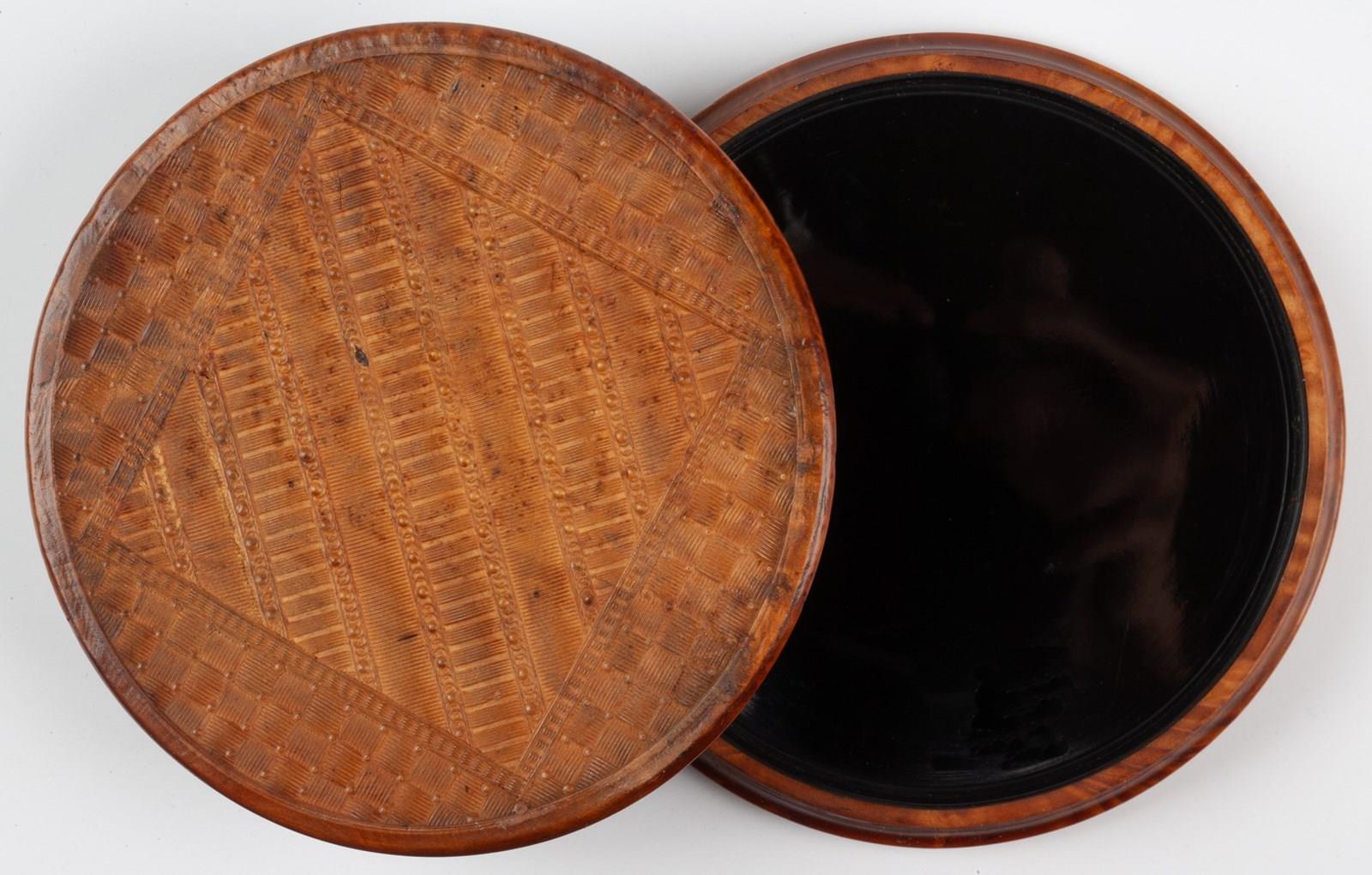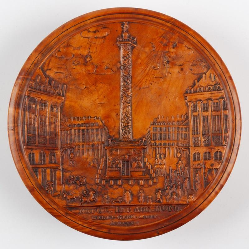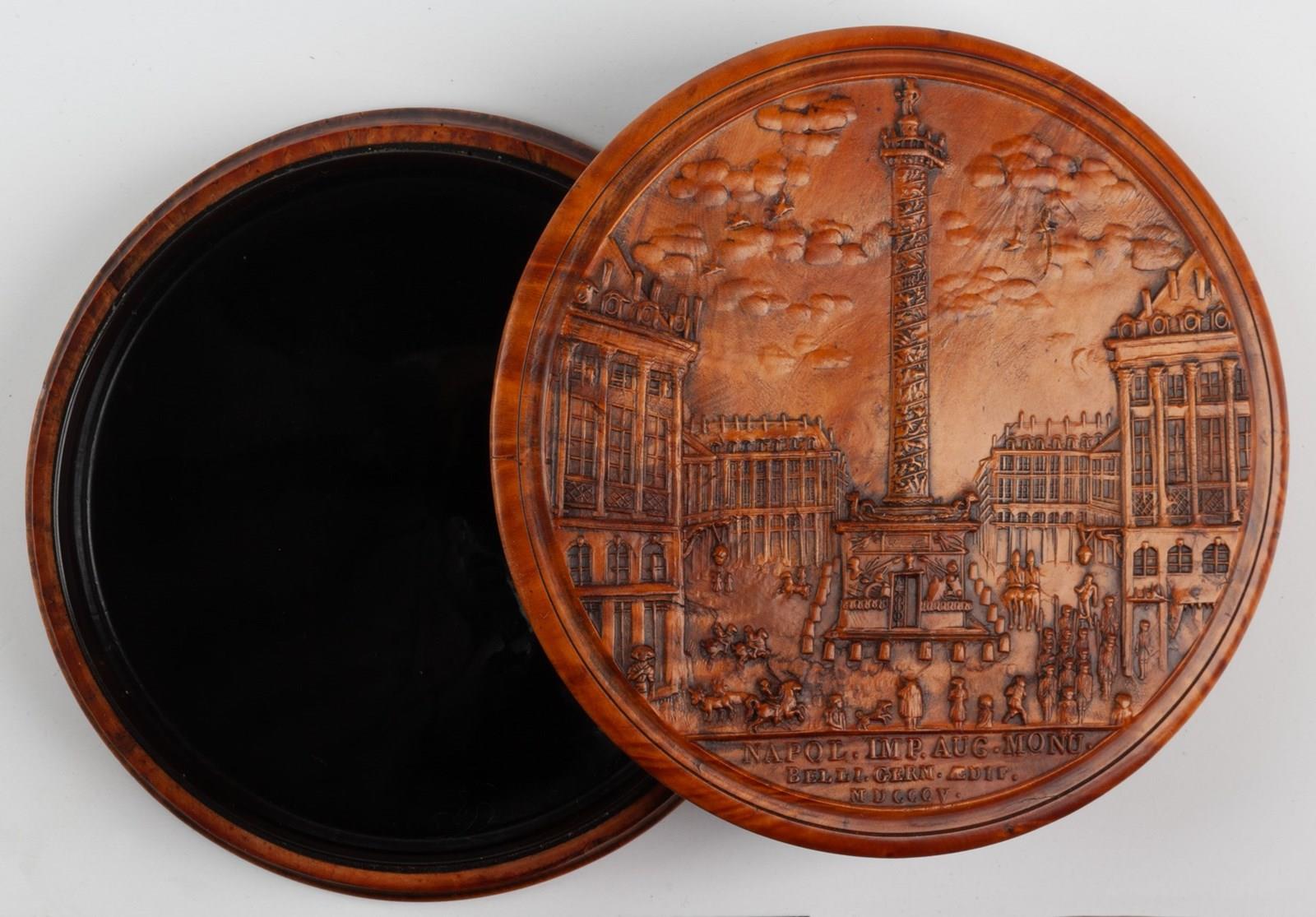 A fine French snuffbox made of pressed maple or birch with a tortoiseshell lining; the detail magnificent. Titled beneath the scene NAPOL.IMP. AUG. MONU. MDCCCV.