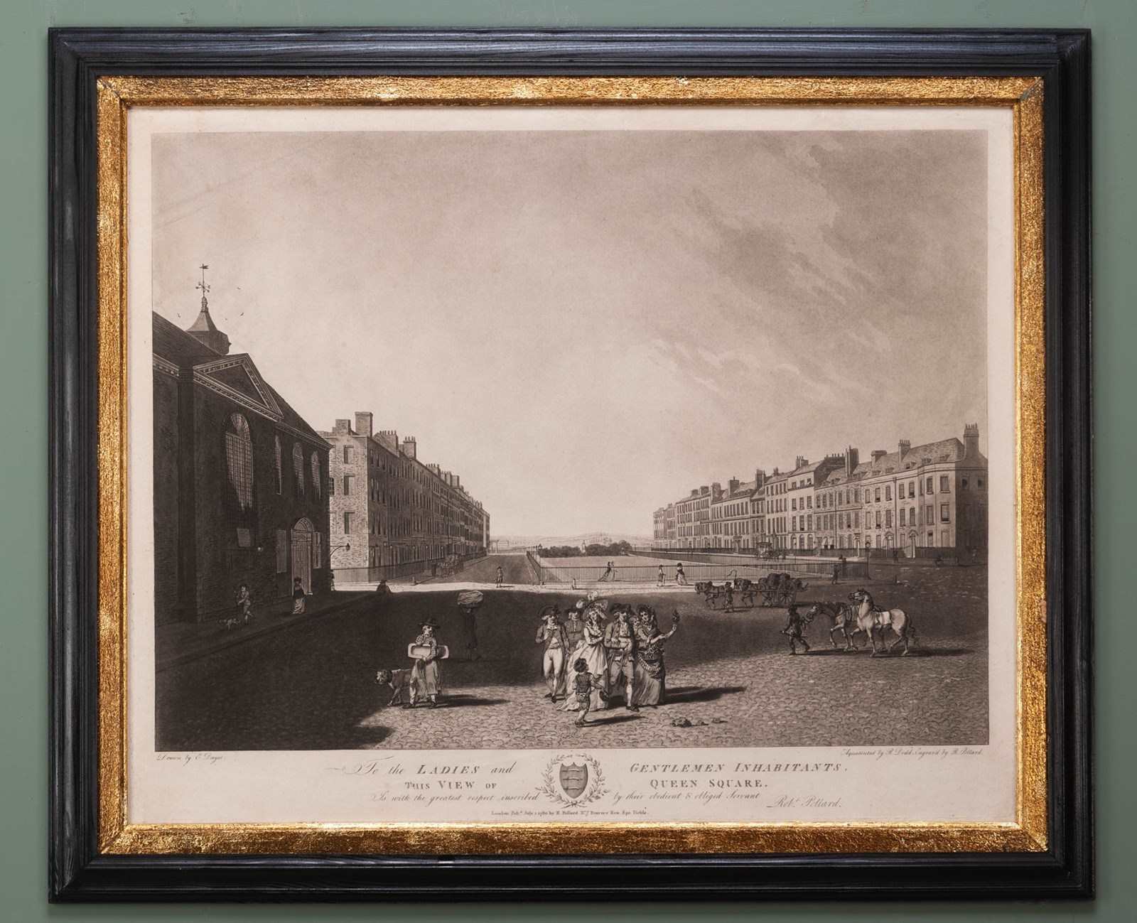 A fine print, aquatinted by Robert Dodd and engraved by Robert Pollard, after the original work by Edward Dayes; This View of Queen Square, published by Pollard in July of 1789.