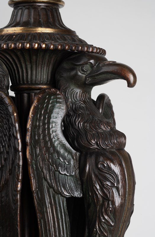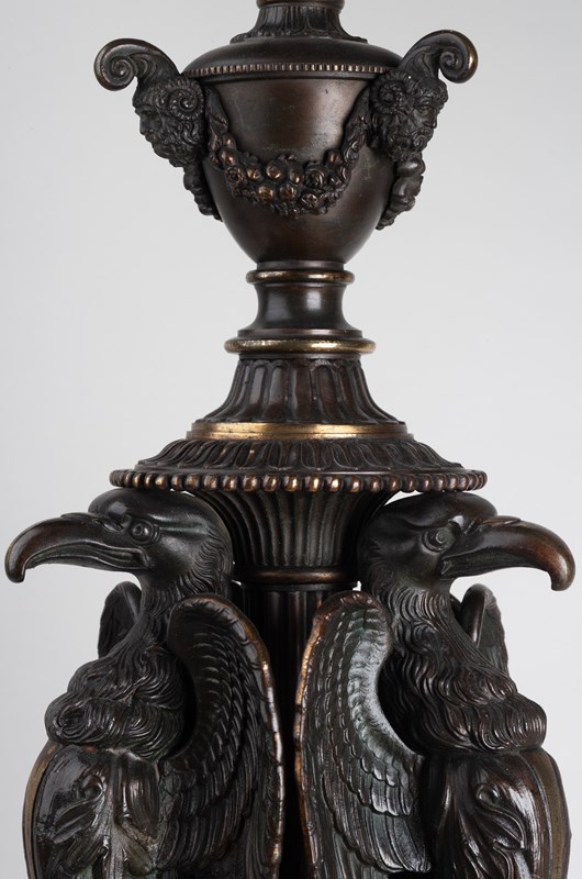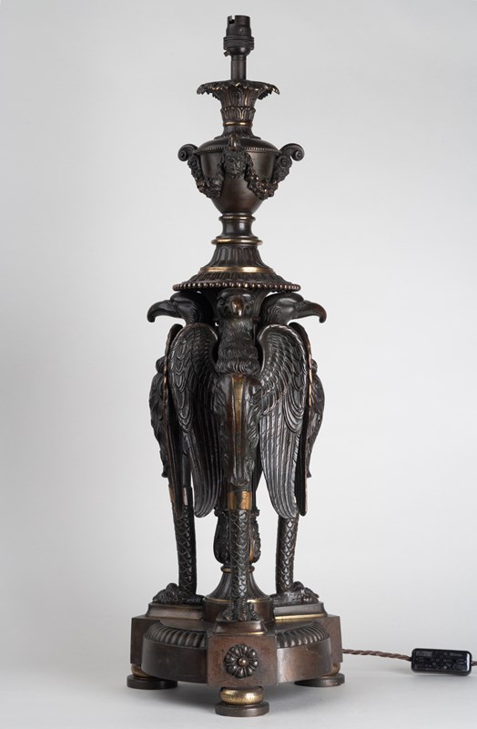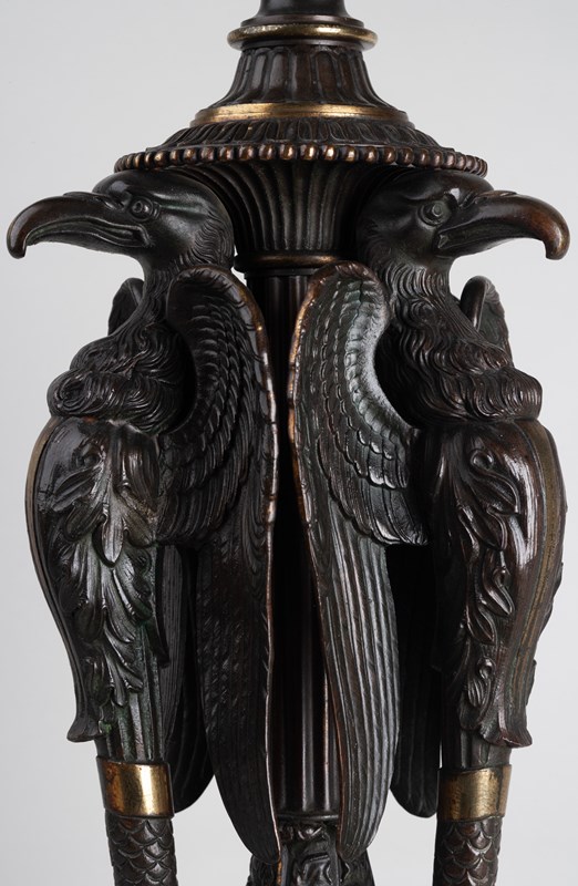 Three eagle monopodia support a vase with three classical Greek heads between swags of plentiful fruit; likely that this in turn would have supported a colza lamp fitting.