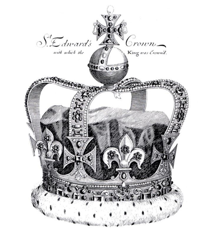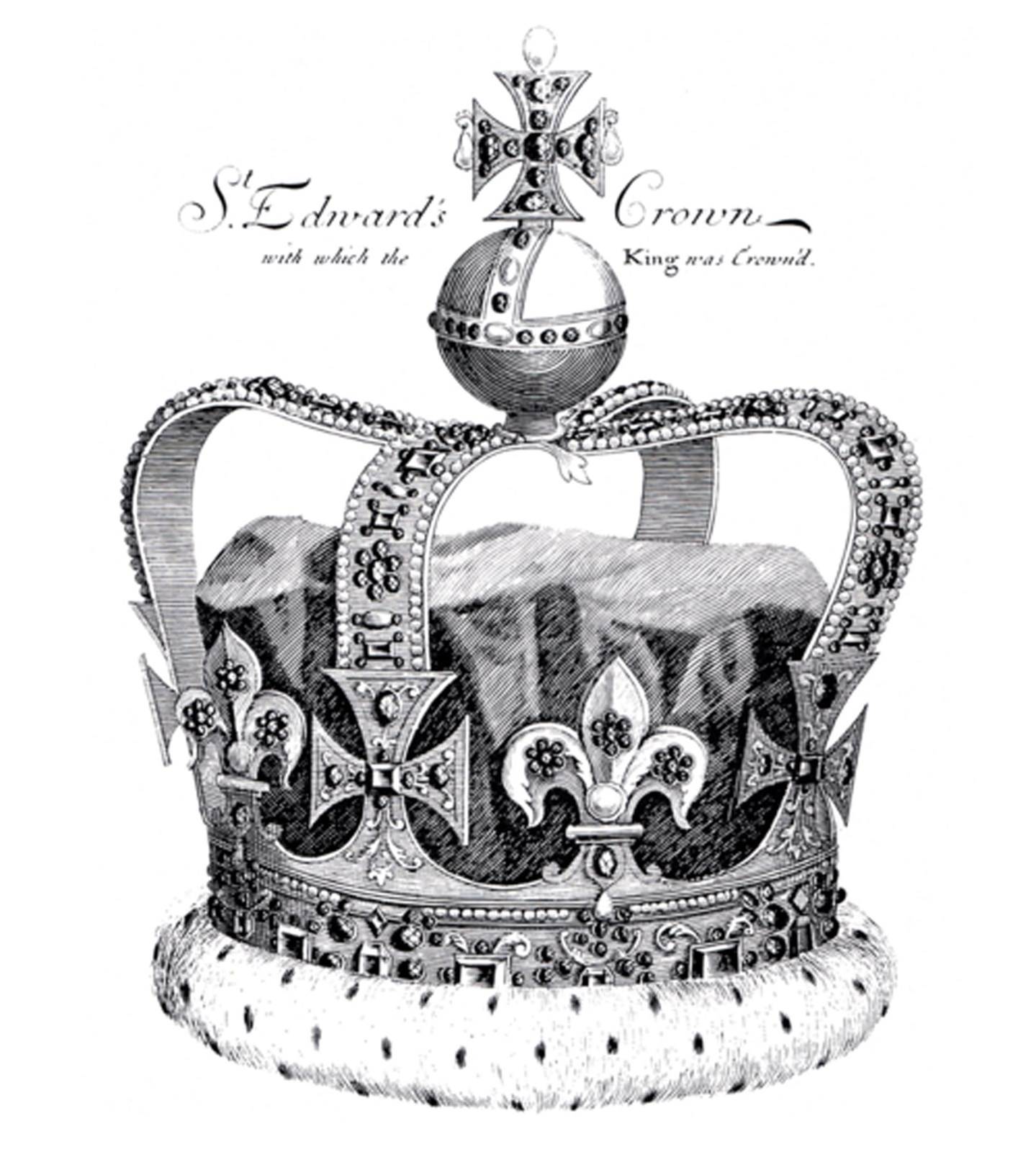 The decorative band around the flared top is cast with three cabochon stones interspersed with diamonds and the cross that surmounts the St. Edward's Crown, restored in 1660 for the coronation of Charles II. The swagged trellis around the body is topped alternatively with three beads, perhaps referencing the fleur de lys of this crown, and five beads, the four jewelled arms of the cross with the further stone at its centre.
