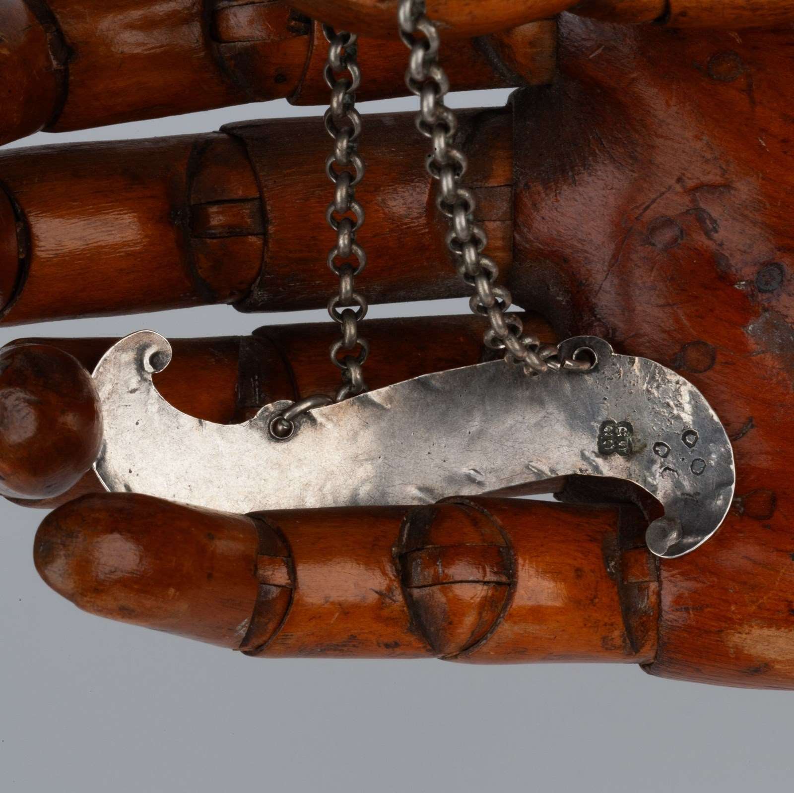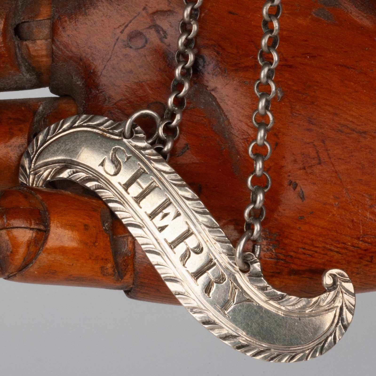 A fine, early Victorian silver wine label or bottle ticket in the form of a stylised banner with a gadrooned edge.